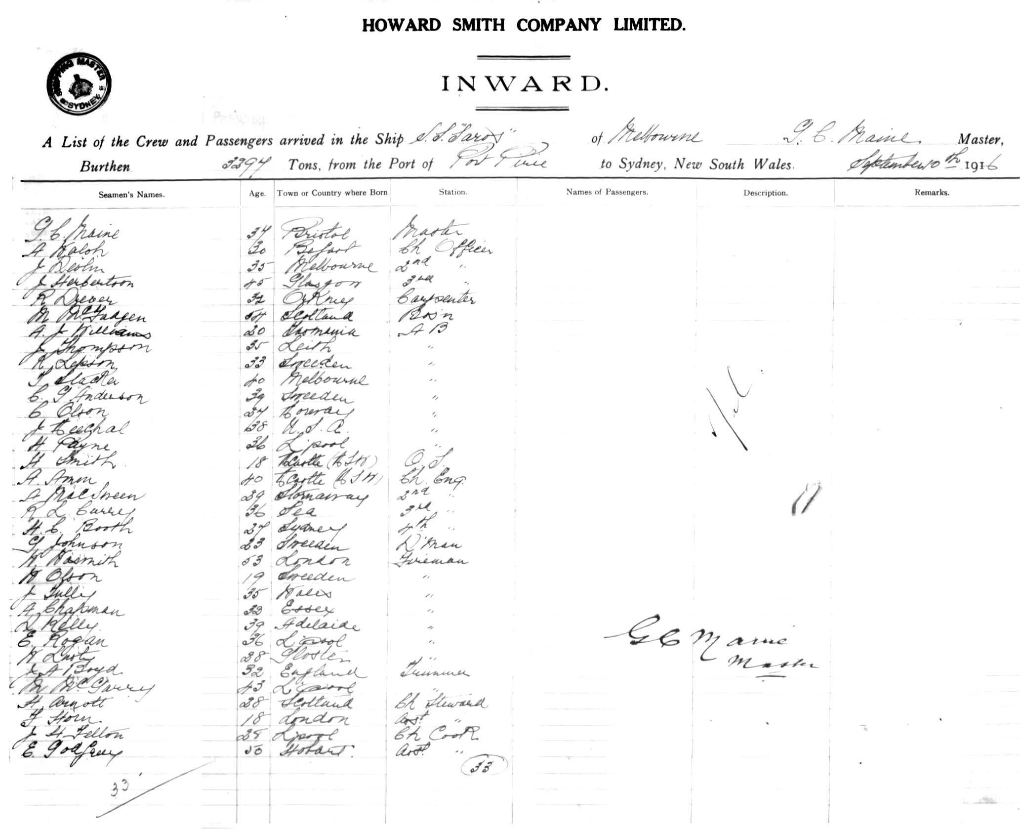Mariners and ships in Australian Waters | SAROSOF MELBOURNE, G. C. MAINE, MASTER, BURTHEN 3297 TONS FROM THE PORT OF PORT PIRIE TO SYDNEY, NEW SOUTH WALES, 10TH SEPTEMBER 1916 |
