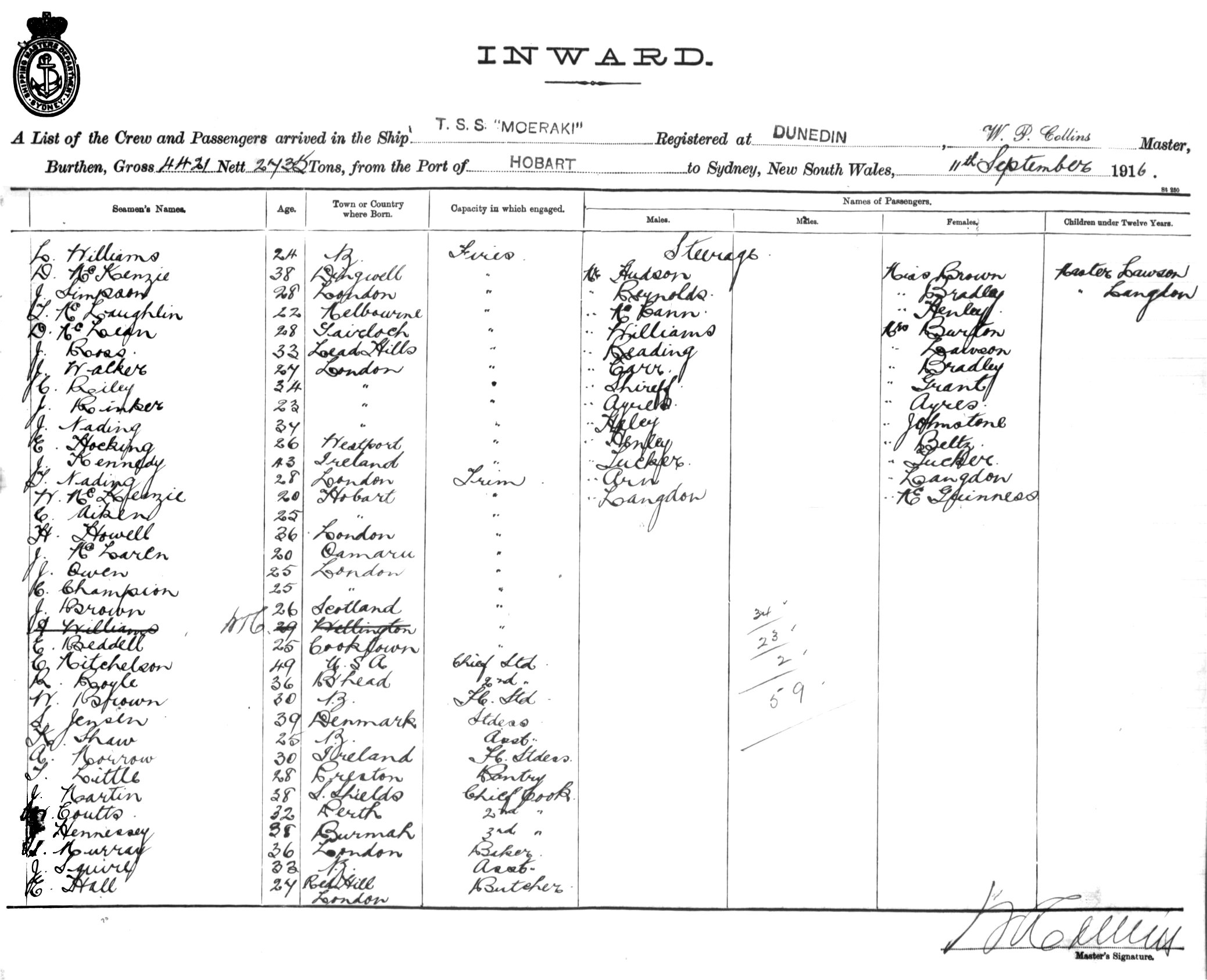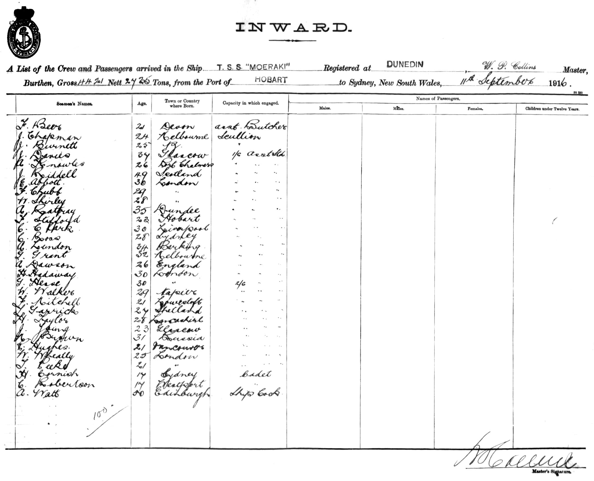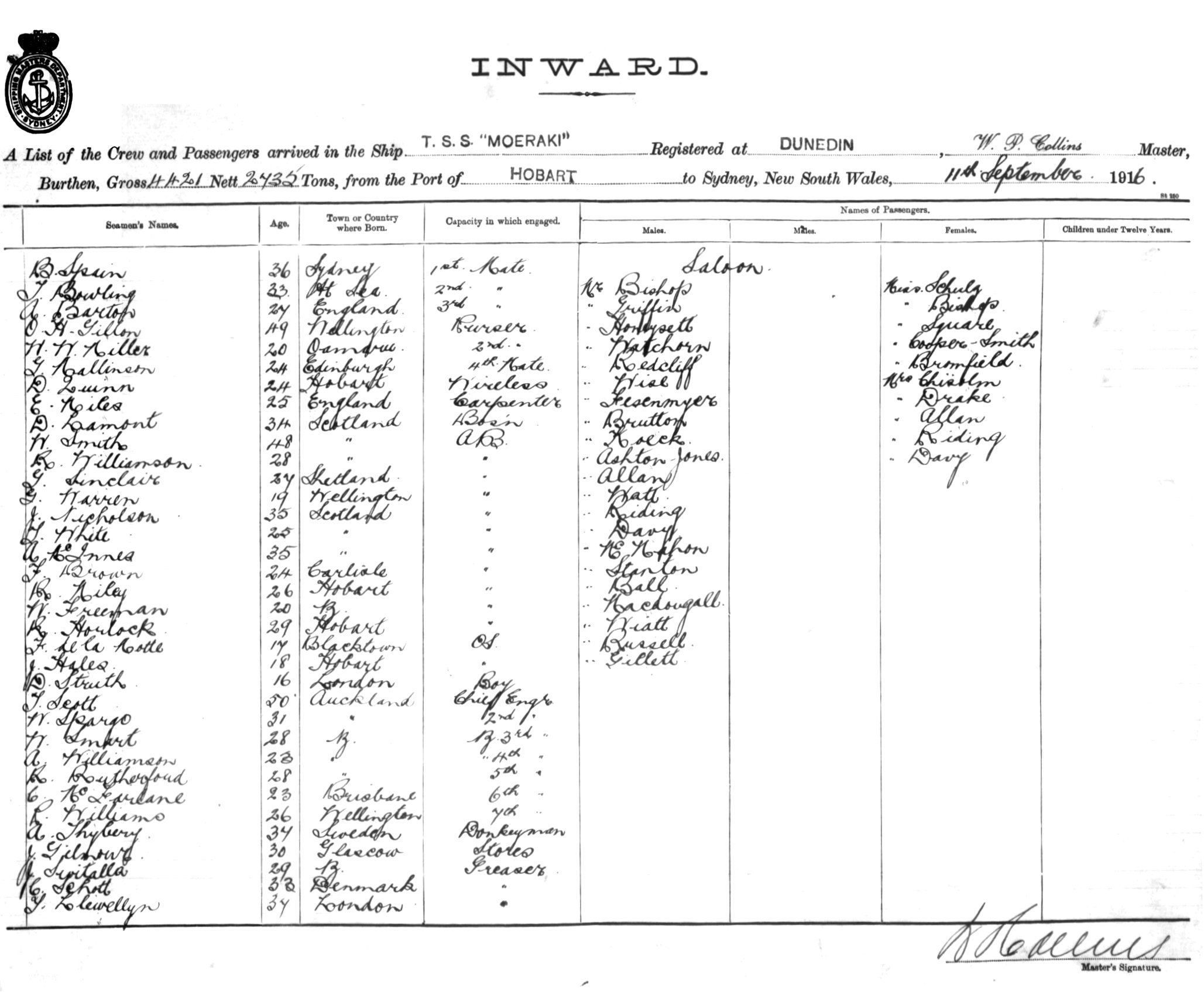 MOERAKIOF DUNEDIN, W. P. COLLINS, MASTER, BURTHEN 4421/2735 TONS FROM THE PORT OF HOBART TO SYDNEY, NEW SOUTH WALES, 11TH SEPTEMBER 1916 |