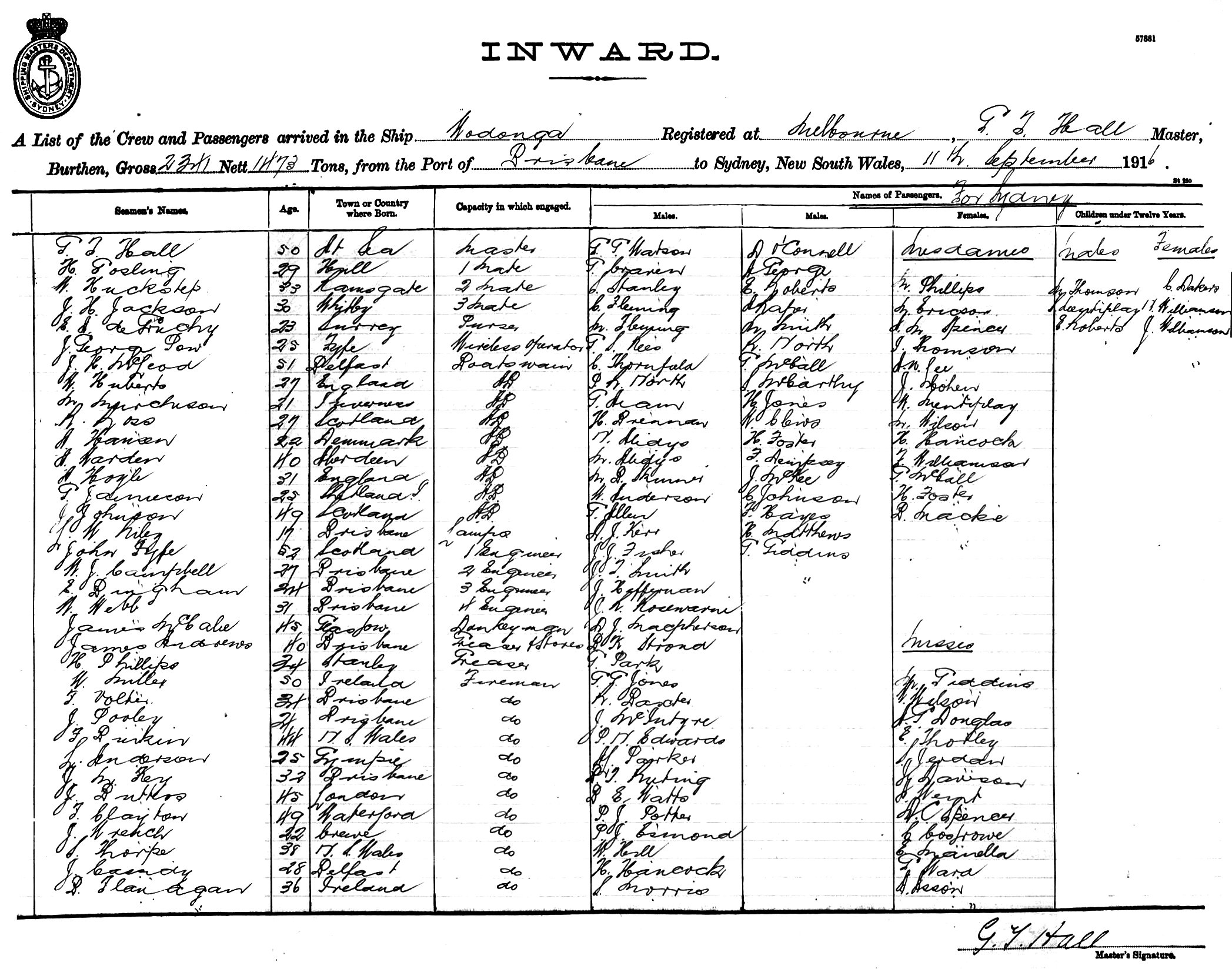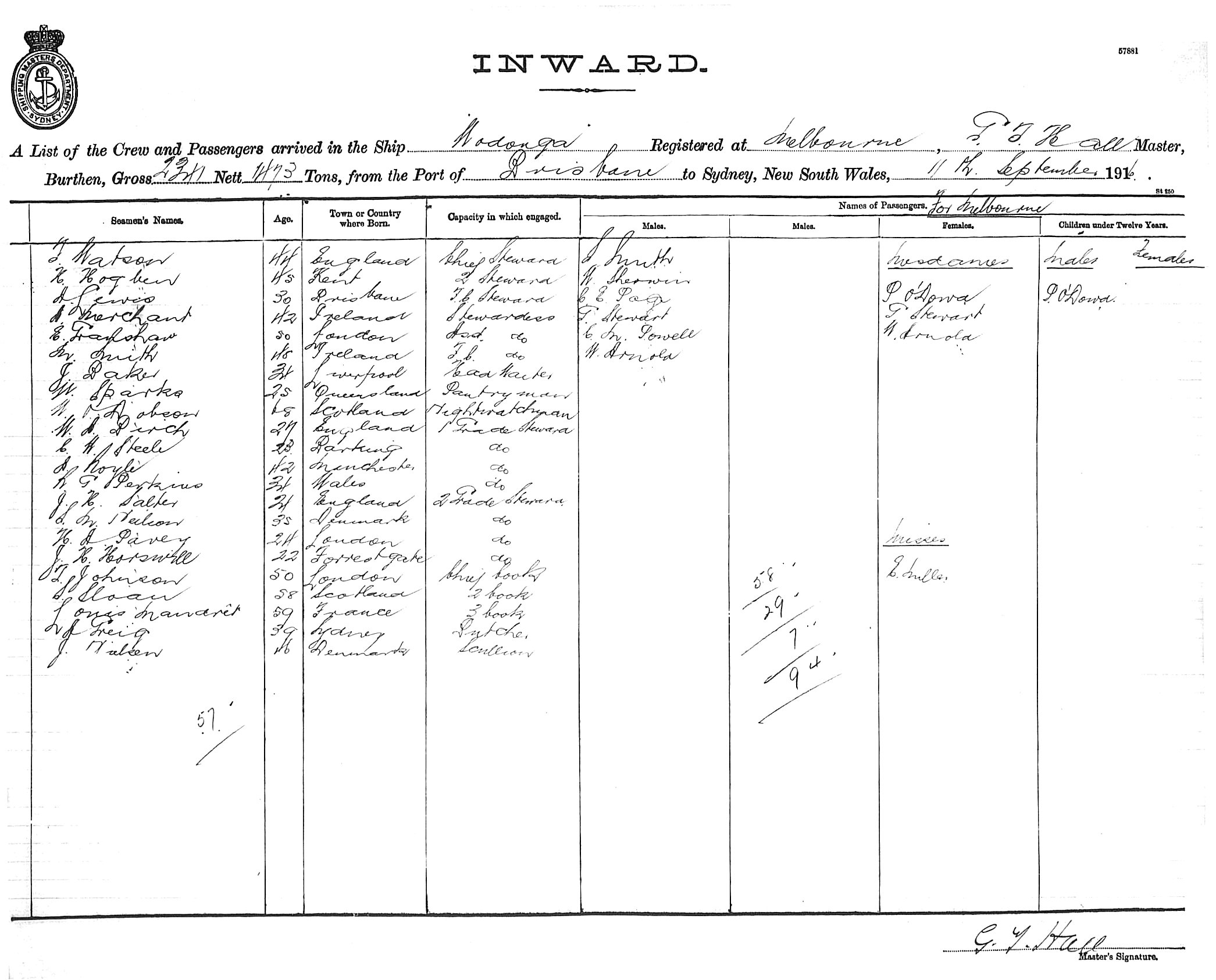 WODONGAOF MELBOURNE, G. T. HALL, MASTER, BURTHEN 2341/1473 TONS FROM THE PORT OF BRISBANE TO SYDNEY, NEW SOUTH WALES, 11TH SEPTEMBER 1916 |