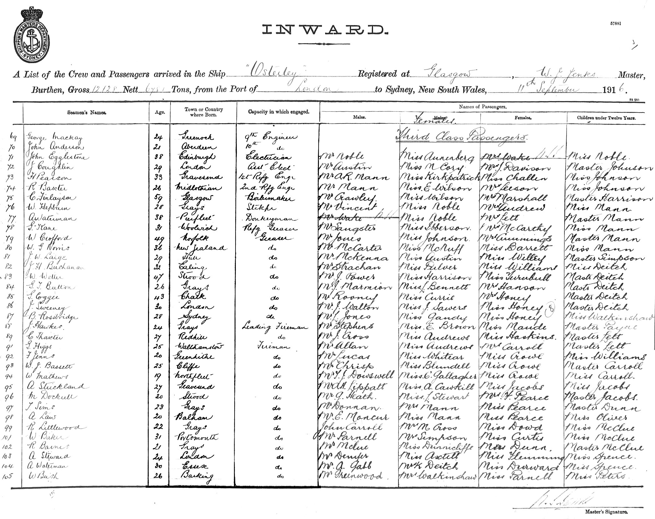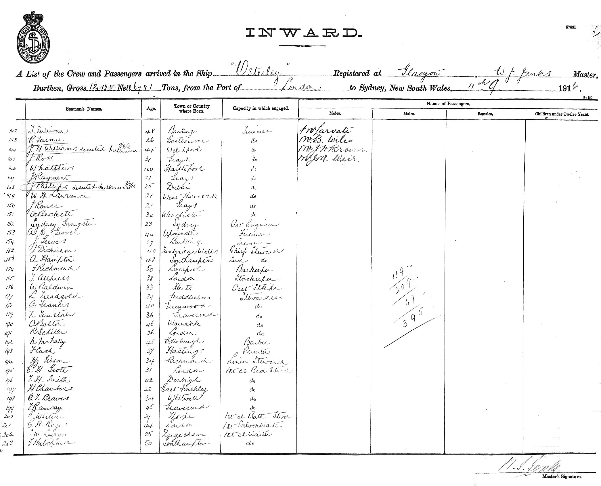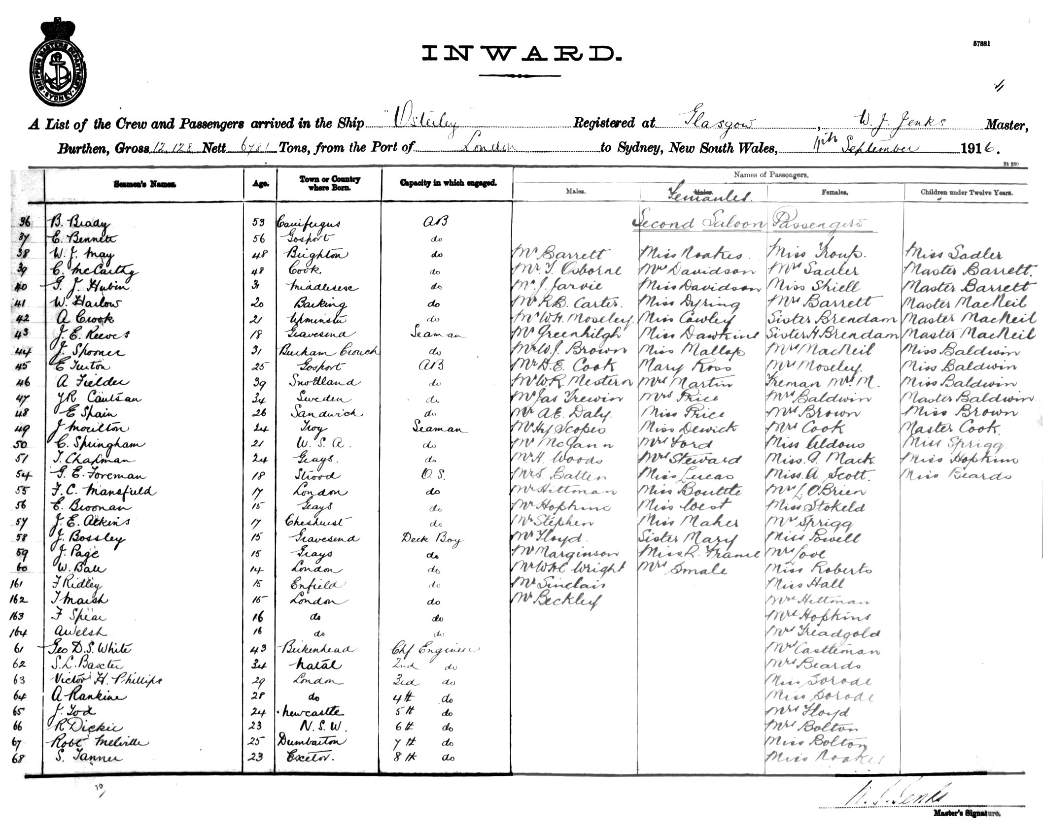 Source: State Records Authority of New South Wales: Shipping Master's Office; Passengers Arriving 1855 - 1922; NRS13278, [X415] reel 2094. Transcribed by Barry Collin. Proofread by Lyn & Maurie.
