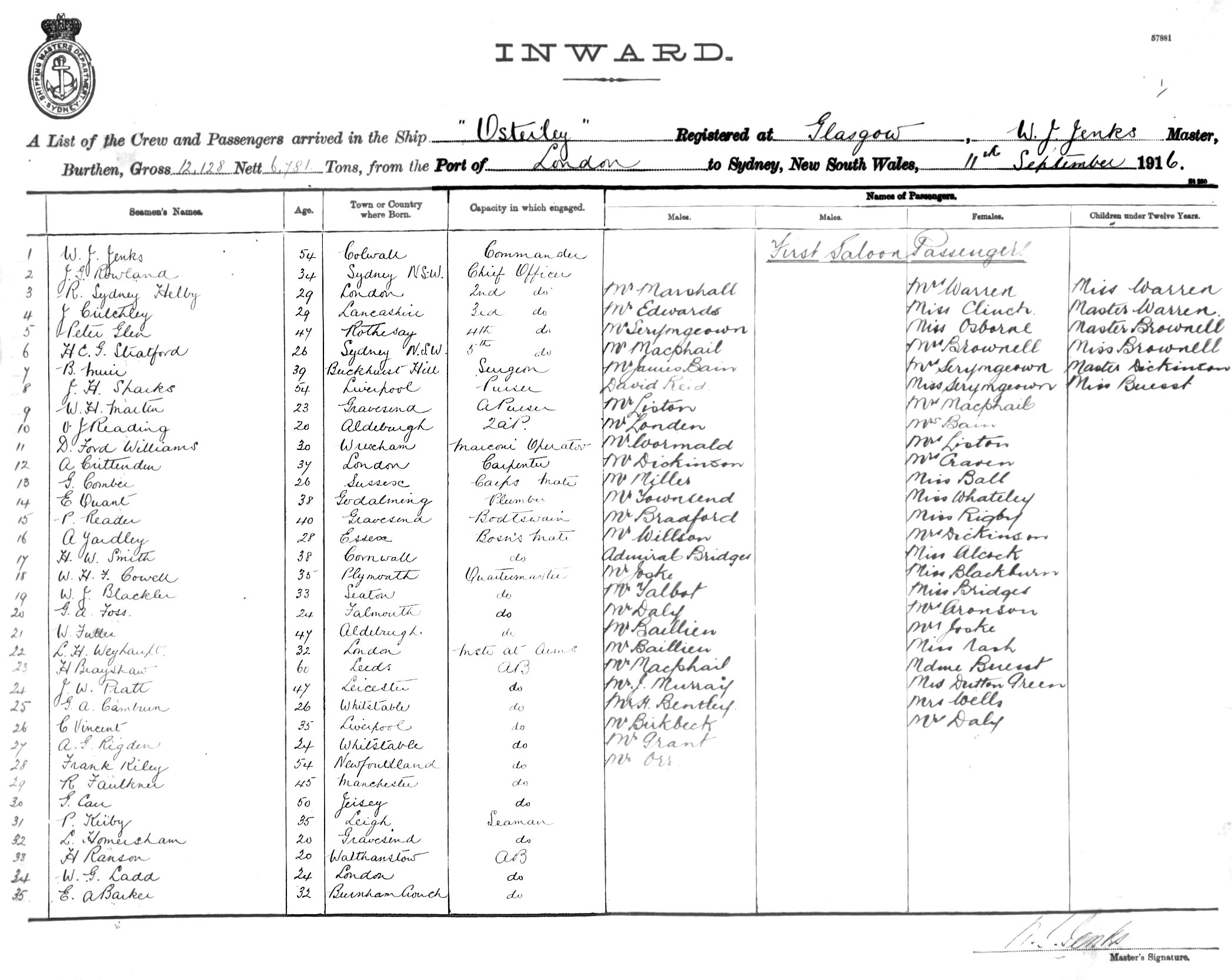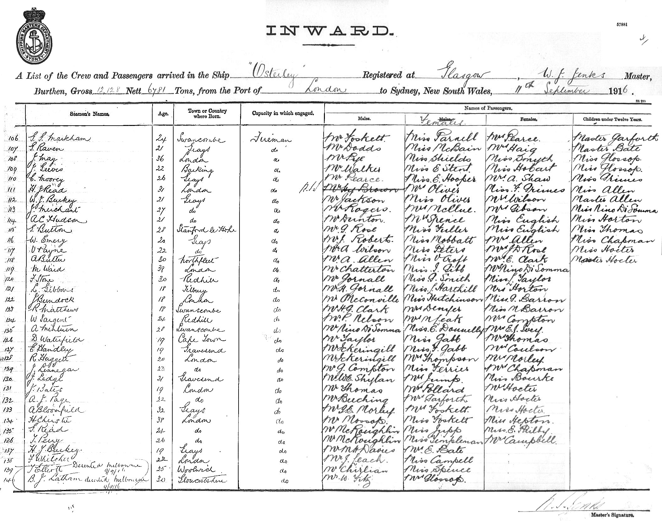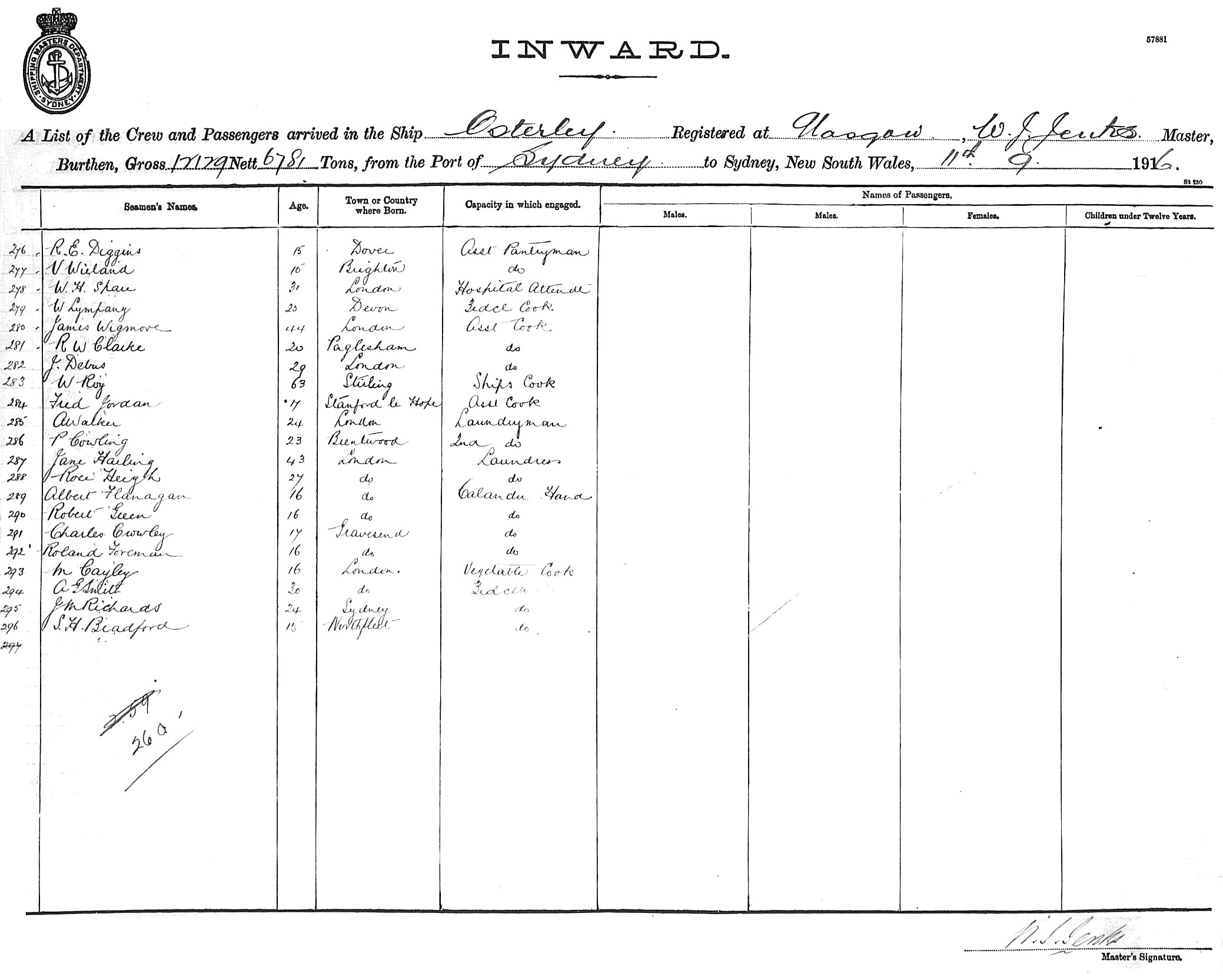 Source: State Records Authority of New South Wales: Shipping Master's Office; Passengers Arriving 1855 - 1922; NRS13278, [X415] reel 2094. Transcribed by Barry Collin. Proofread by Lyn & Maurie.