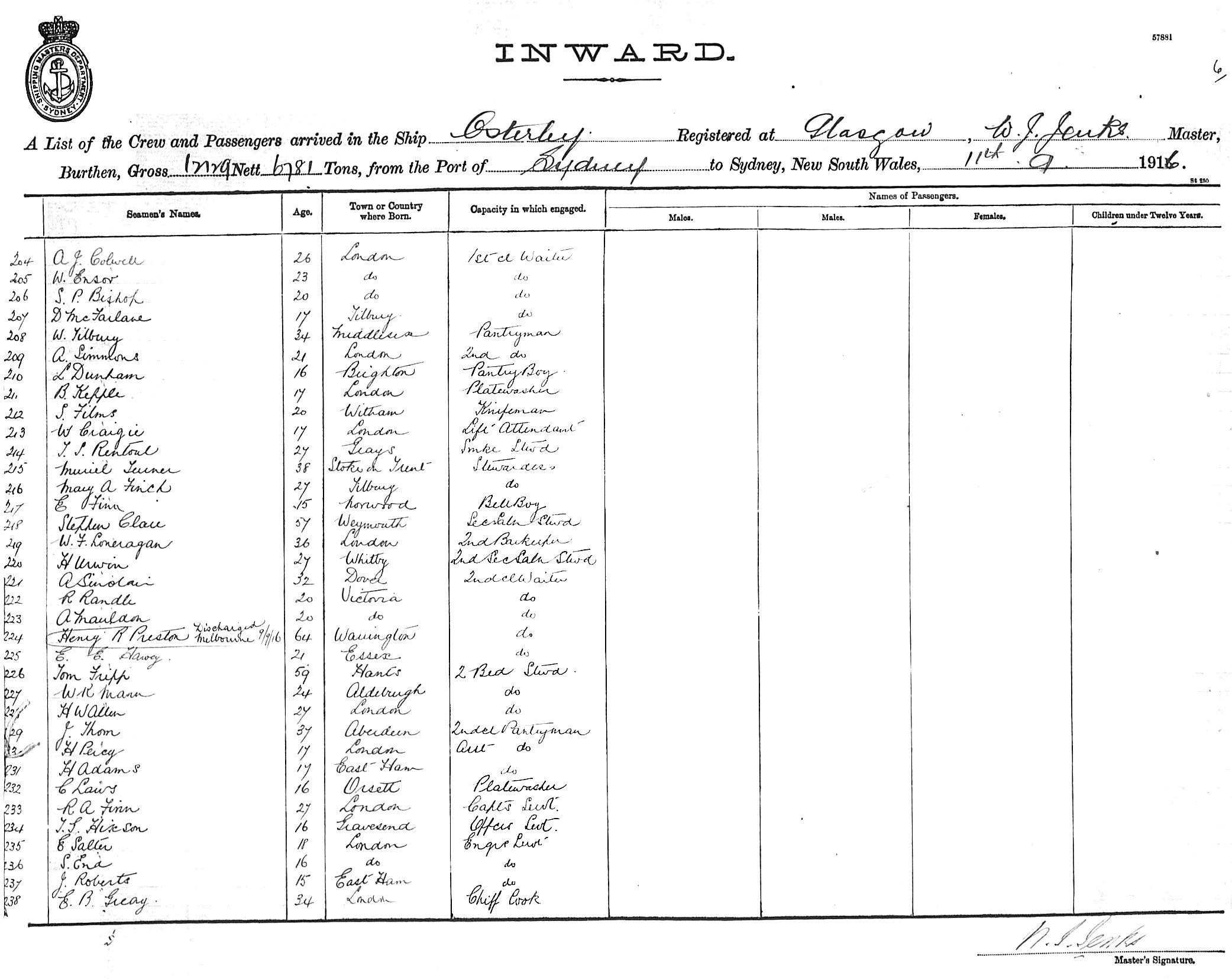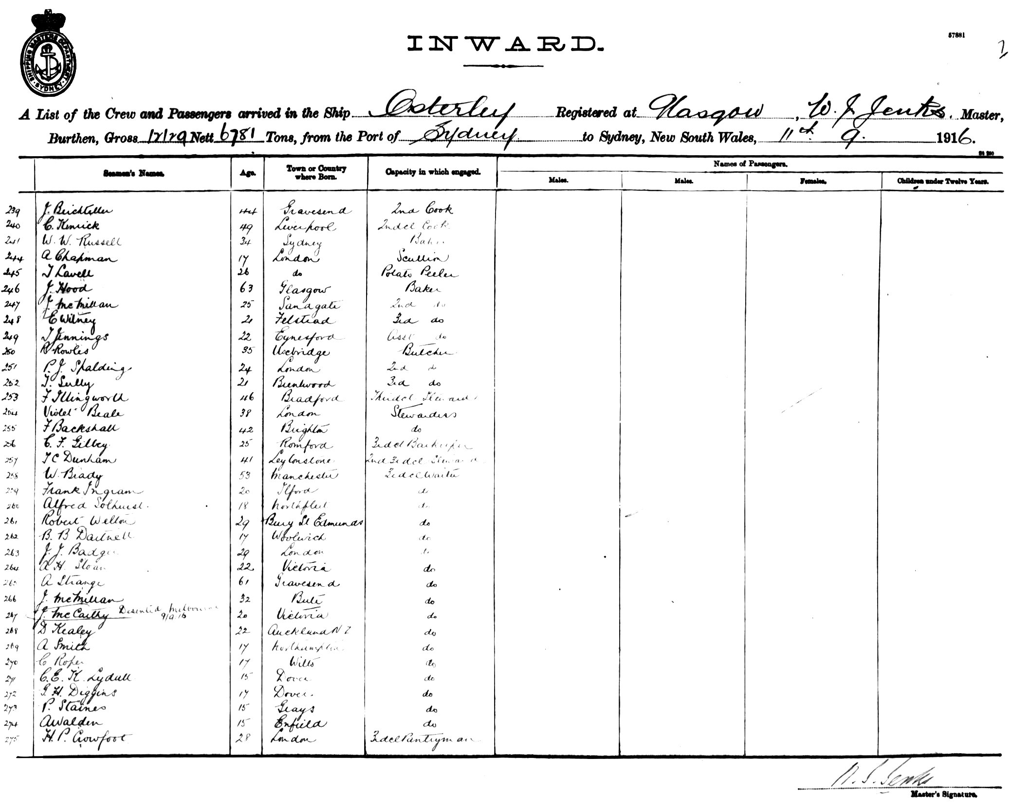 OF GLASGOW, W. J. JENKS, MASTER, BURTHEN 12128/6781 TONS FROM THE PORT OF LONDON TO SYDNEY, NEW SOUTH WALES, 11TH SEPTEMBER 1916