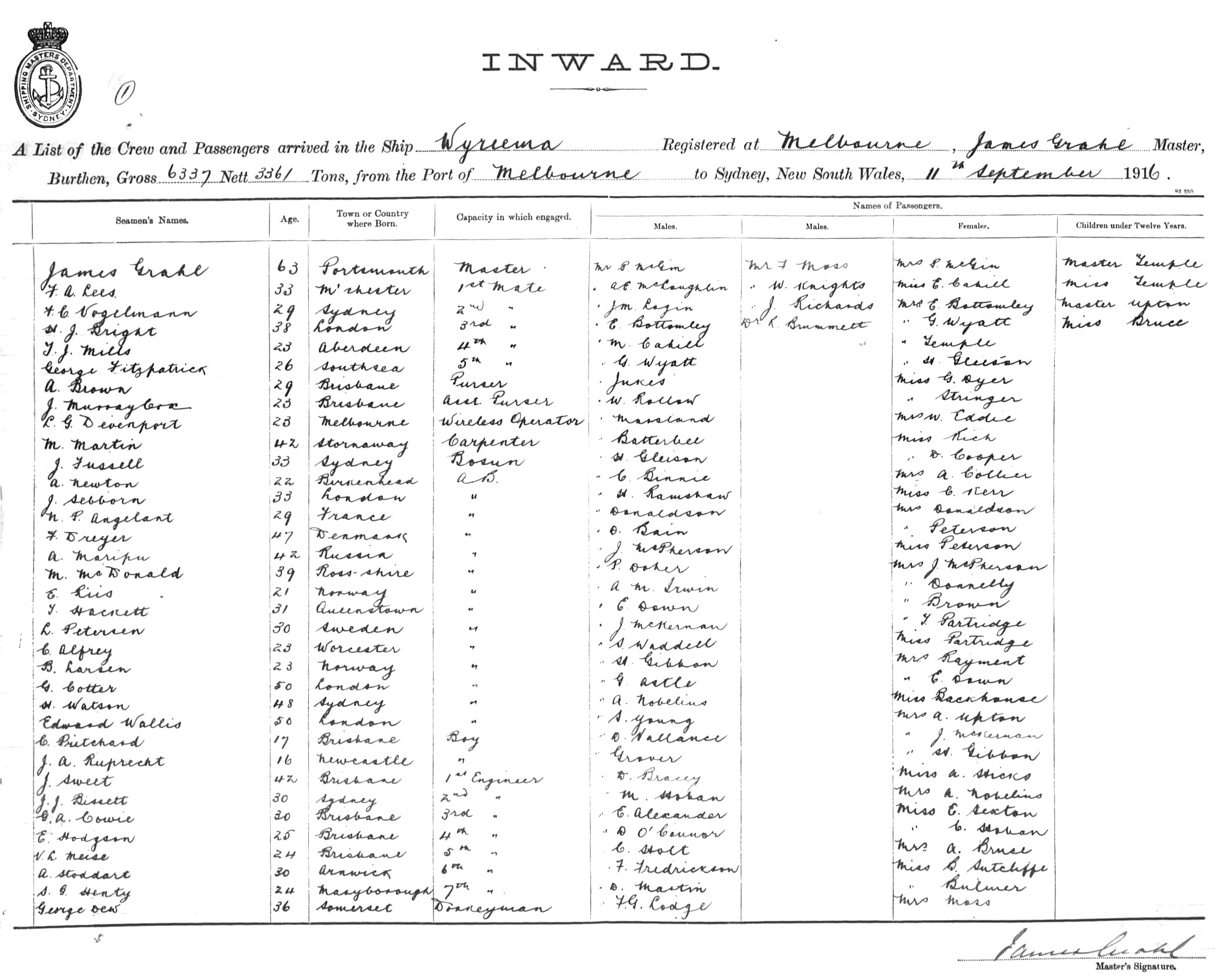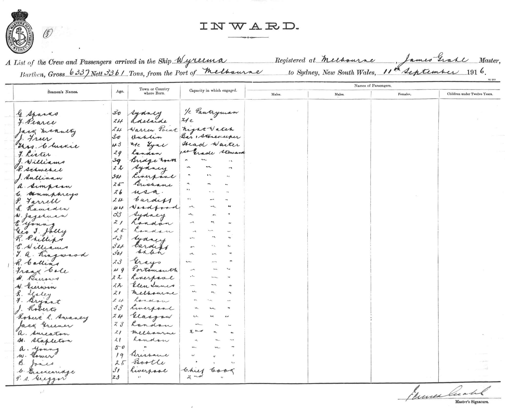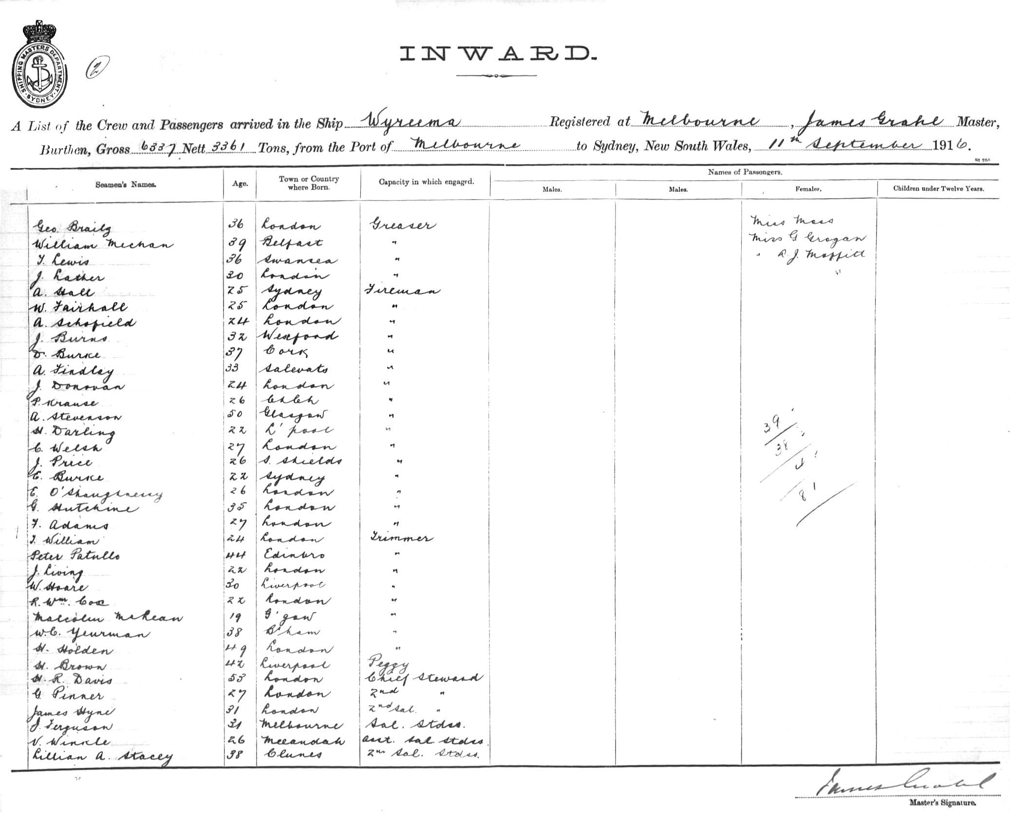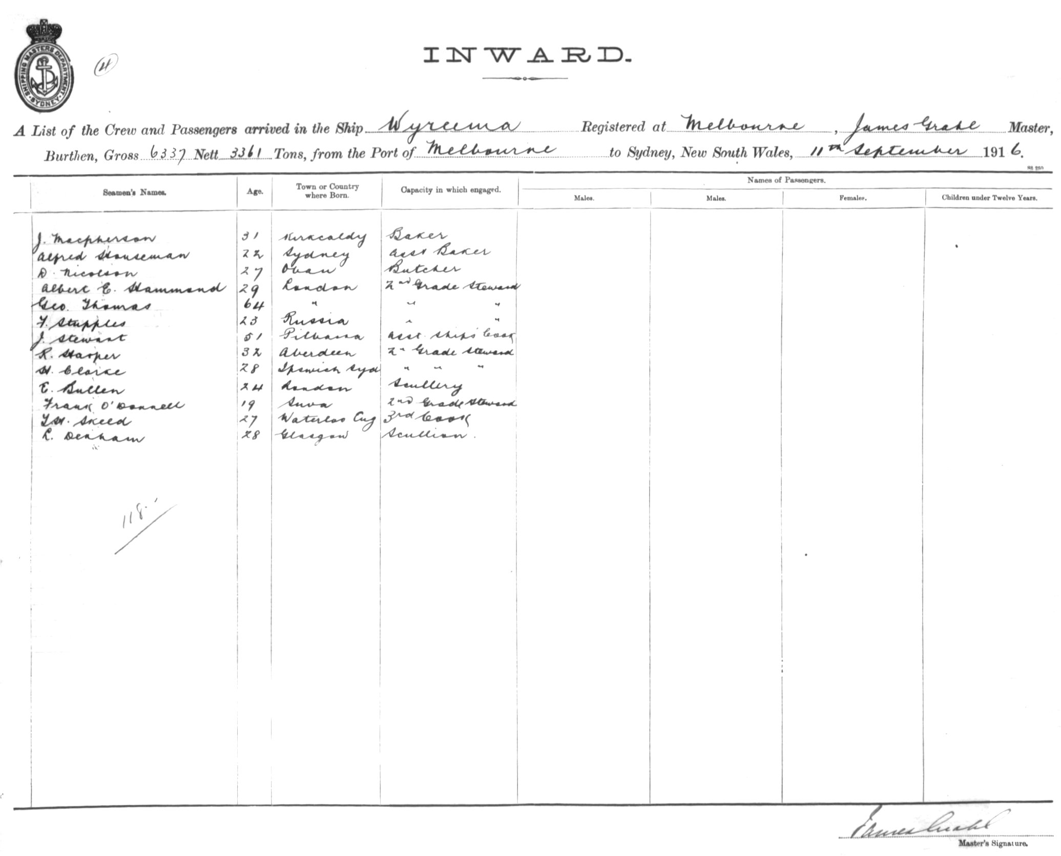 WYREEMAOF MELBOURNE, JAMES GRAHL, MASTER, BURTHEN 6337/3361 TONS FROM THE PORT OF MELBOURNE TO SYDNEY, NEW SOUTH WALES, 11TH SEPTEMBER 1916 |