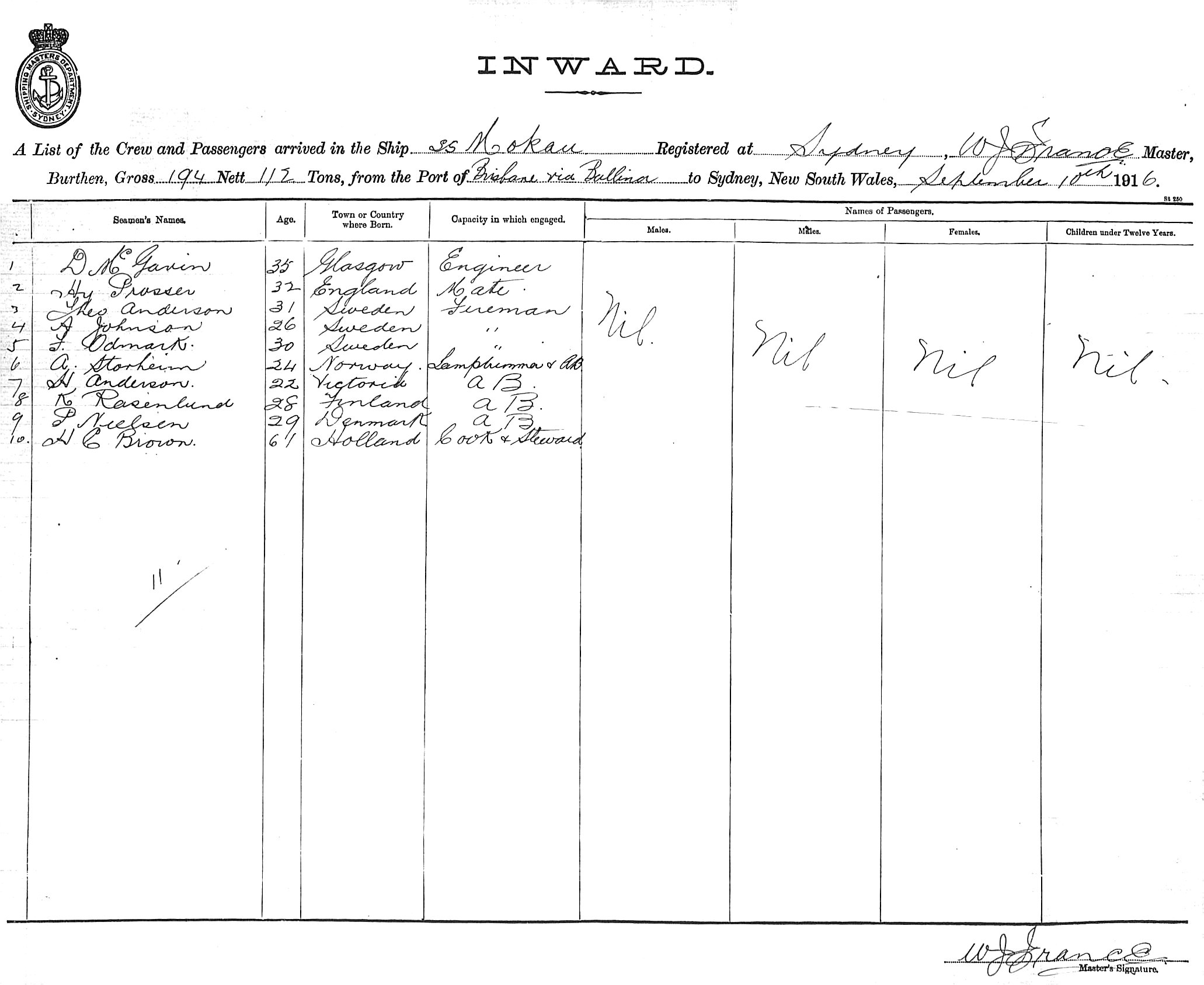 MOKAUOF SYDNEY, W.J. FRANCE, MASTER, BURTHEN 194/112 TONS FROM THE PORT OF BRISBANE VIA BALLINA TO SYDNEY, NEW SOUTH WALES, 10TH SEPTEMBER 1916 |