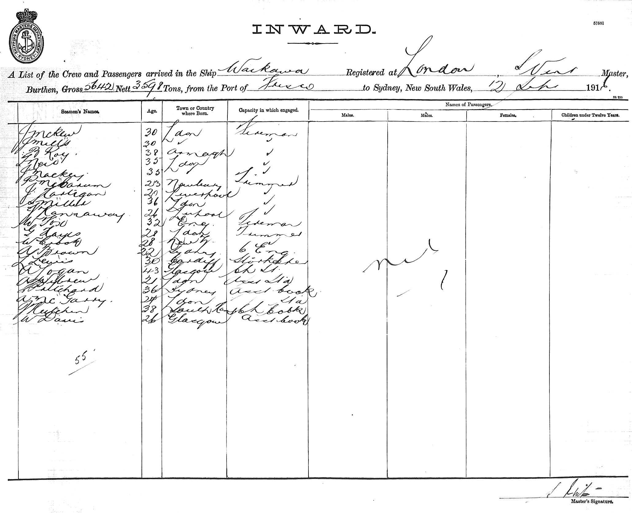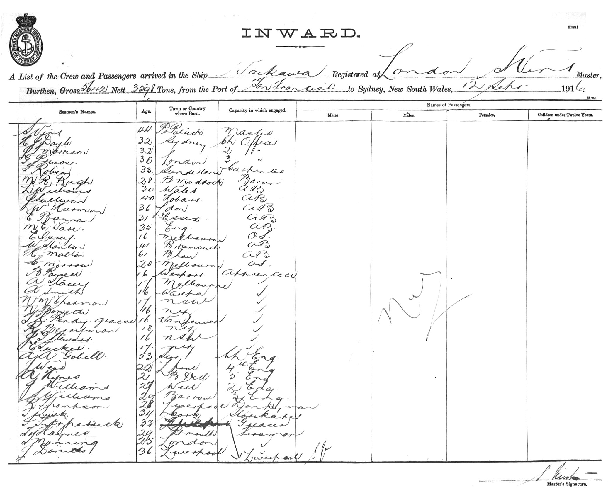WAIKAWAOF LONDON, S. VINT, MASTER, BURTHEN 5642/3598 TONS FROM THE PORT OF SAN FRANCISCO TO SYDNEY, NEW SOUTH WALES, 12TH SEPTEMBER 1916 |