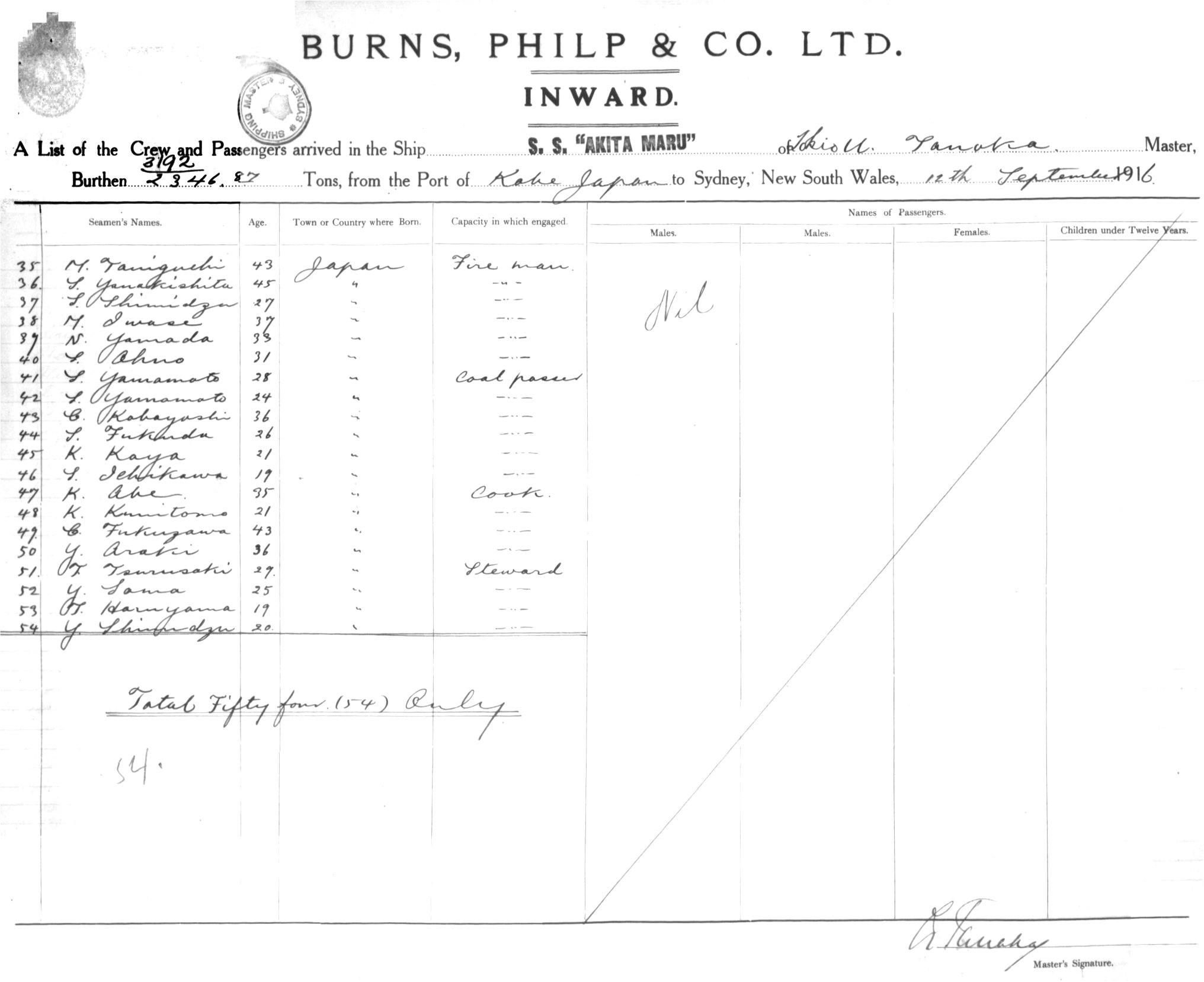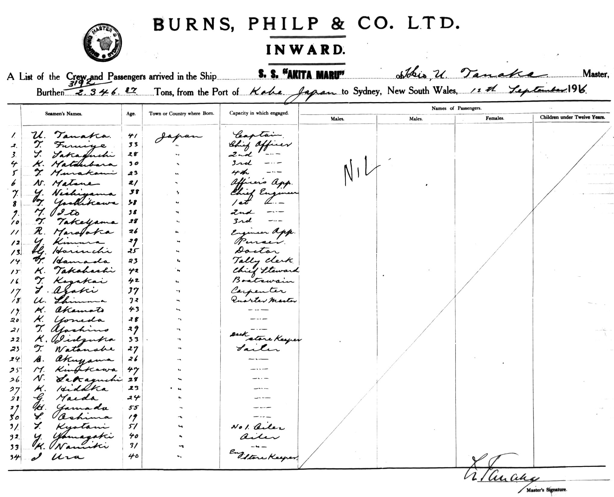 AKITA MARUOF TOKYO, U. TANAKA, MASTER, BURTHEN 3192/2346 TONS FROM THE PORT OF KOBE, JAPAN TO SYDNEY, NEW SOUTH WALES, 12TH SEPTEMBER 1916 |