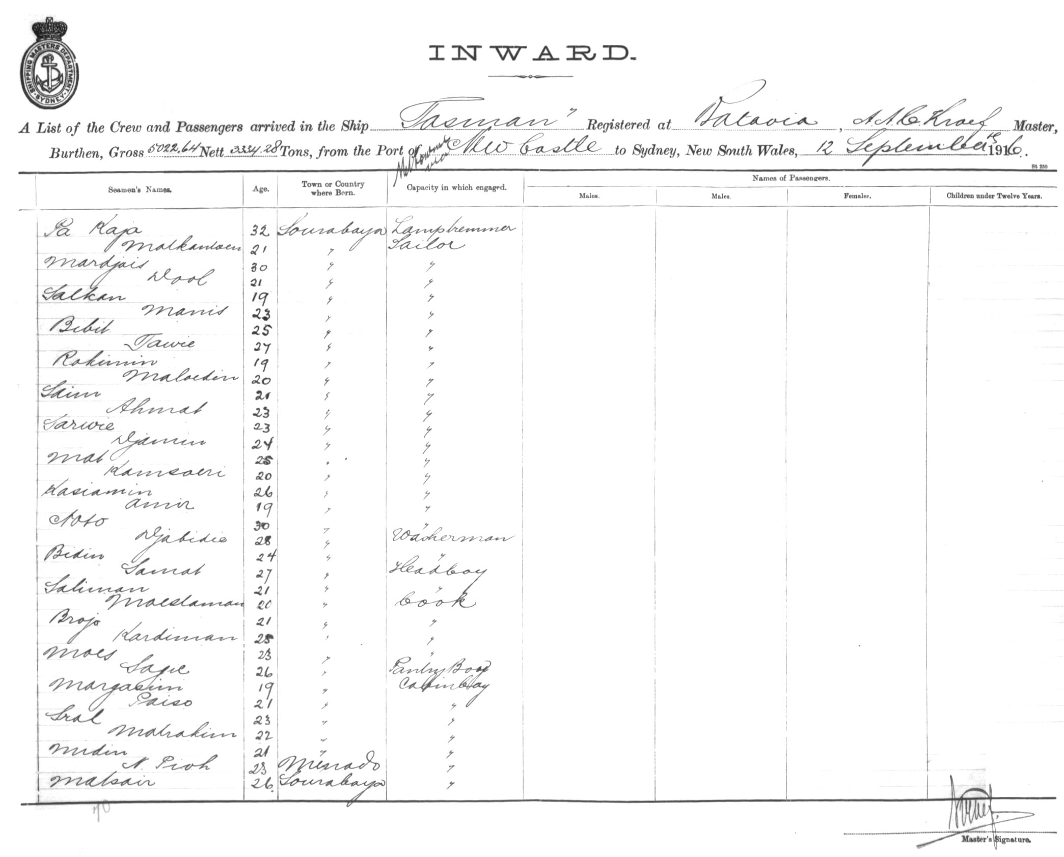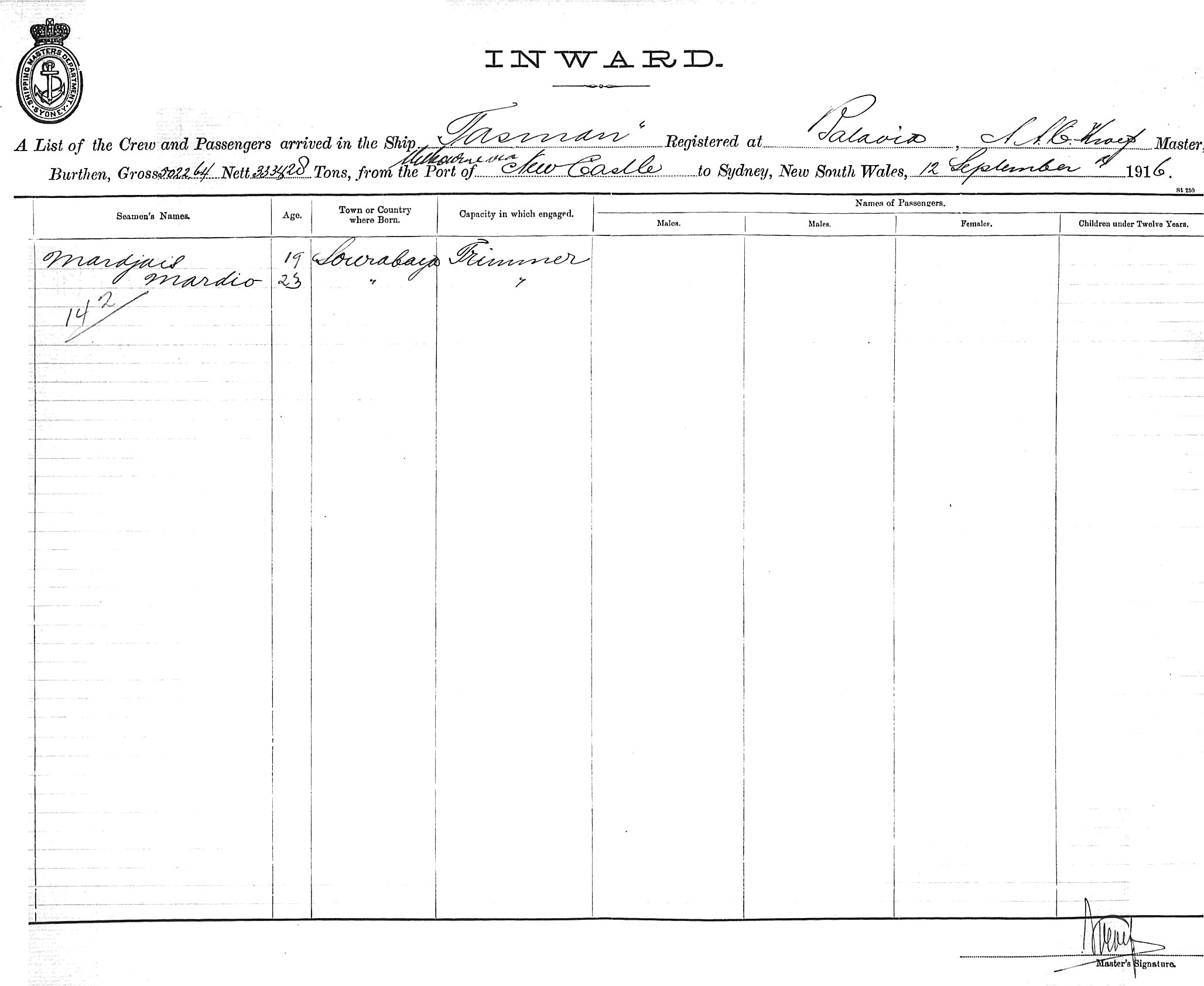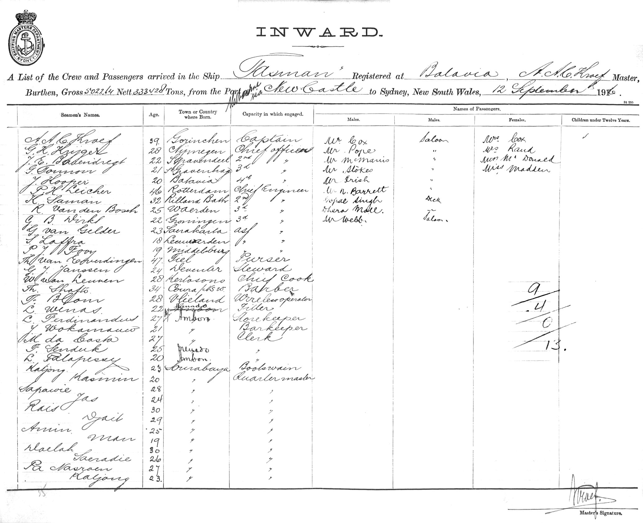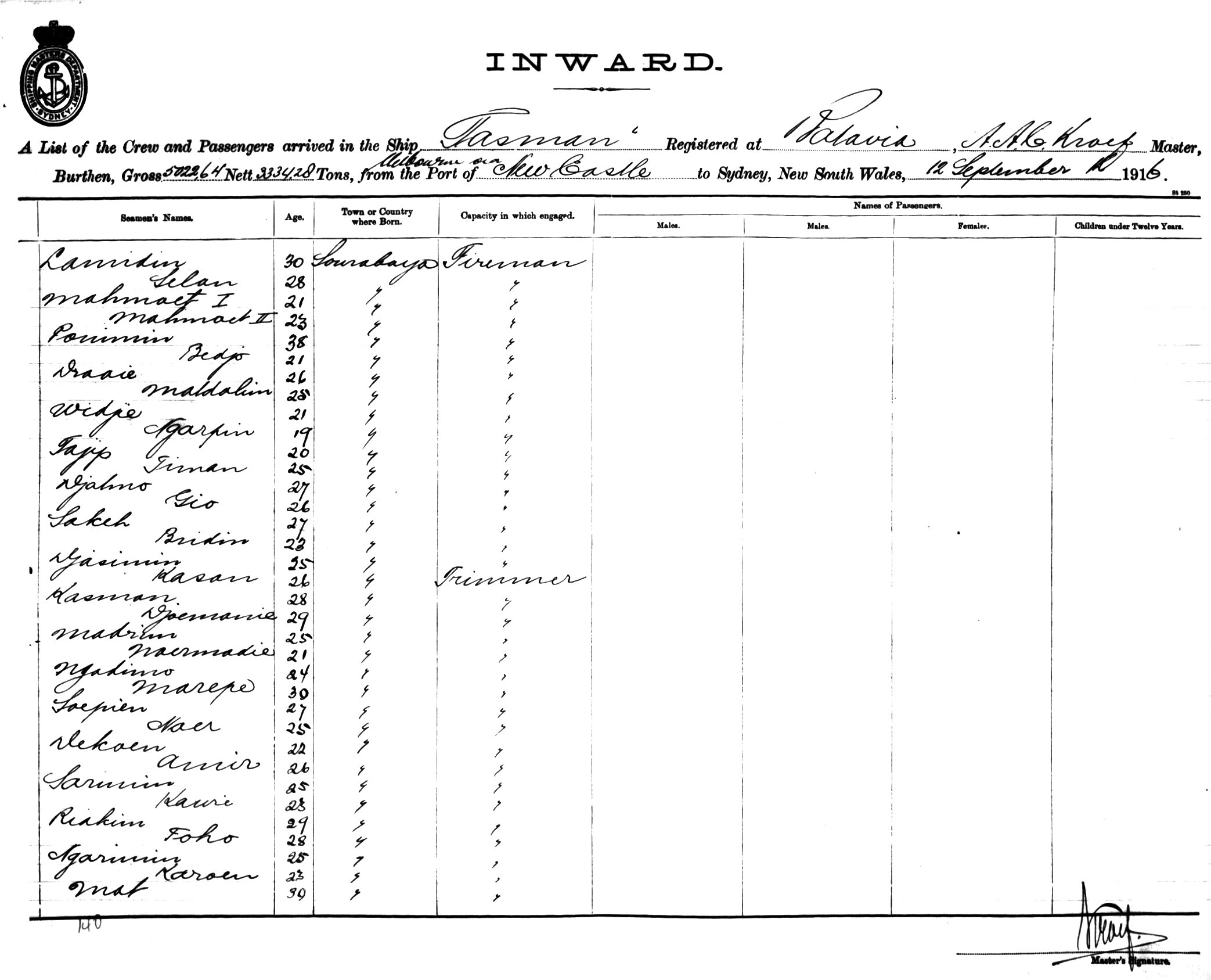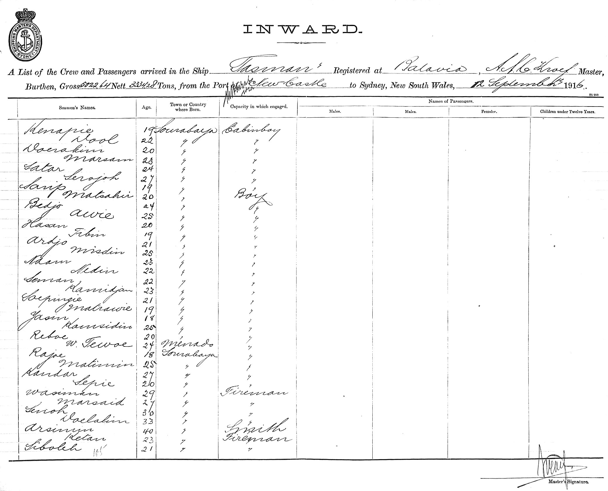 TASMANOF BATAVIA, A.A.C. KNOEF, MASTER, BURTHEN 5022/3334 TONS FROM THE PORT OF MELBOURNE VIA NEWCASTLE TO SYDNEY, NEW SOUTH WALES, 12TH SEPTEMBER 1916 |