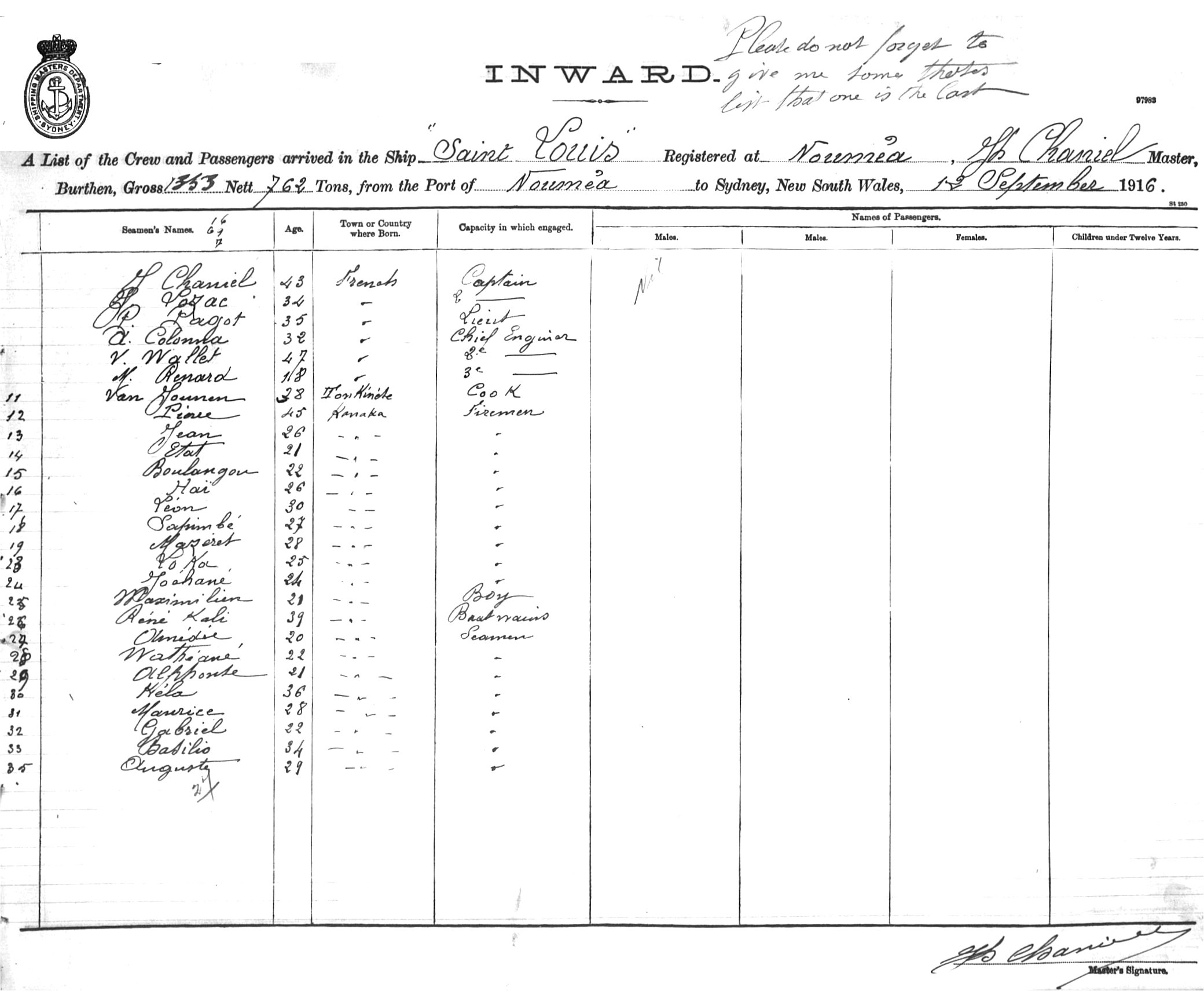 SAINT LOUISOF NOUMEA, J. CHANIEL, MASTER, BURTHEN 1353/762 TONS FROM THE PORT OF NOUMEA TO SYDNEY, NEW SOUTH WALES, 12TH SEPTEMBER 1916 |