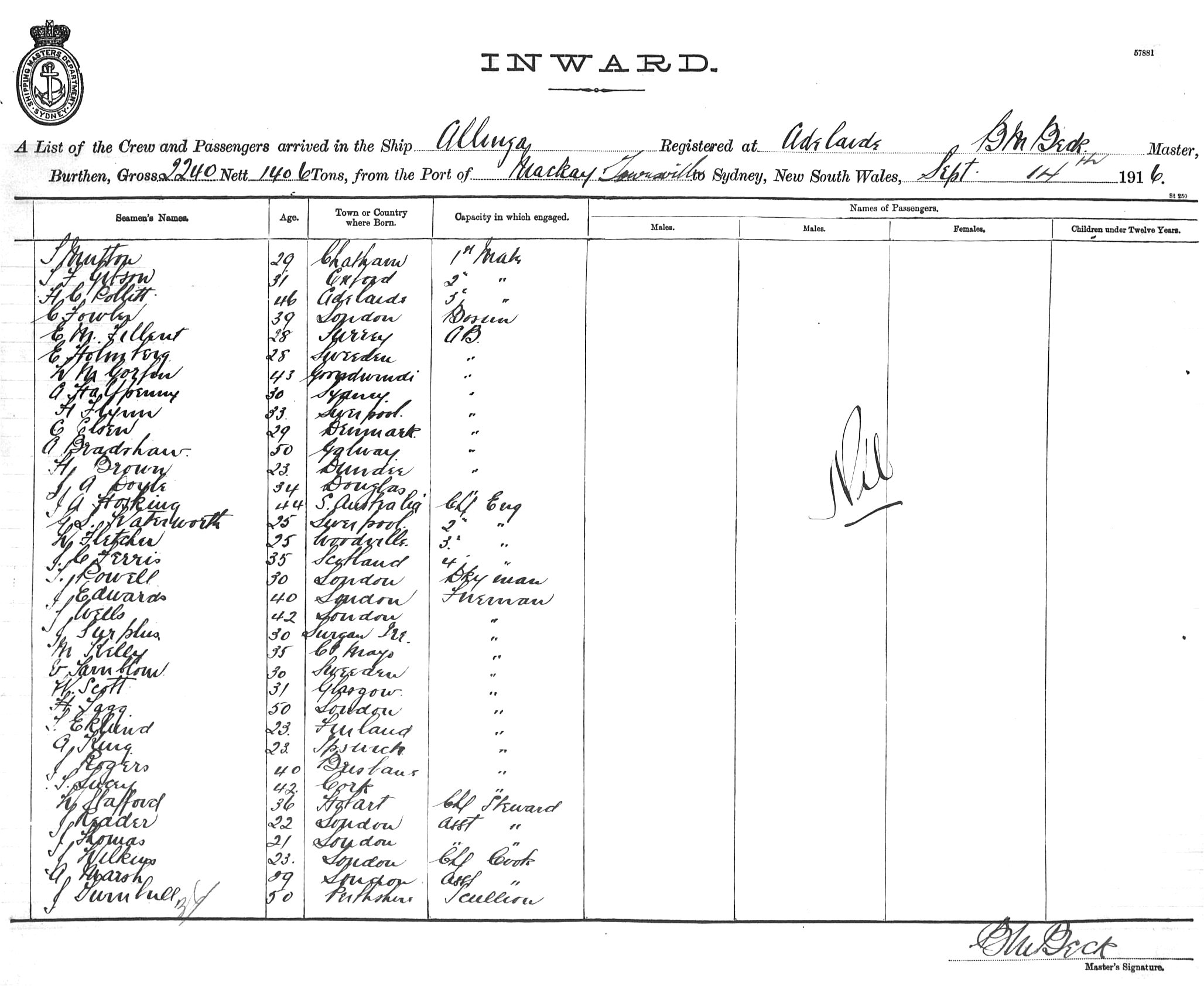 ALLINGAOF ADELAIDE, B.M. BECK, MASTER, BURTHEN 2240/1406 TONS FROM THE PORTS OF MACKAY & TOWNSVILLE TO SYDNEY, NEW SOUTH WALES, 14TH SEPTEMBER 1916 |