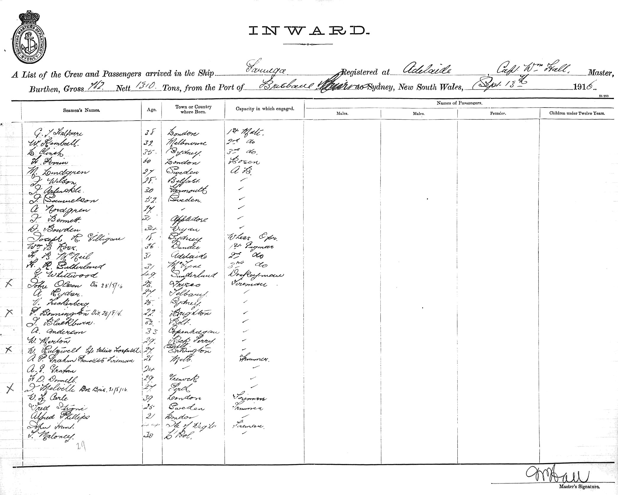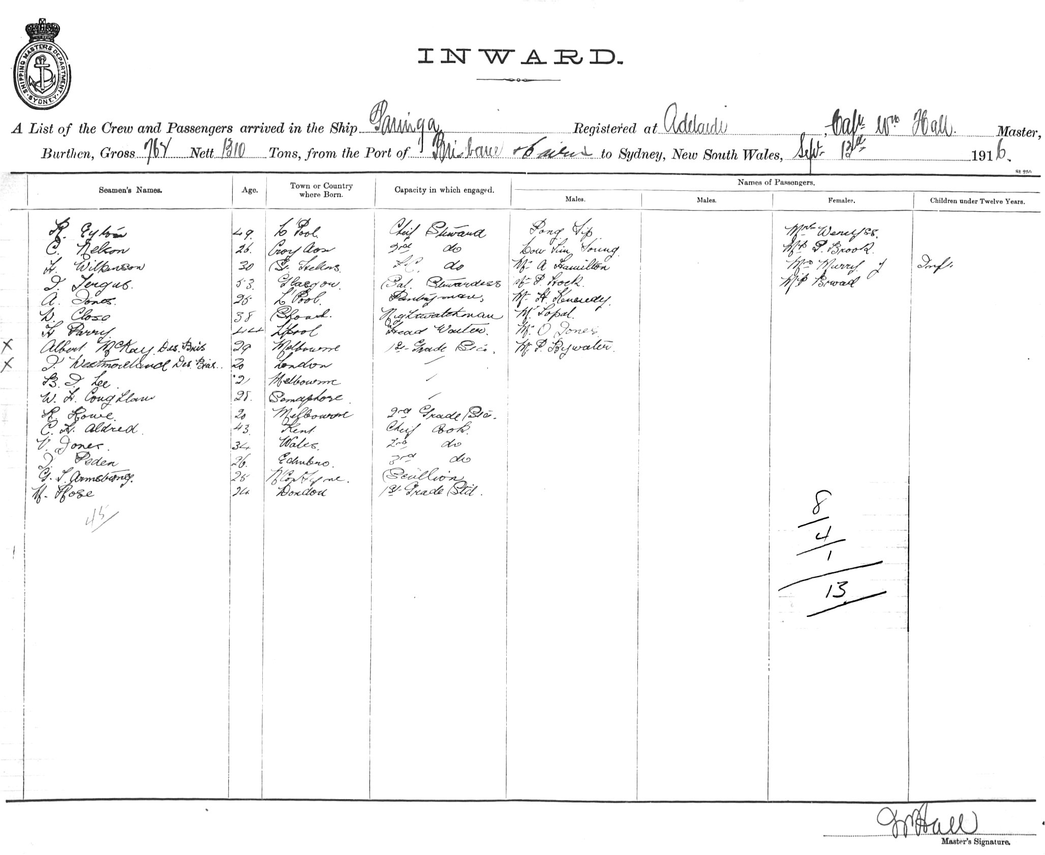 PARINGAOF ADELAIDE, WILLIAM HALL, MASTER, BURTHEN 1310/762 TONS FROM THE PORT OF BRISBANE TO SYDNEY, NEW SOUTH WALES, 13TH SEPTEMBER 1916 |