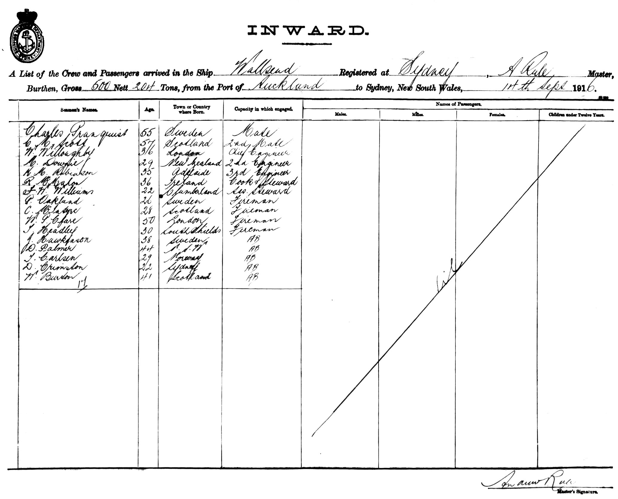 WALLSENDOF SYDNEY, A. RULE, MASTER, BURTHEN 500/204 TONS FROM THE PORT OF AUCKLAND TO SYDNEY, NEW SOUTH WALES, 14TH SEPTEMBER 1916 |