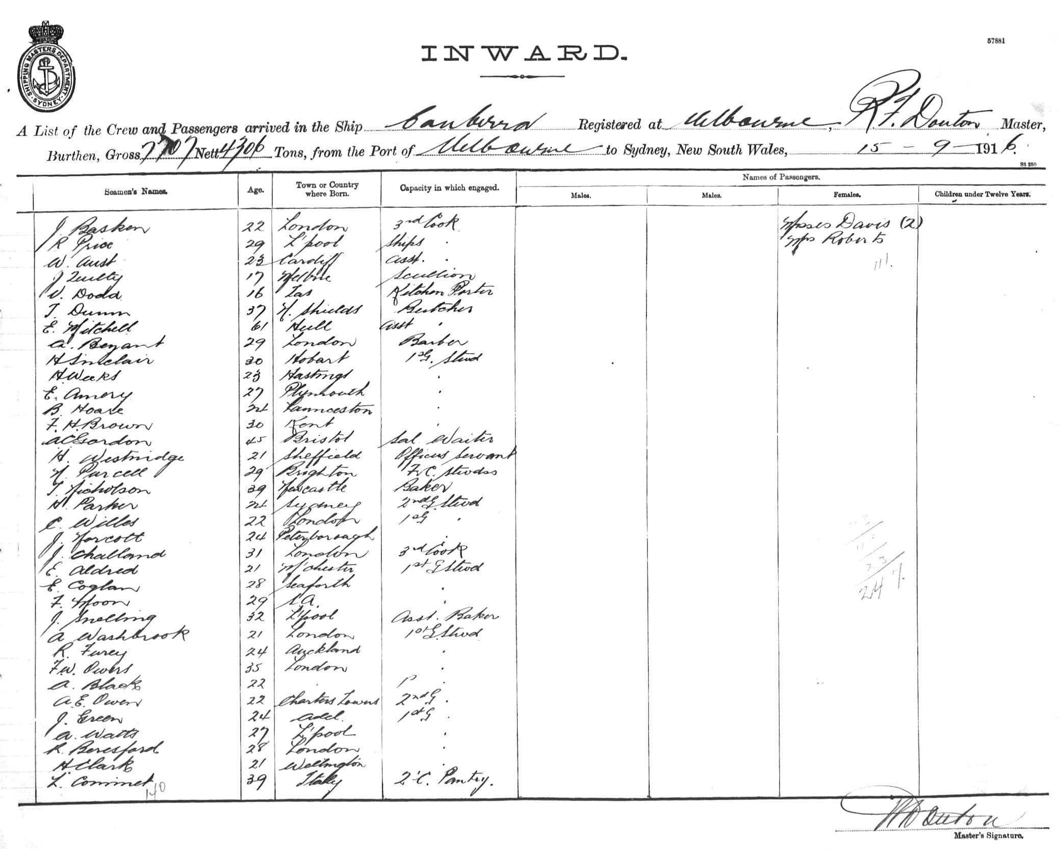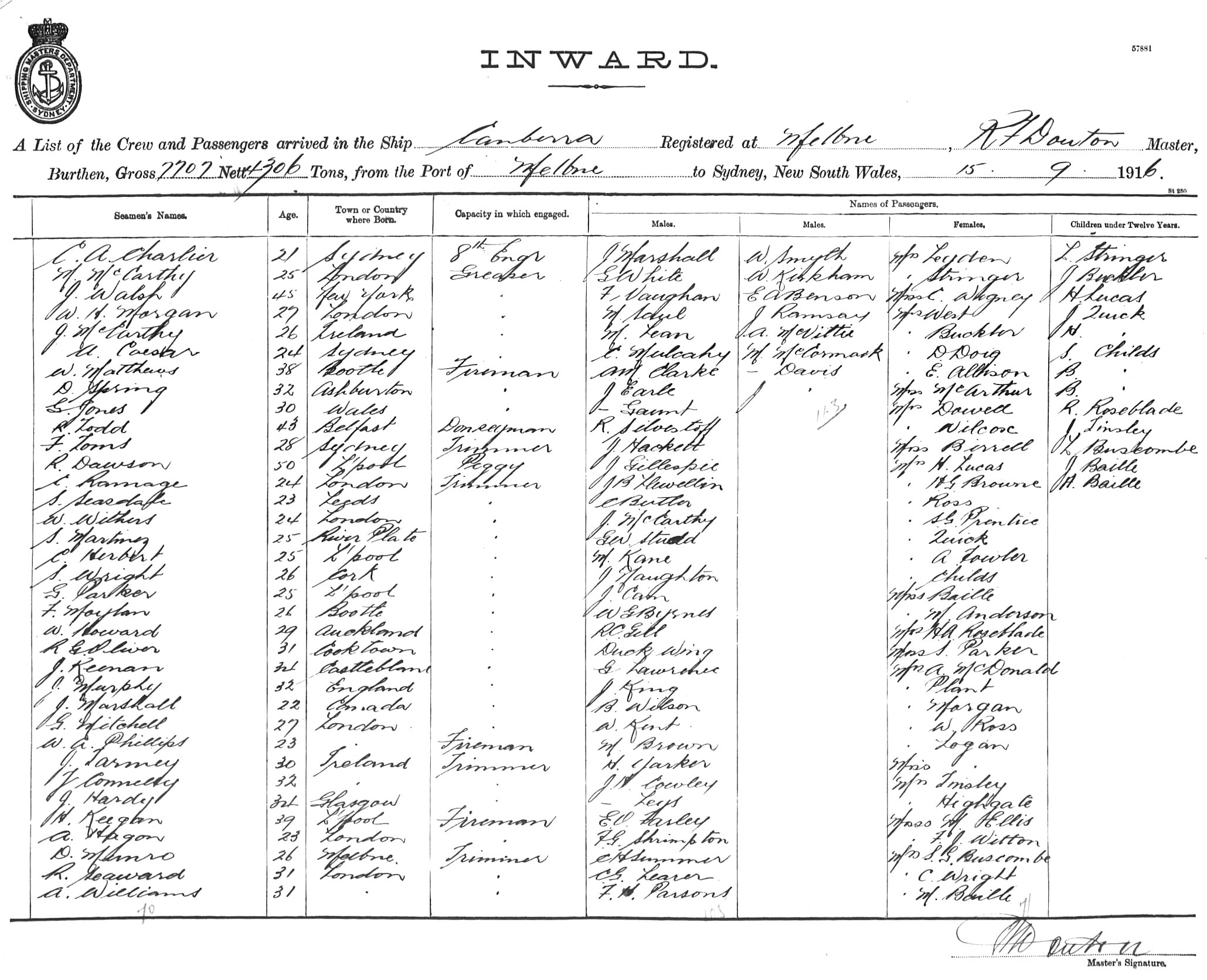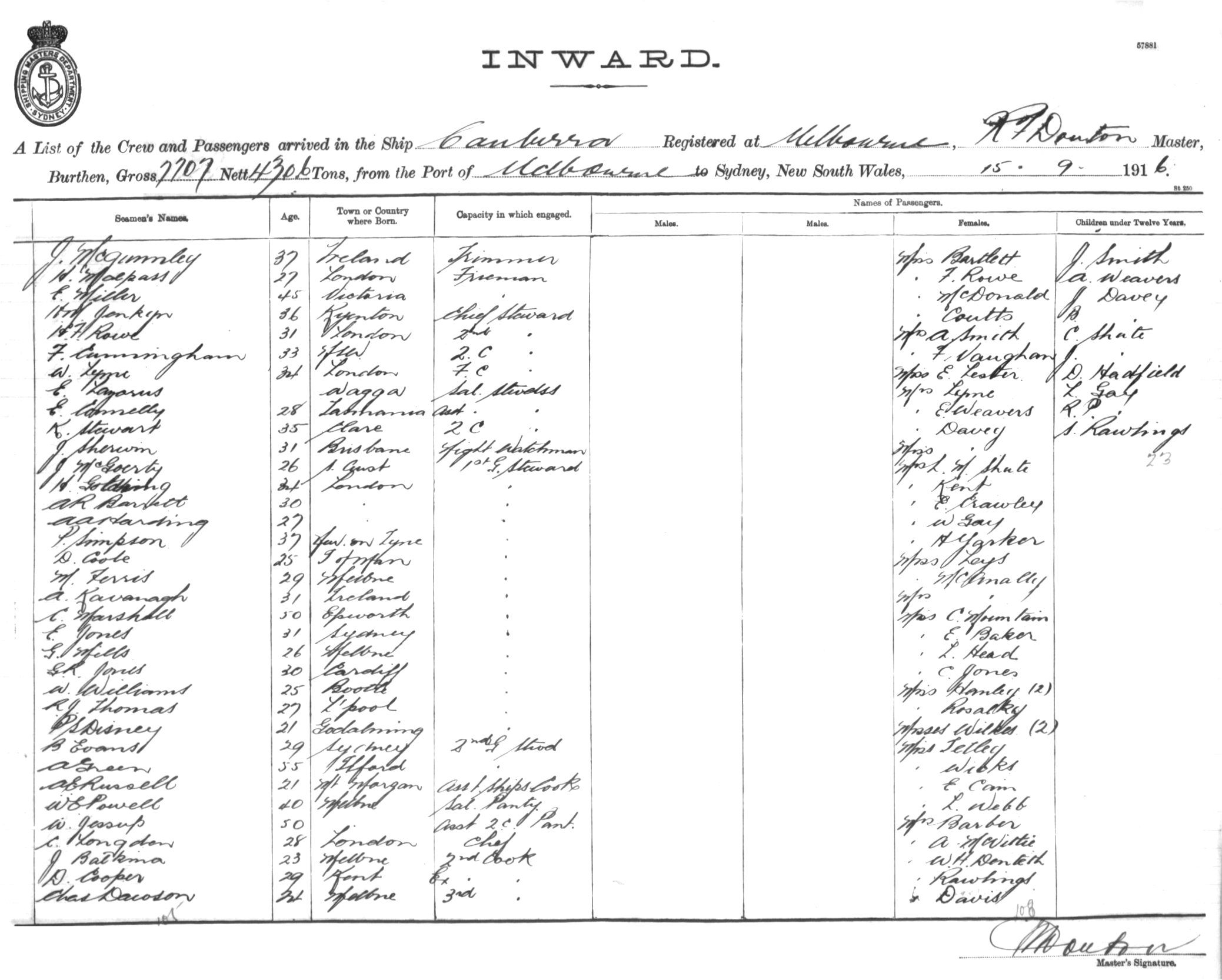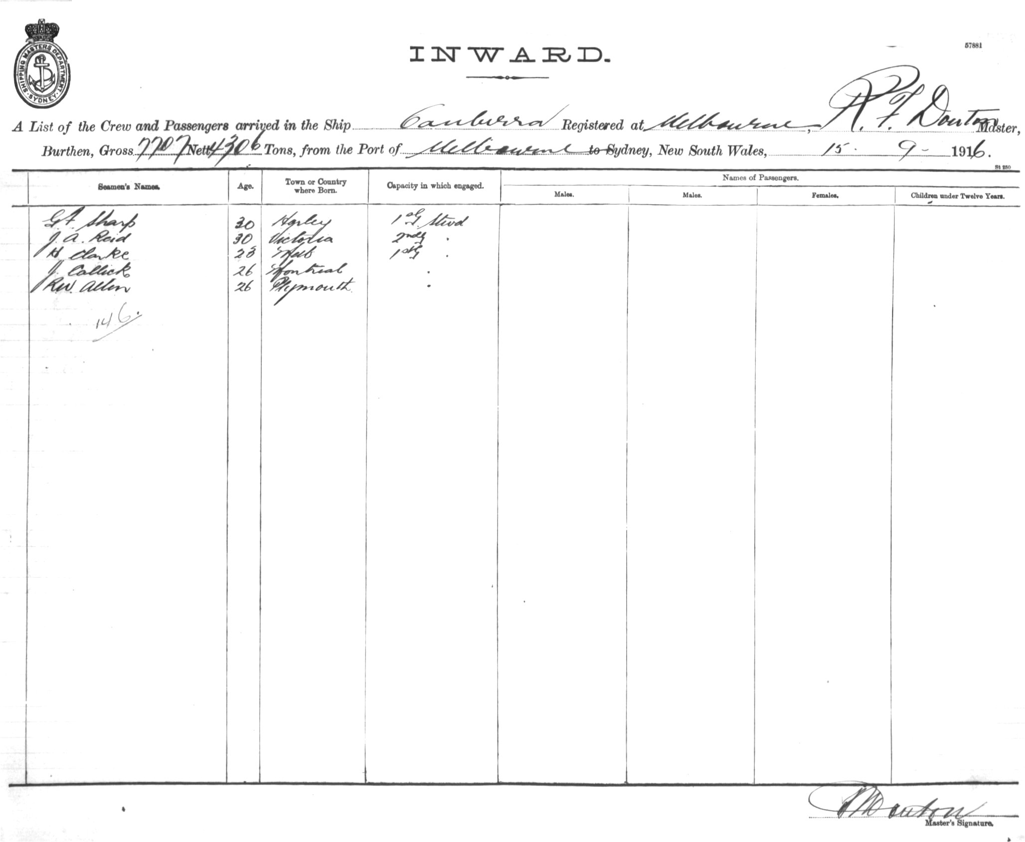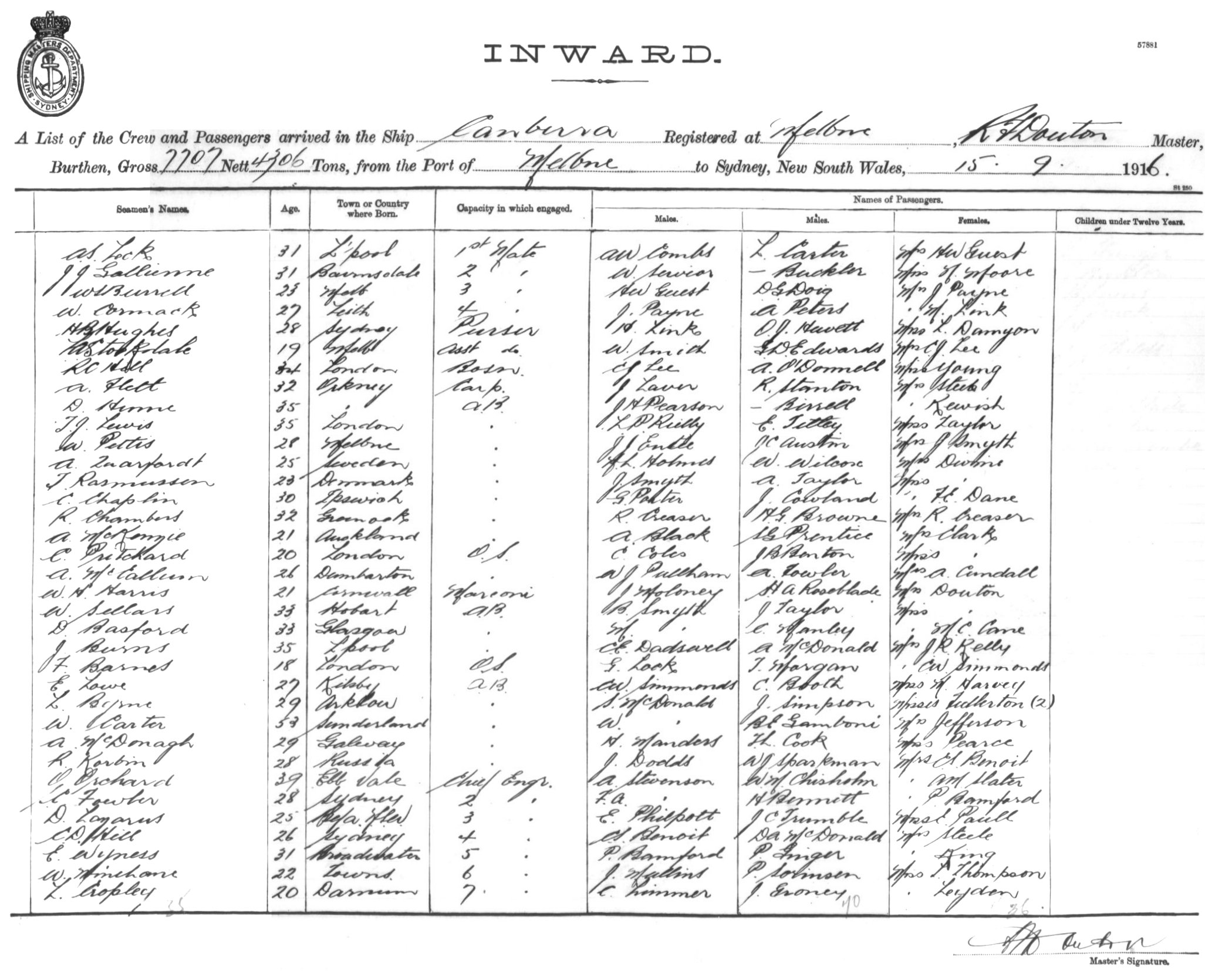 CANBERRAOF MELBOURNE, R.F. DOUTON, MASTER, BURTHEN 7707/4306 TONS FROM THE PORT OF MELBOURNE TO SYDNEY, NEW SOUTH WALES, 15TH SEPTEMBER 1916 |