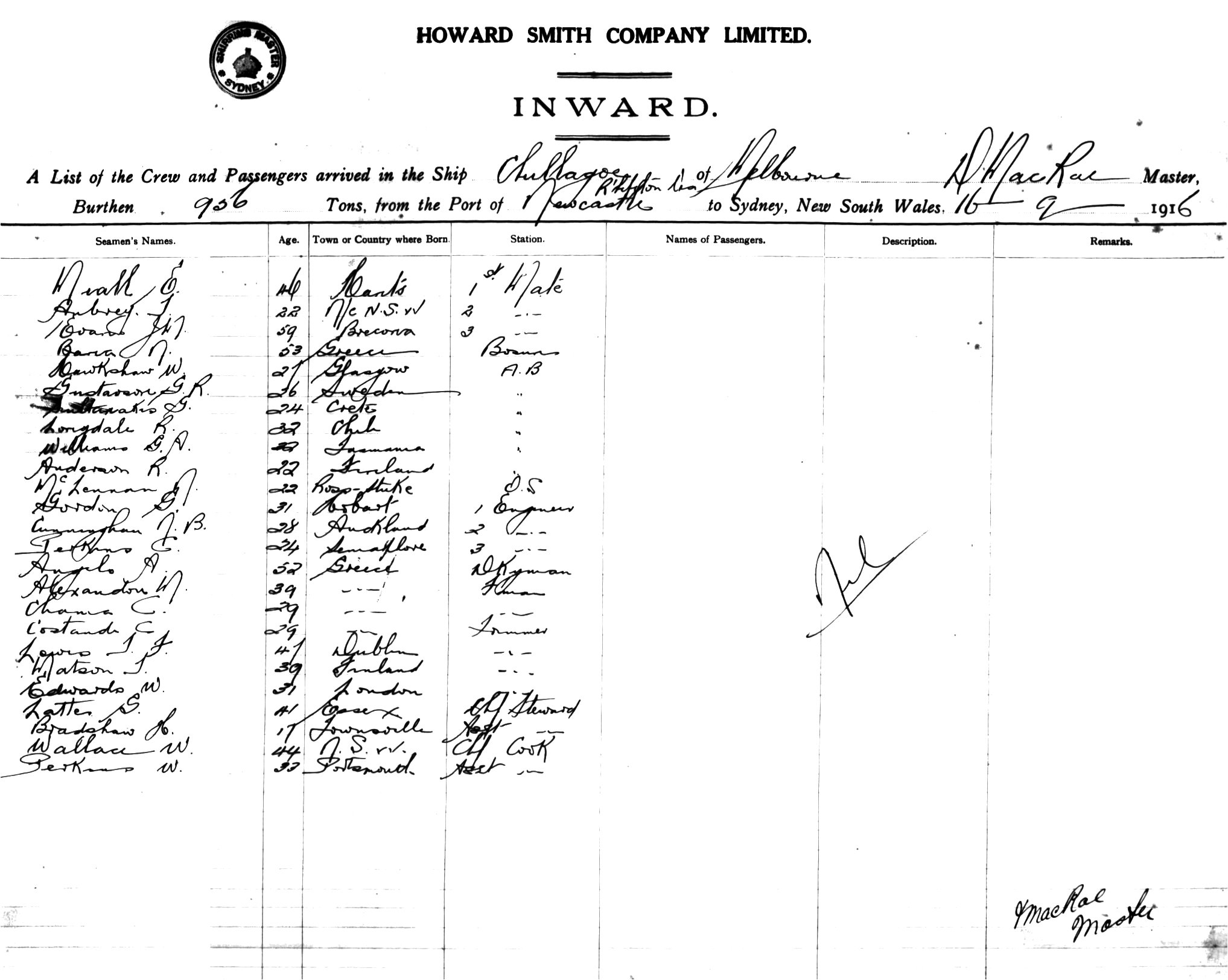 CHILLAGOEOF MELBOURNE, D. MACRAE, MASTER, BURTHEN 956 TONS FROM THE PORT OF ROCKHAMPTON VIA NEWCASTLE TO SYDNEY, NEW SOUTH WALES, 16TH SEPTEMBER 1916 |