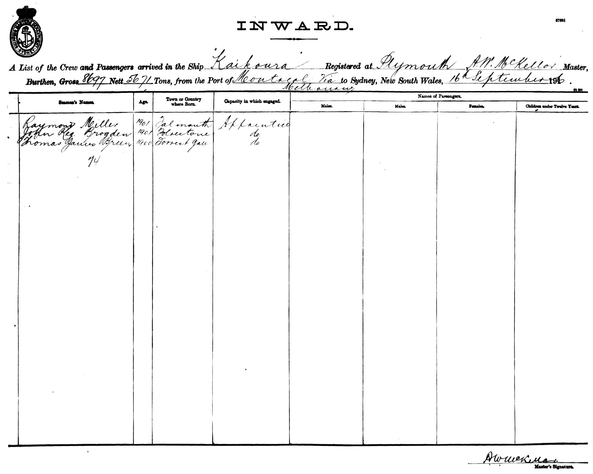 Mariners and ships in Australian Waters | KAIKOURAOF PLYMOUTH, A.W. MCKELLAR, MASTER, BURTHEN 8697/5671 TONS FROM THE PORT OF MONTREAL VIA MELBOURNE TO SYDNEY, NEW SOUTH WALES, 16TH SEPTEMBER 1916 |