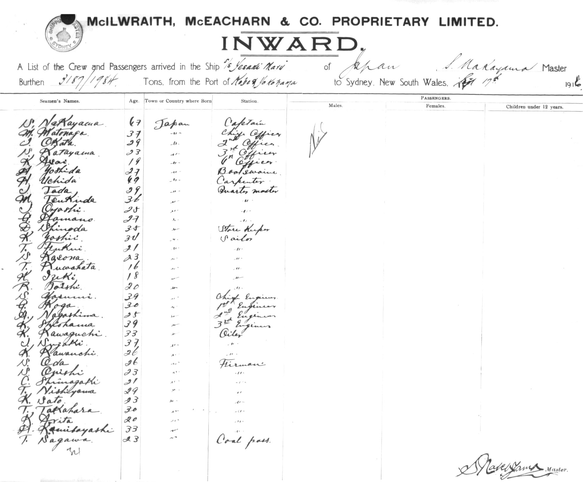 YESAKI MARUOF JAPAN, S. NAKAYAMA, MASTER, BURTHEN 3187/1984 TONS FROM THE PORT OF KOBE & YOKOHAMA TO SYDNEY, NEW SOUTH WALES, 17TH SEPTEMBER 1916 |