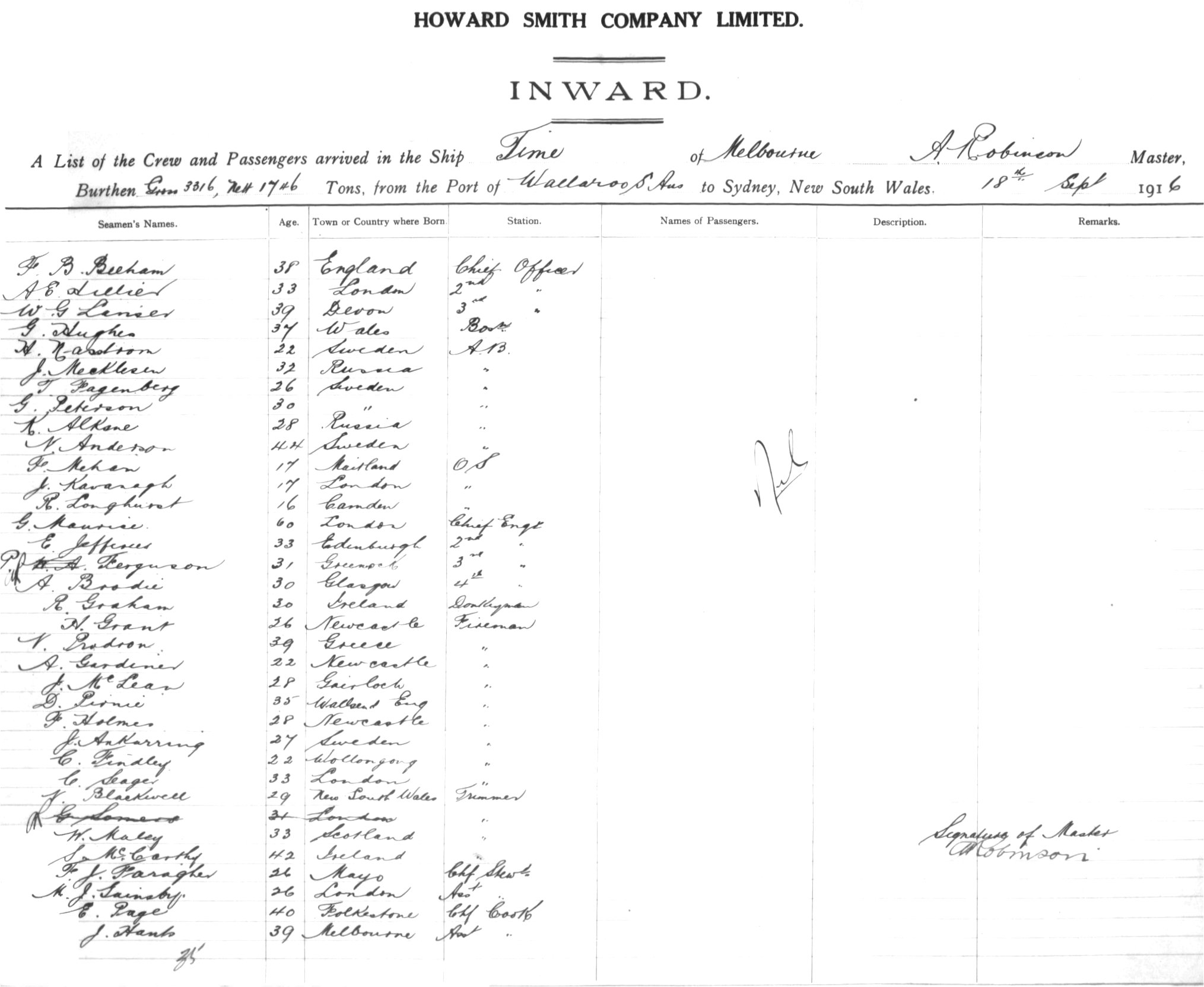 TIMEOF MELBOURNE, A. ROBINSON, MASTER, BURTHEN 3316/1746 TONS FROM THE PORT OF WALLAROO TO SYDNEY, NEW SOUTH WALES, 18TH SEPTEMBER 1916 |