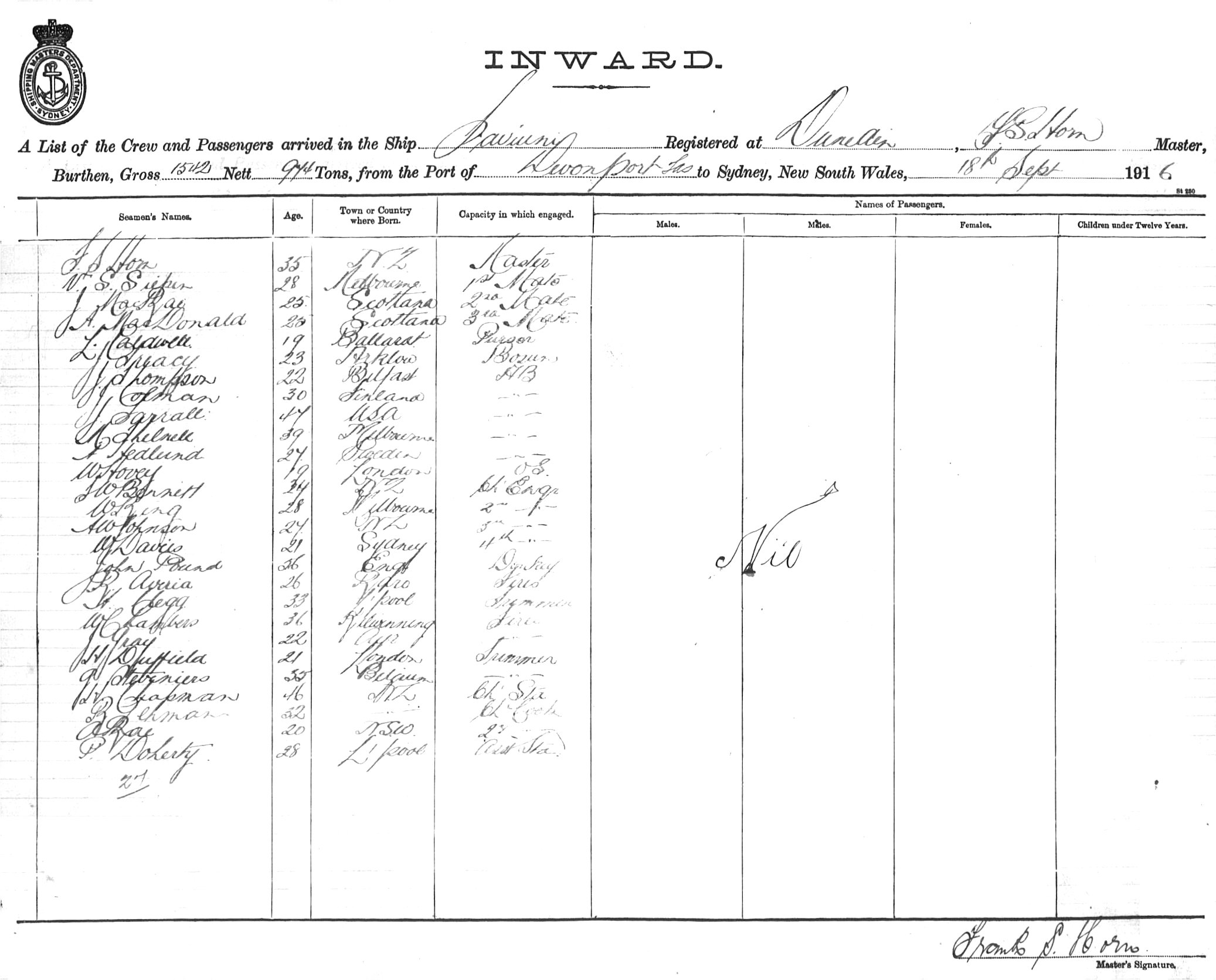 TAVIUNIOF DUNEDIN, F.S. HORN, MASTER, BURTHEN 1542/974 TONS FROM THE PORT OF DEVONPORT TO SYDNEY, NEW SOUTH WALES, 18TH SEPTEMBER 1916 |