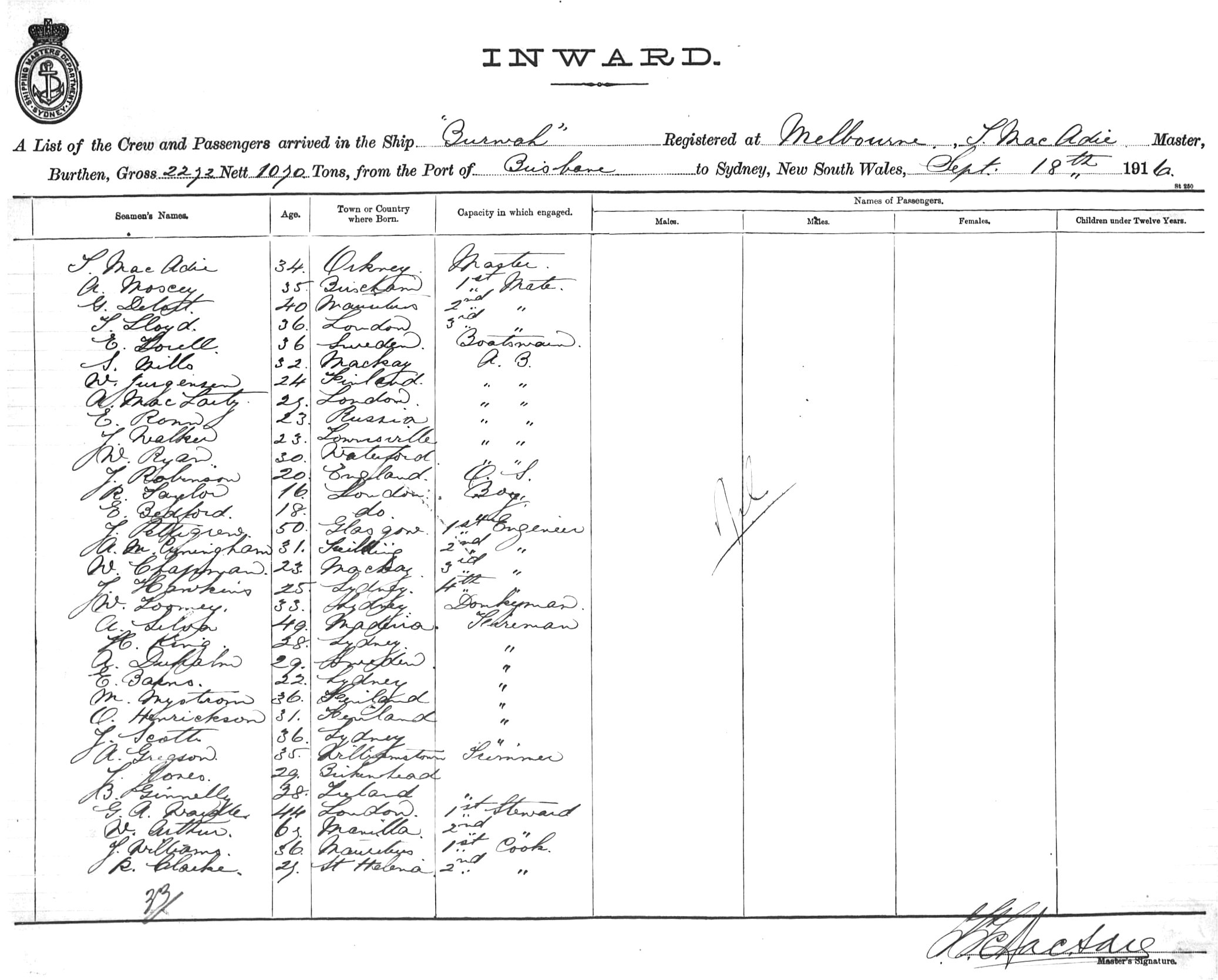 BURWAHOF MELBOURNE, T.MacADIE, MASTER, BURTHEN 2272/1070 TONS, FROM THE PORT OF BRISBANE TO SYDNEY, NEW SOUTH WALES, 18TH SEPTEMBER 1916 |