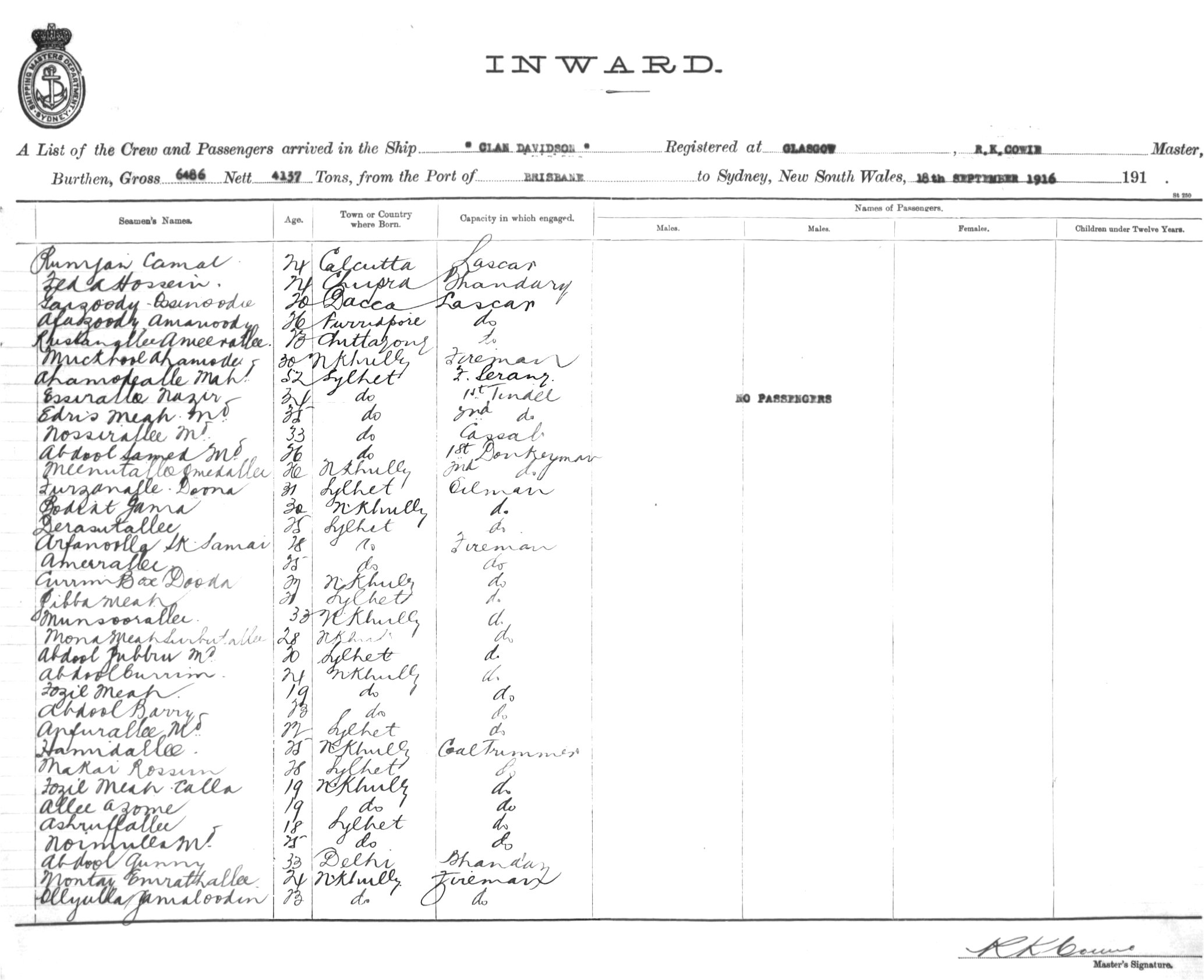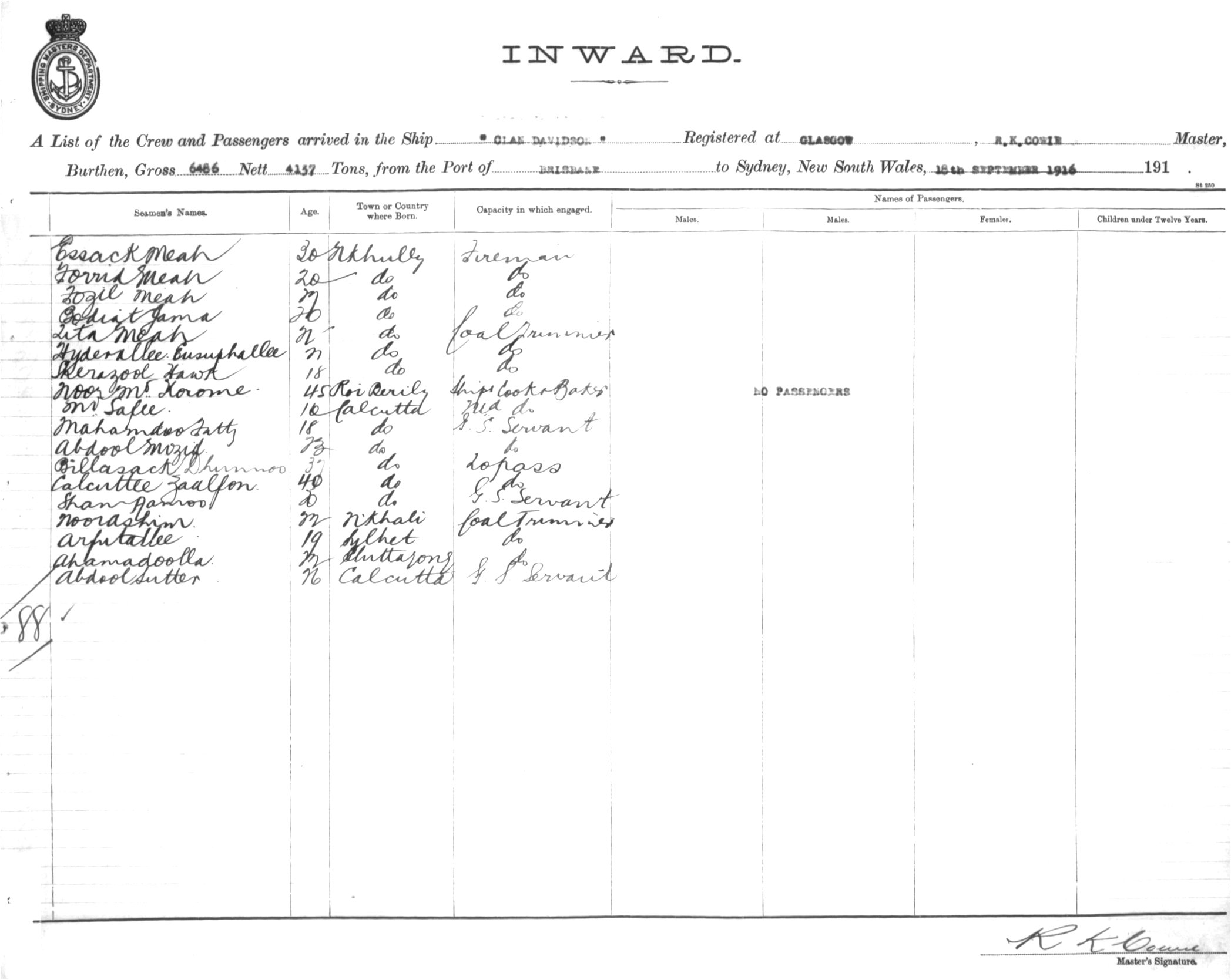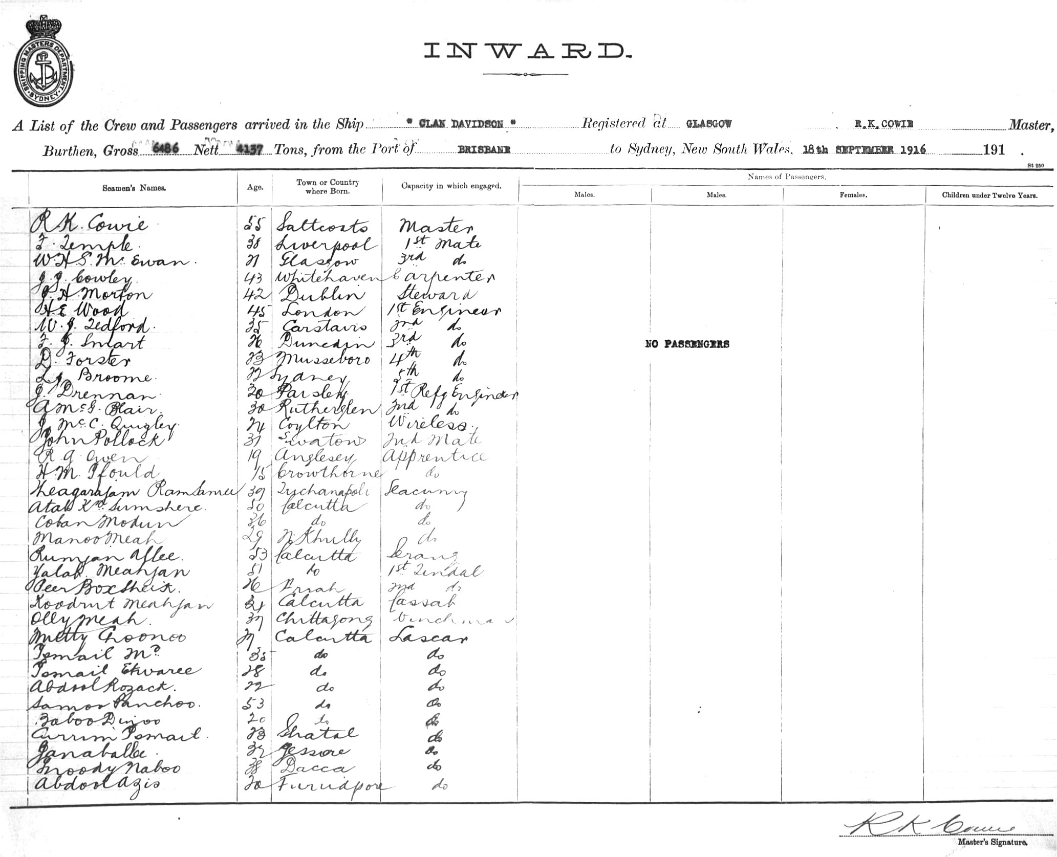 CLAN DAVIDSONOF GLASGOW, R.K. COWIE, MASTER, BURTHEN 6486/4157 TONS FROM THE PORT OF BRISBANE TO SYDNEY, NEW SOUTH WALES, 18TH SEPTEMBER 1916 |