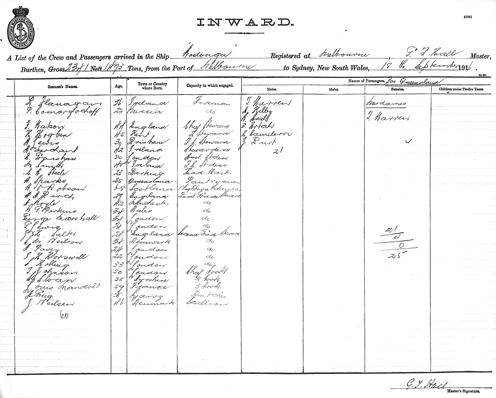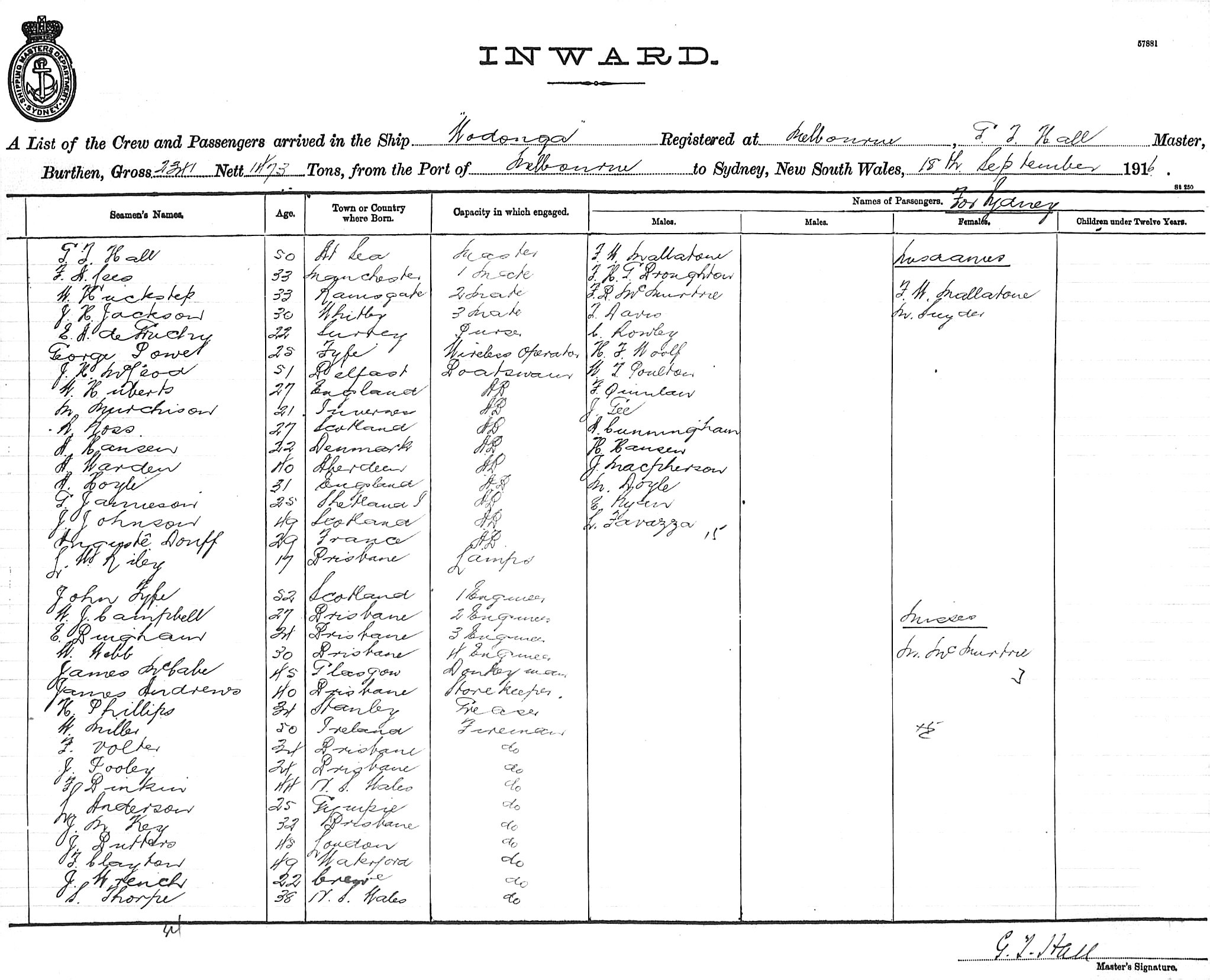 WODONGAOF MELBOURNE, G.T. HALL, MASTER, BURTHEN 2341/1473 TONS FROM THE PORT OF MELBOURNE TO SYDNEY, NEW SOUTH WALES, 18TH SEPTEMBER 1916 |