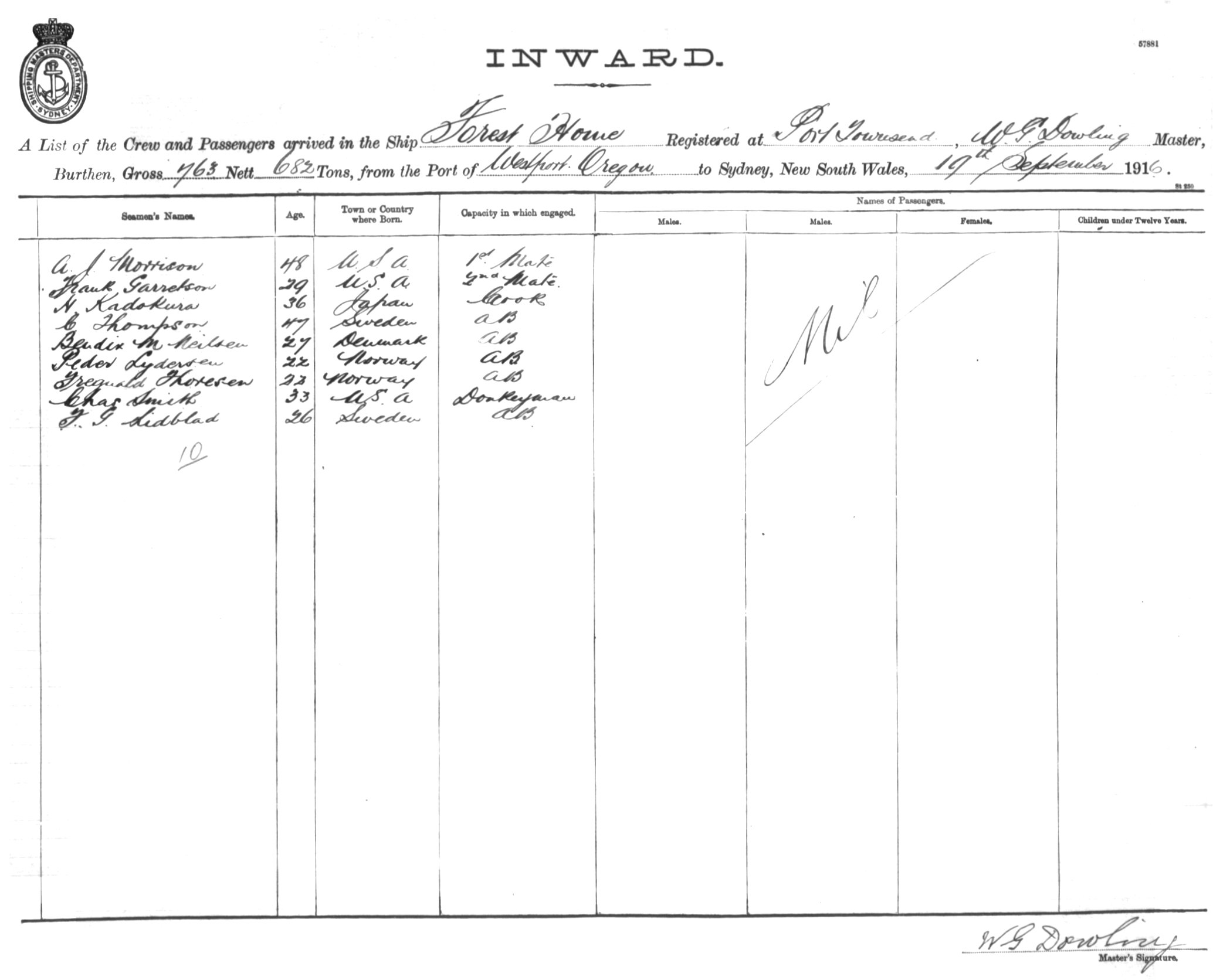 FOREST HOMEOF PORT TOWNSEND, W.G. DOWLING, MASTER, BURTHEN 763/682 TONS FROM THE PORT OF WESTPORT, OREGON TO SYDNEY, NEW SOUTH WALES, 19TH SEPTEMBER 1916 |