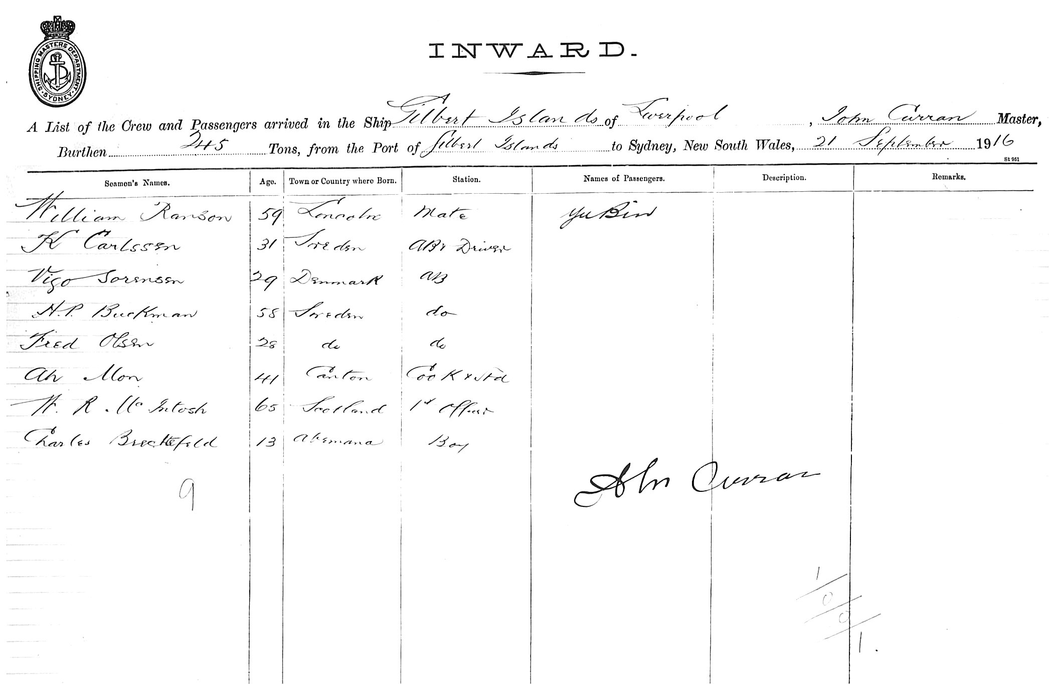 GILBERT ISLANDSOF LIVERPOOL, JOHN CURRAN, MASTER, BURTHEN 245 TONS FROM THE PORT OF GILBERT ISLANDS TO SYDNEY, NEW SOUTH WALES, 21ST SEPTEMBER 1916 |