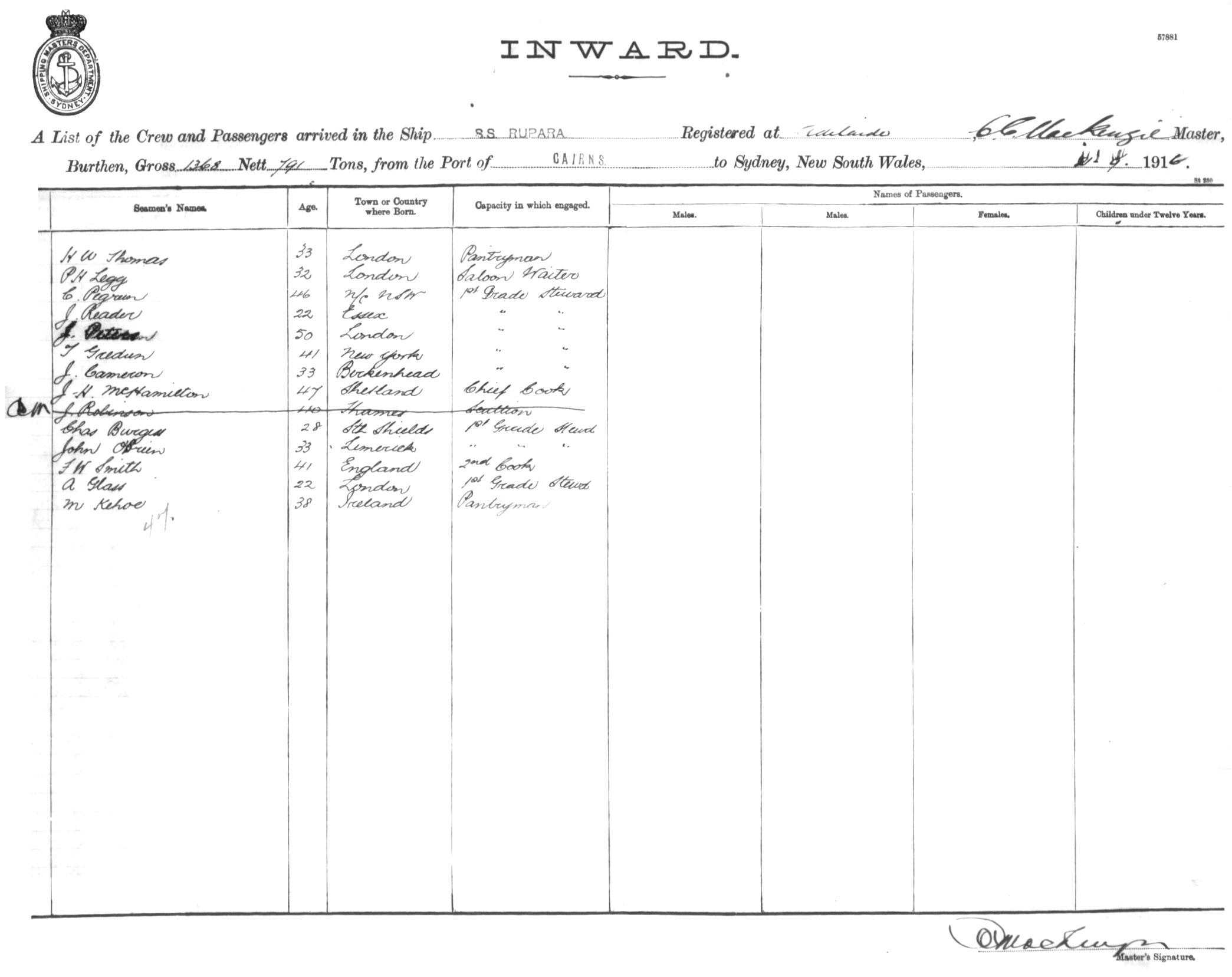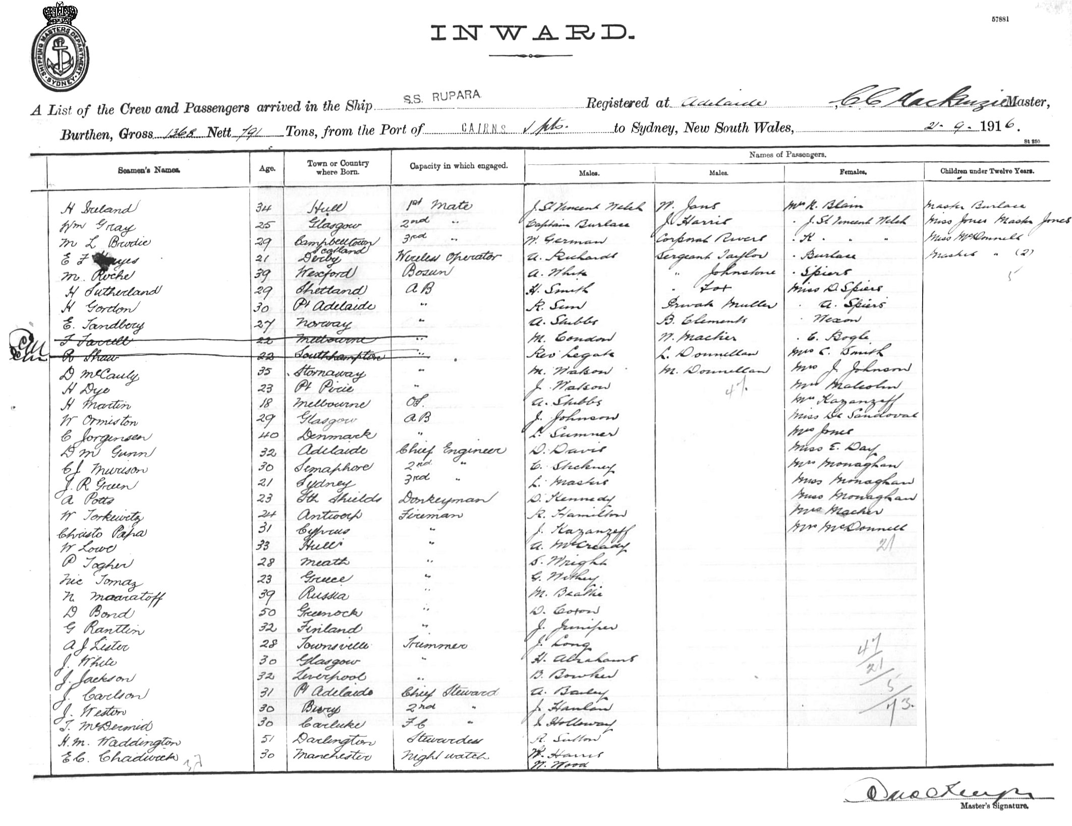RUPARAOF ADELAIDE, C.C. MACKENZIE, MASTER, BURTHEN 1368/791 TONS FROM THE PORT OF CAIRNS VIA PORTS TO SYDNEY, NEW SOUTH WALES, 21ST SEPTEMBER 1916 |