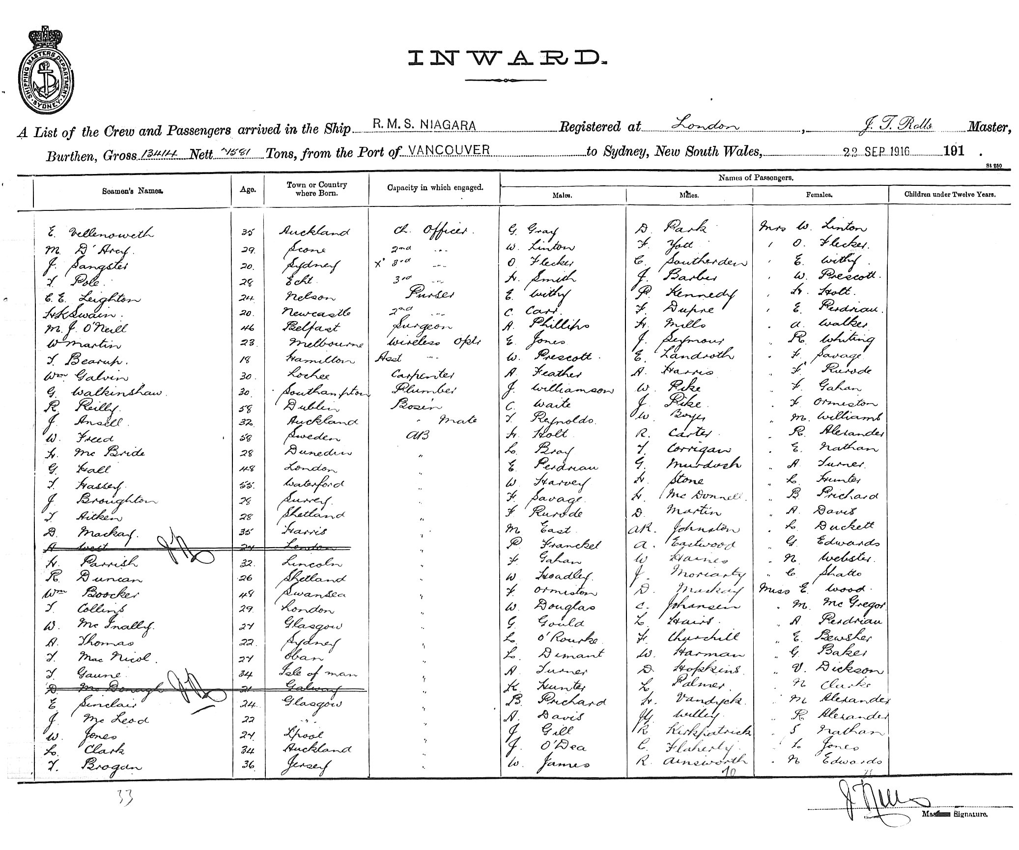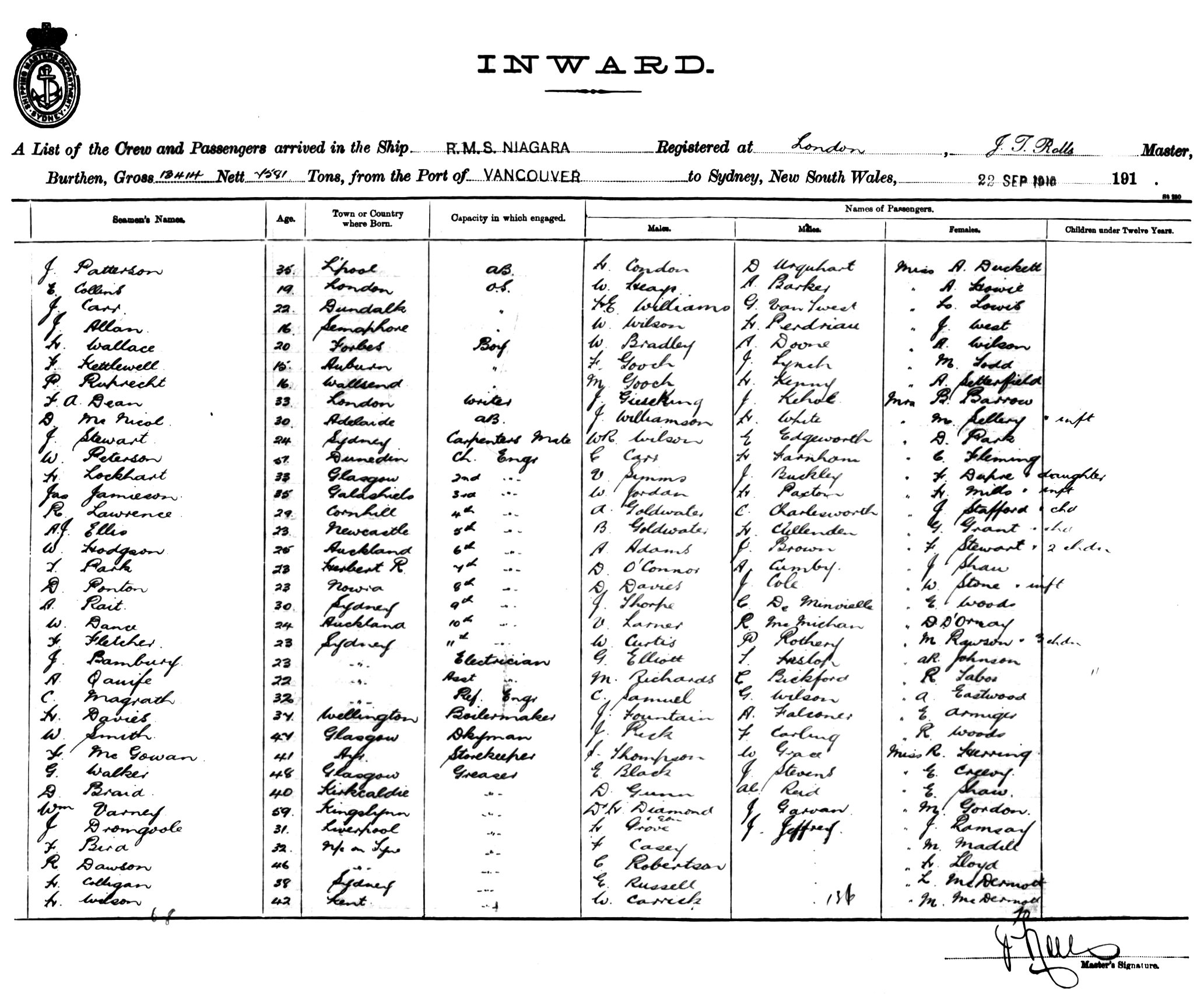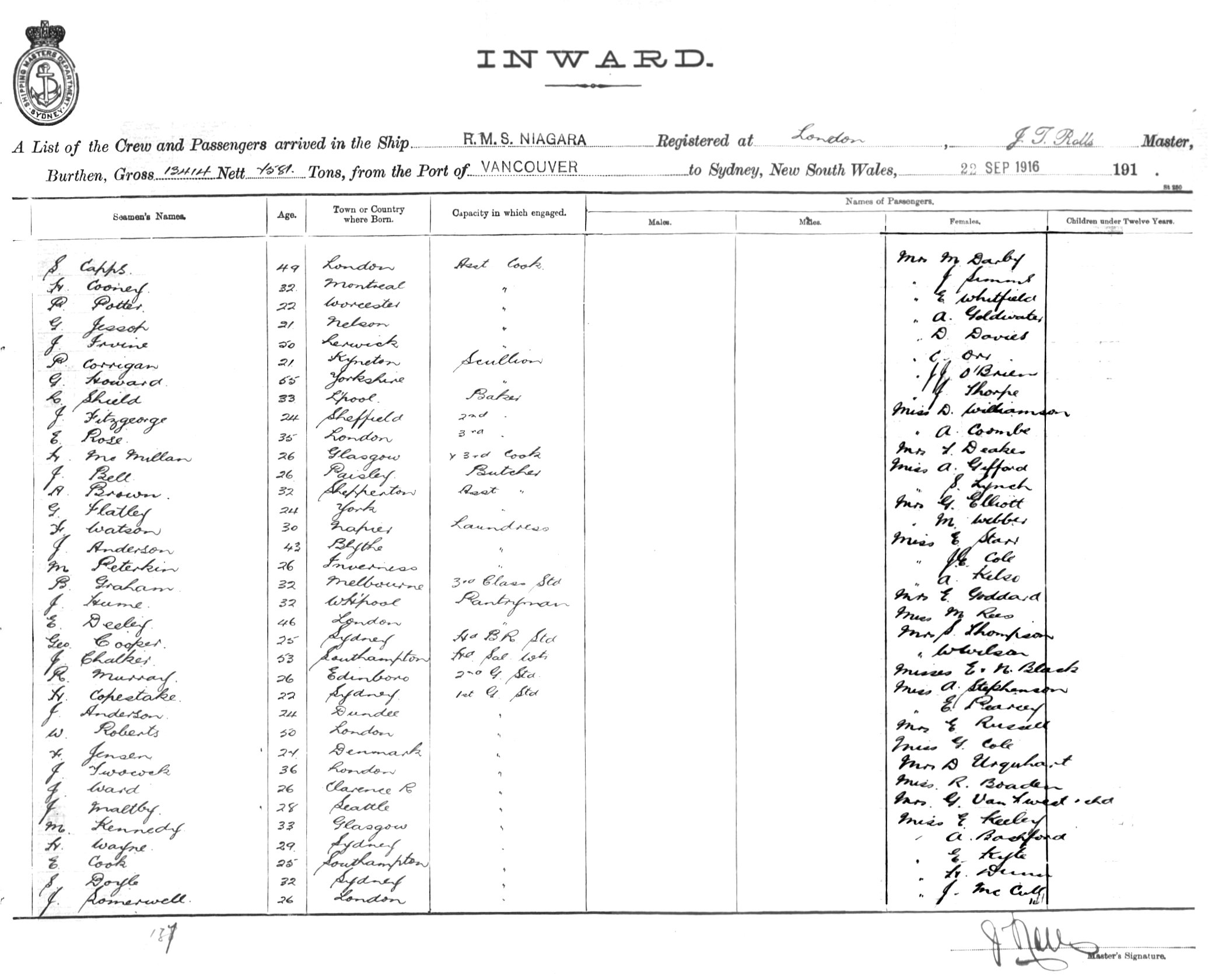NIAGARAOF LONDON, J.T. ROLLS, MASTER, BURTHEN 13414/7581 TONS FROM THE PORT OF VANCOUVER TO SYDNEY, NEW SOUTH WALES, 22ND SEPTEMBER 1916 |