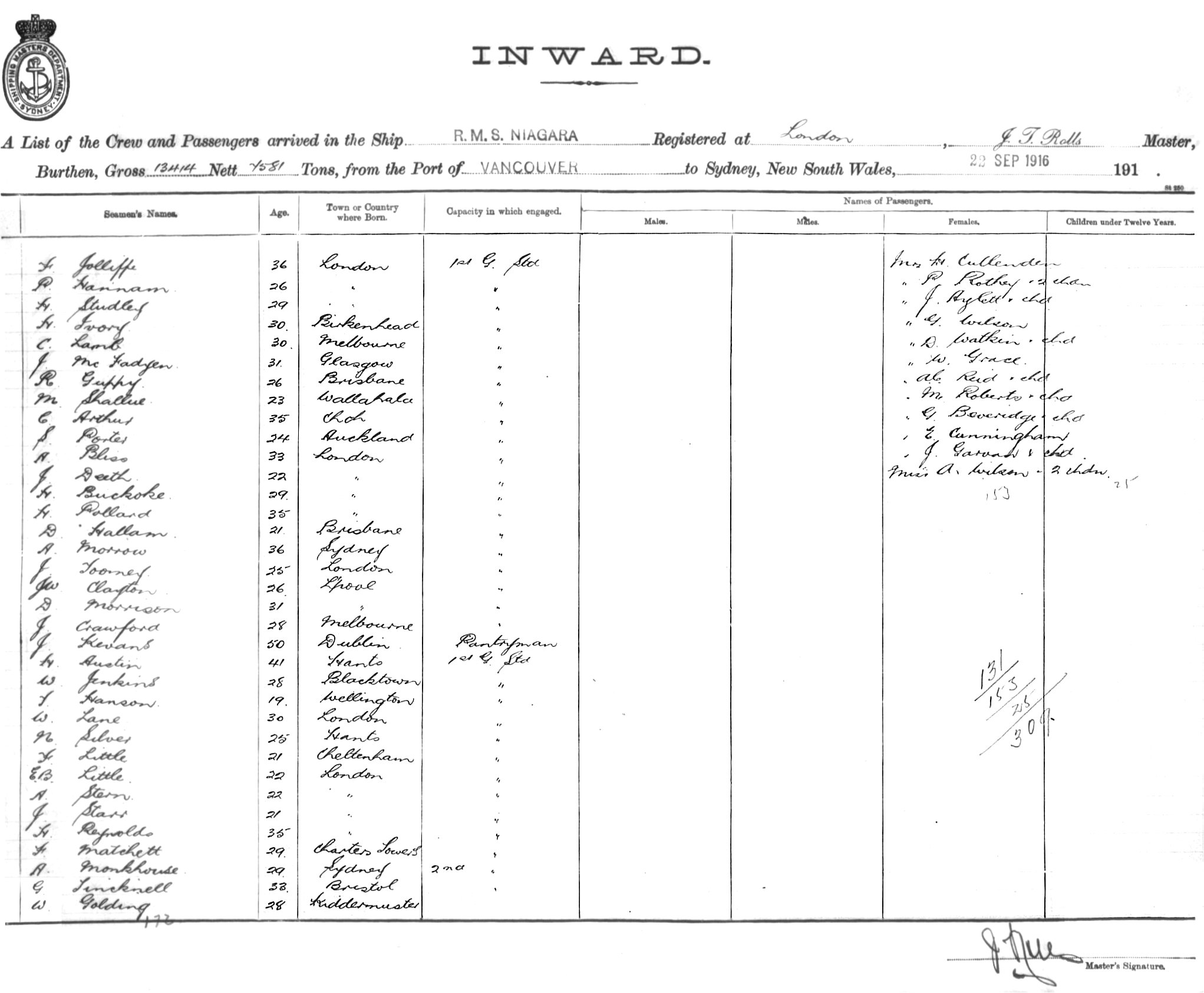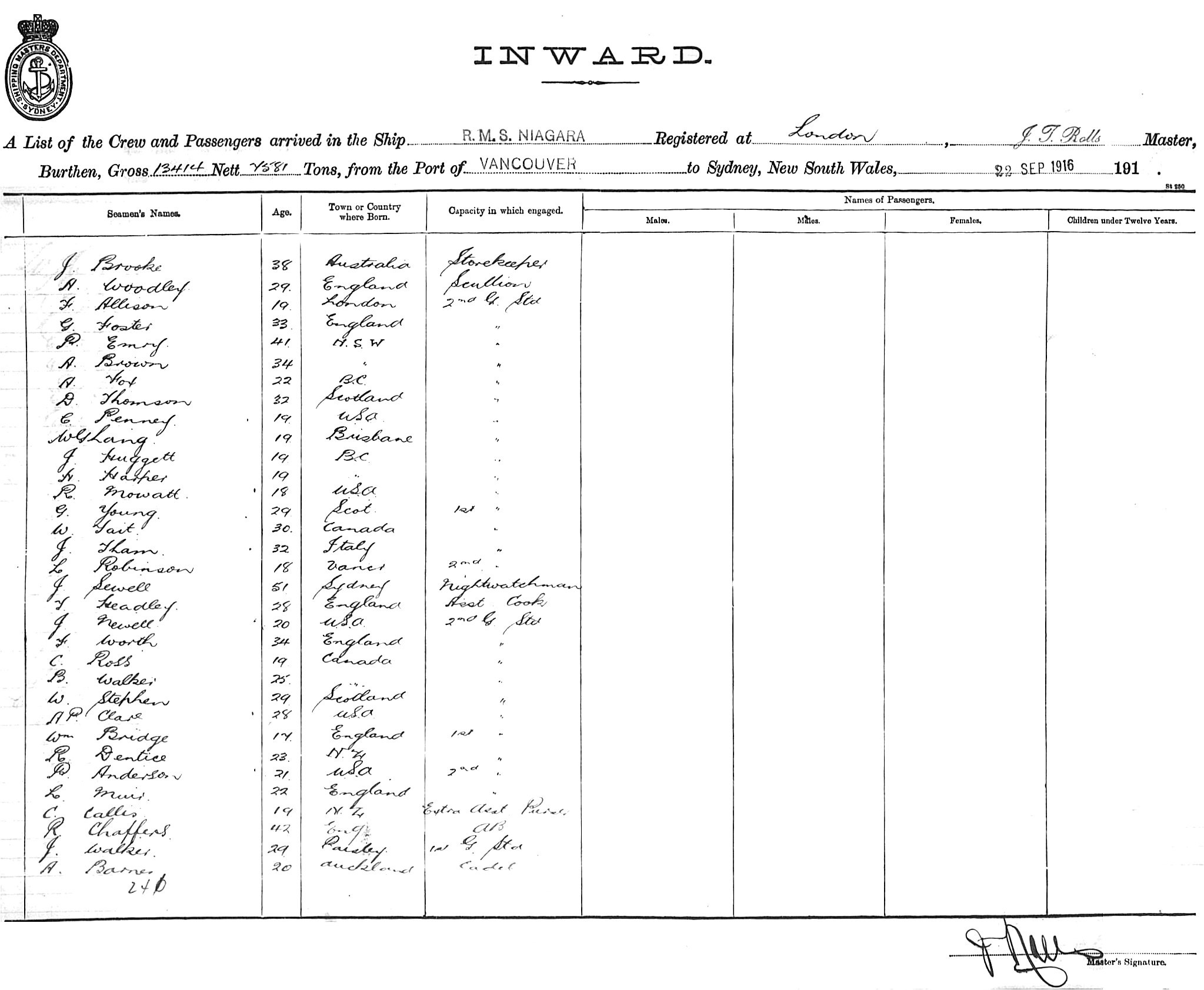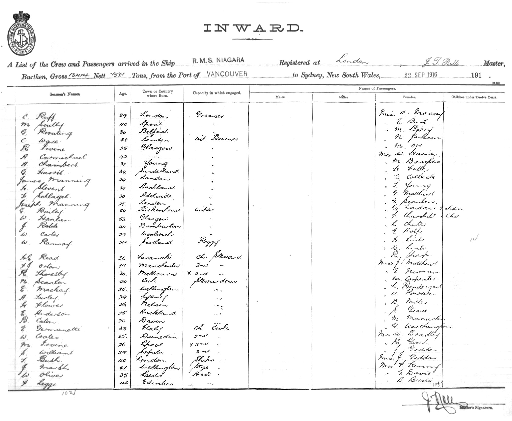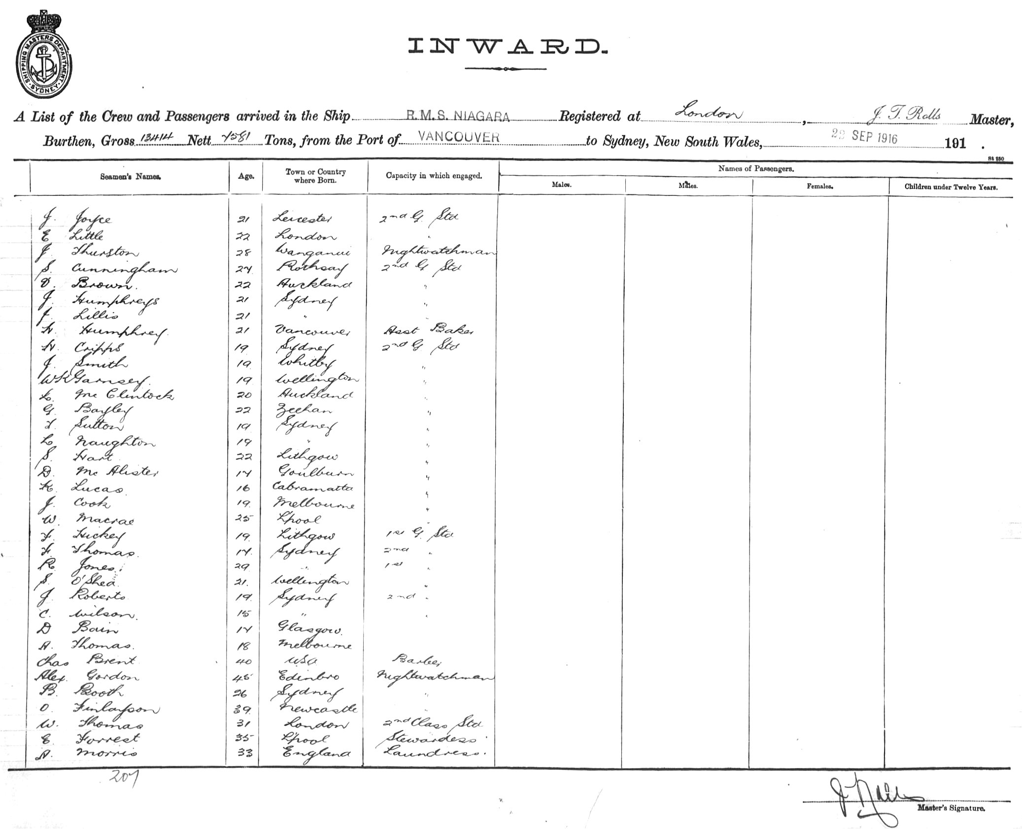 NIAGARAOF LONDON, J.T. ROLLS, MASTER, BURTHEN 13414/7581 TONS FROM THE PORT OF VANCOUVER TO SYDNEY, NEW SOUTH WALES, 22ND SEPTEMBER 1916 |