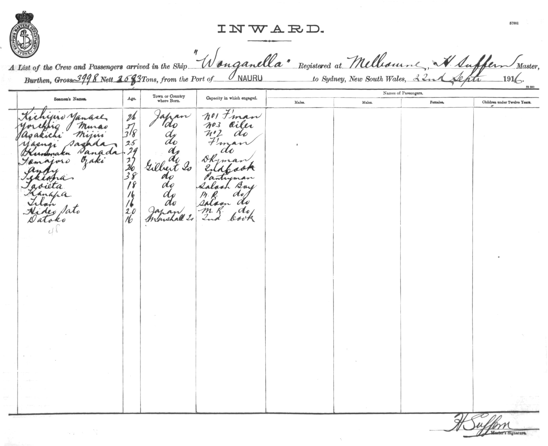 WONGANELLAOF MELBOURNE, H. SUFFERN, MASTER, BURTHEN 3998/2583 TONS FROM THE PORT OF NAURU TO SYDNEY, NEW SOUTH WALES, 22ND SEPTEMBER 1916 |