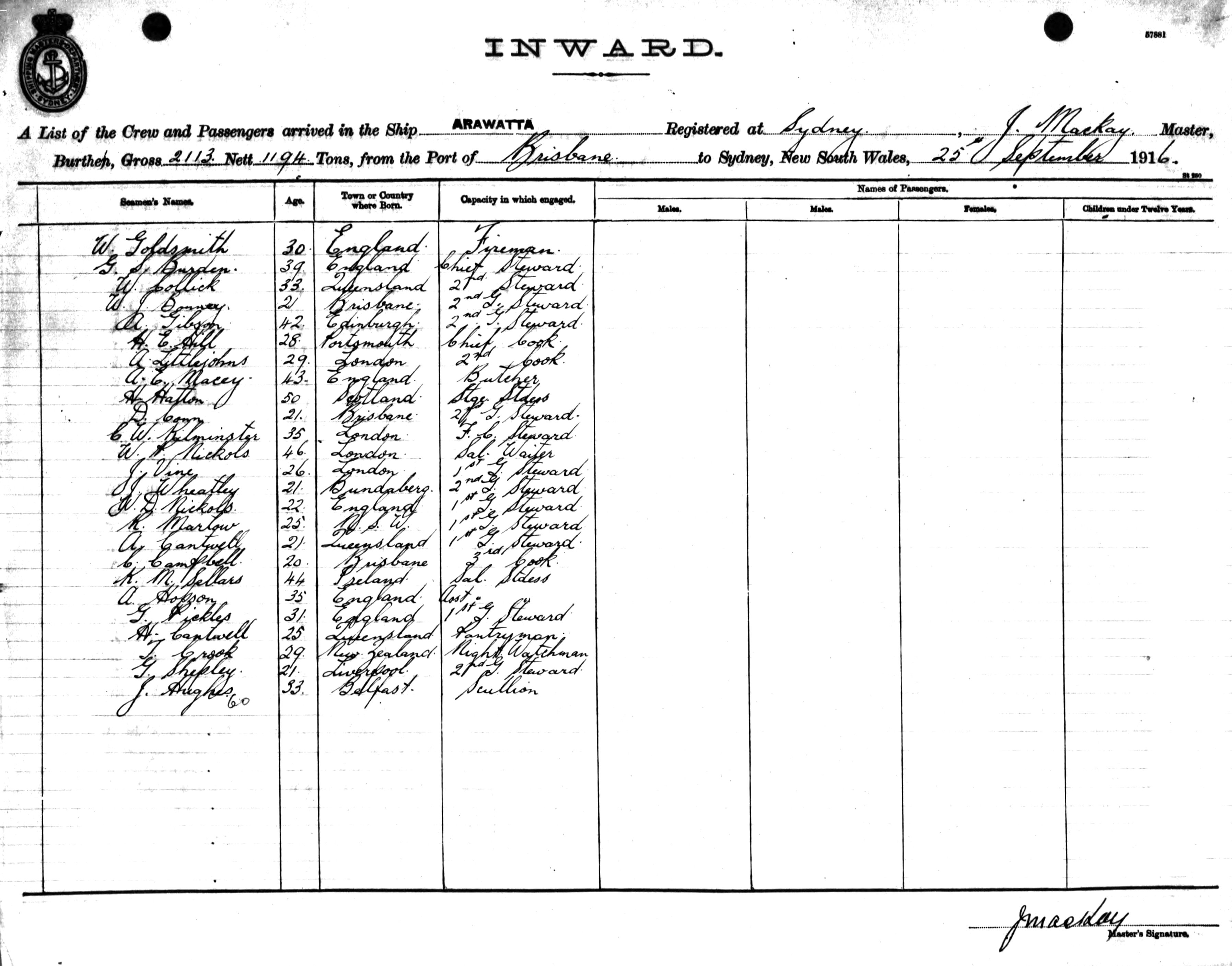 ARAWATTAOF SYDNEY, J. MACKAY, MASTER, BURTHEN 2113/1194 TONS FROM THE PORT OF BRISBANE TO SYDNEY, NEW SOUTH WALES, 25TH SEPTEMBER 1916 |