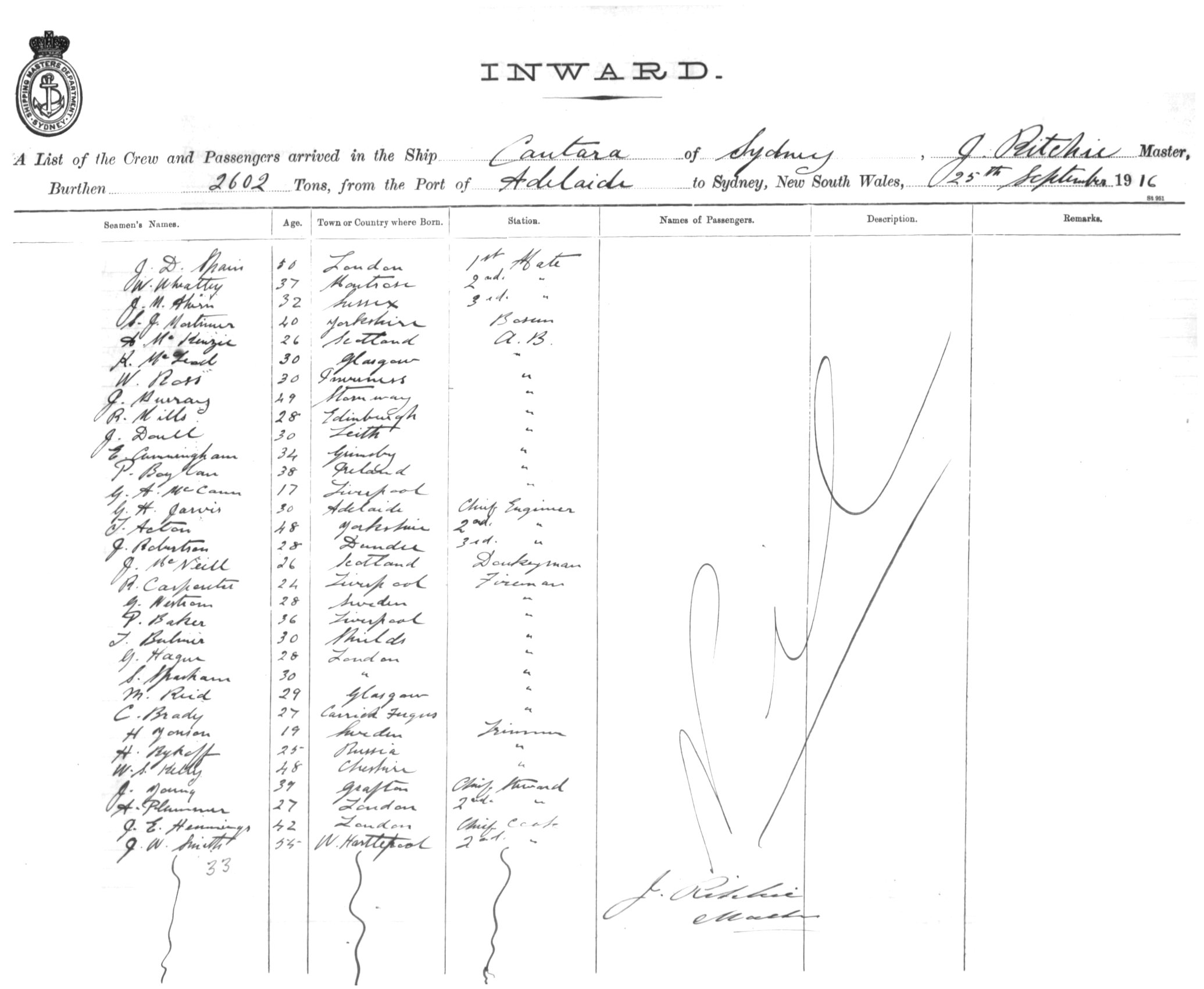 CANTARAOF SYDNEY, J. RITCHIE, MASTER, BURTHEN 2602 TONS FROM THE PORT OF ADELAIDE TO SYDNEY, NEW SOUTH WALES, 25TH SEPTEMBER 1916 |