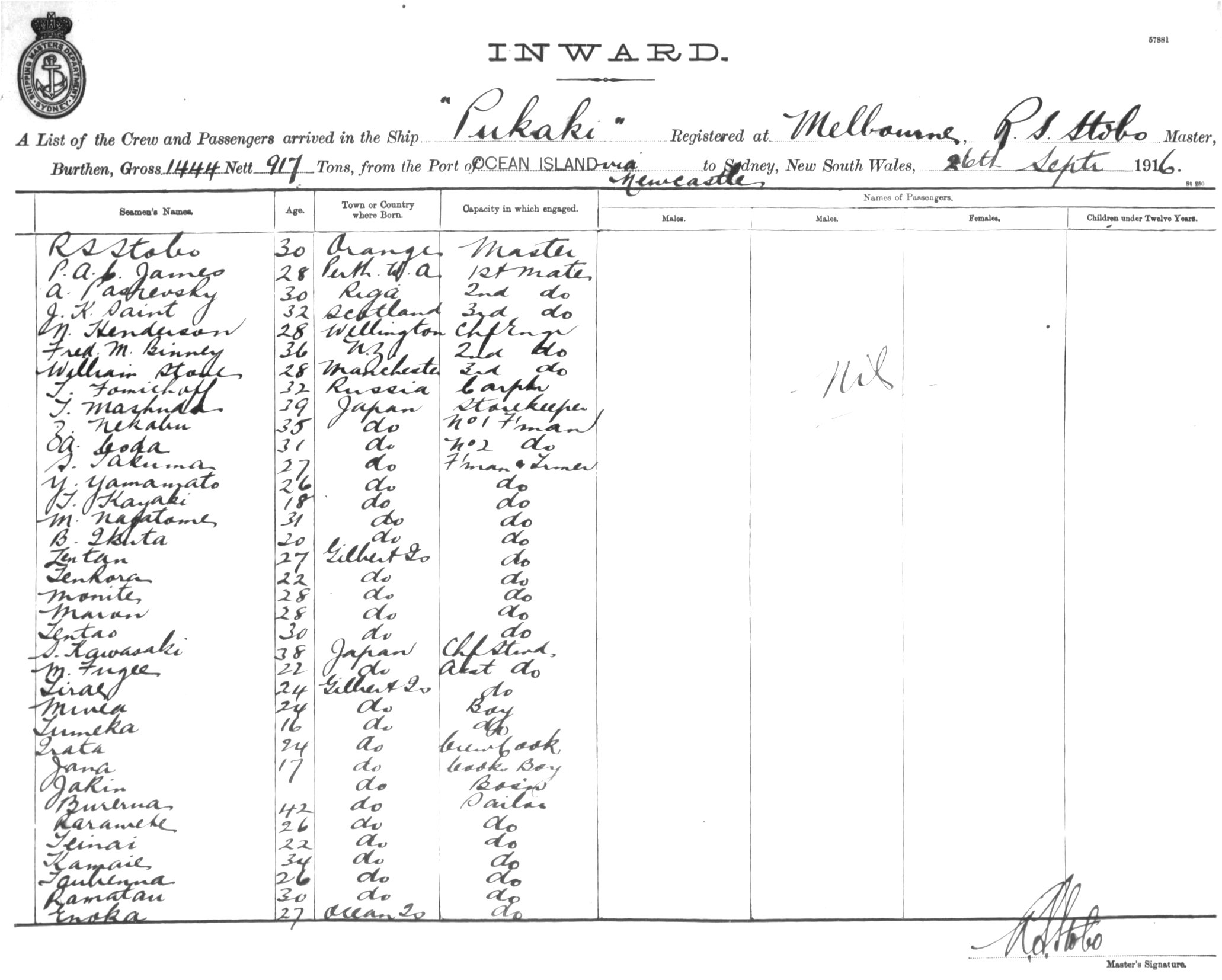 PUKAKIOF MELBOURNE, R.S. STOBO, MASTER, BURTHEN 1444/917 TONS FROM THE PORT OF OCEAN ISLAND VIA NEWCASTLE TO SYDNEY, NEW SOUTH WALES, 26TH SEPTEMBER 1916 |