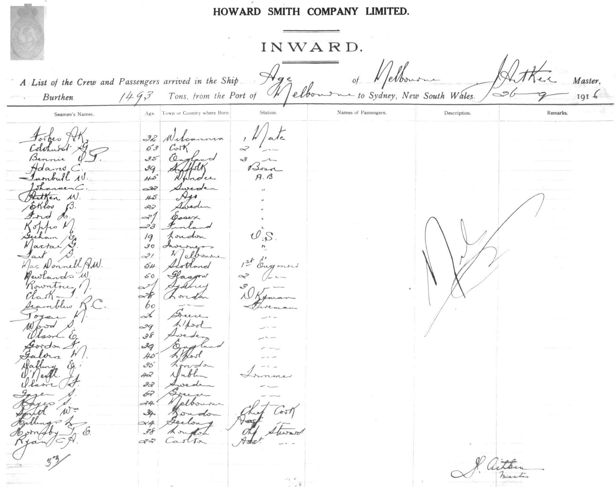 AGEOF MELBOURNE, J. AITKIN, MASTER, BURTHEN 1493 TONS FROM THE PORT OF MELBOURNE TO SYDNEY, NEW SOUTH WALES, 26TH SEPTEMBER 1916 |