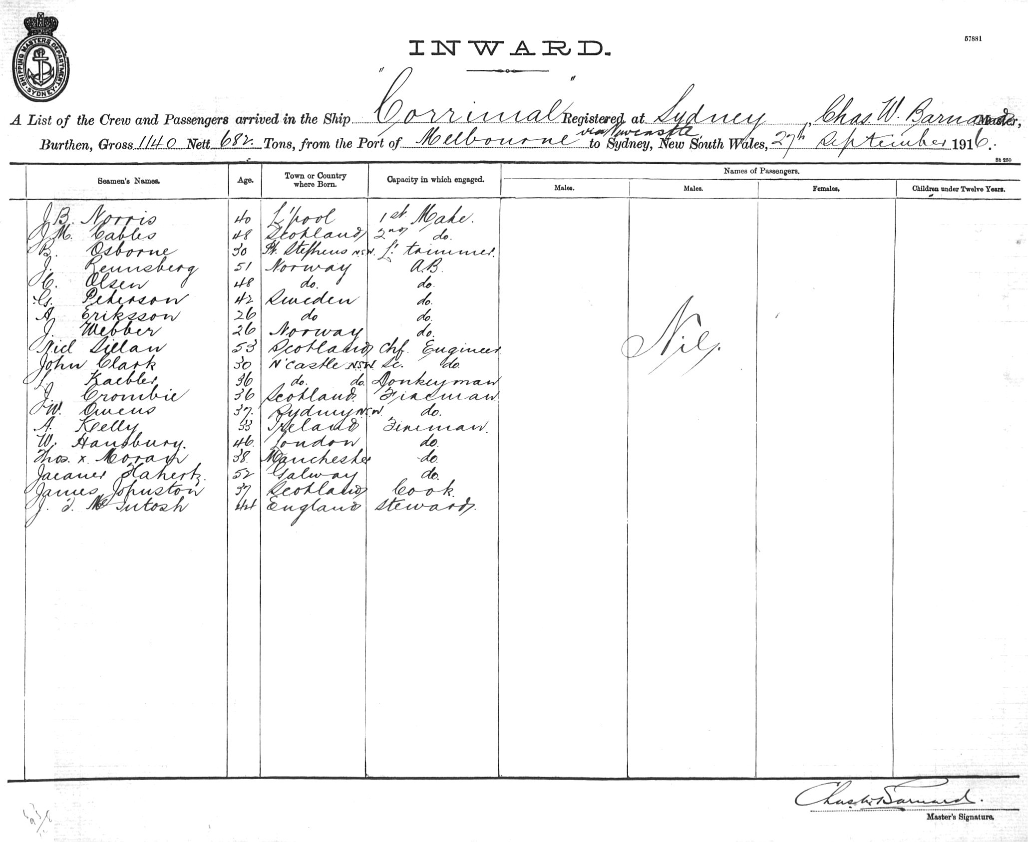 Mariners and ships in Australian Waters | CORRIMALOF SYDNEY, CHARLES W. BARNARD, MASTER, BURTHEN 1140/682 TONS FROM THE PORT OF MELBOURNE TO SYDNEY, NEW SOUTH WALES, 27TH SEPTEMBER 1916 |