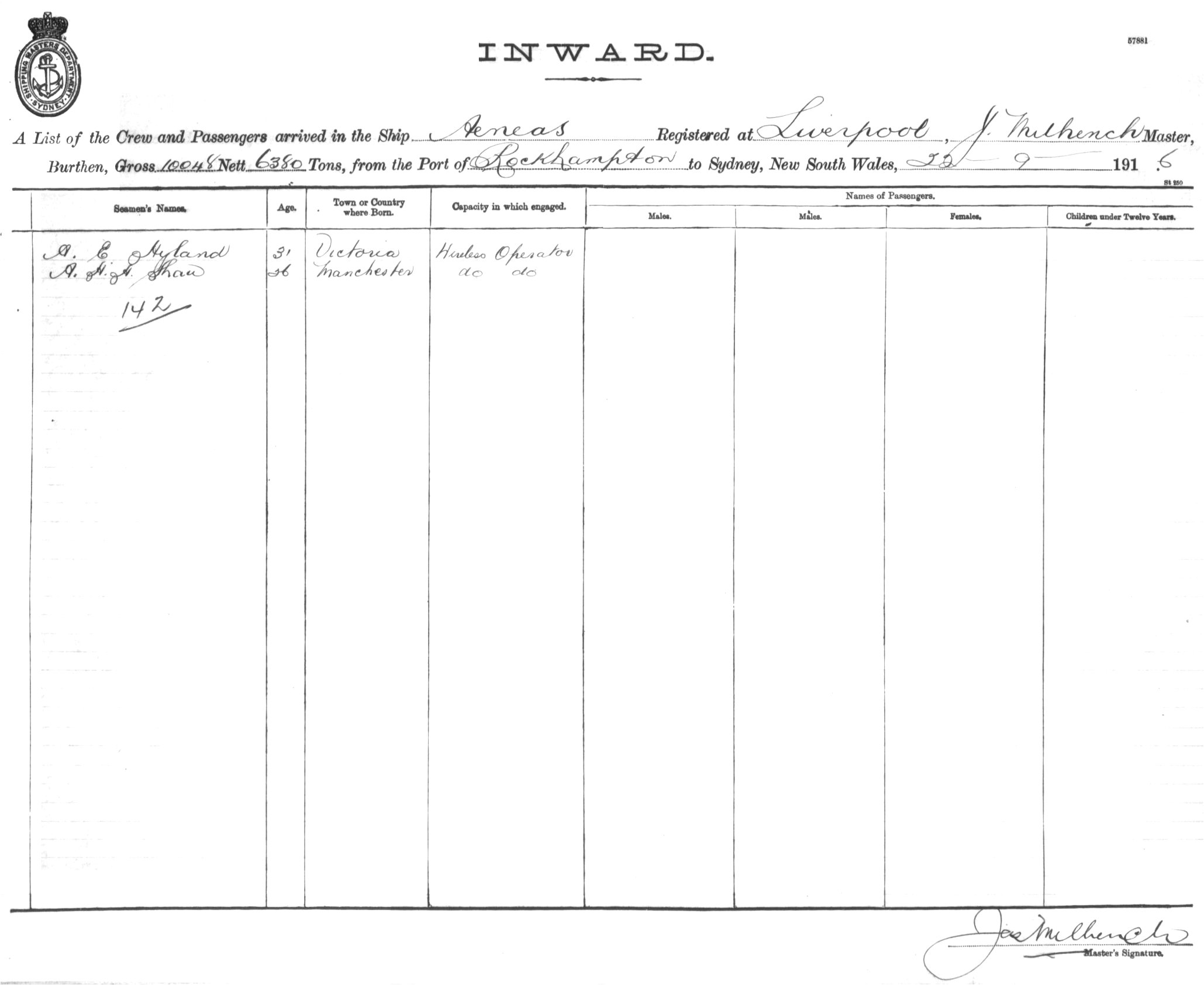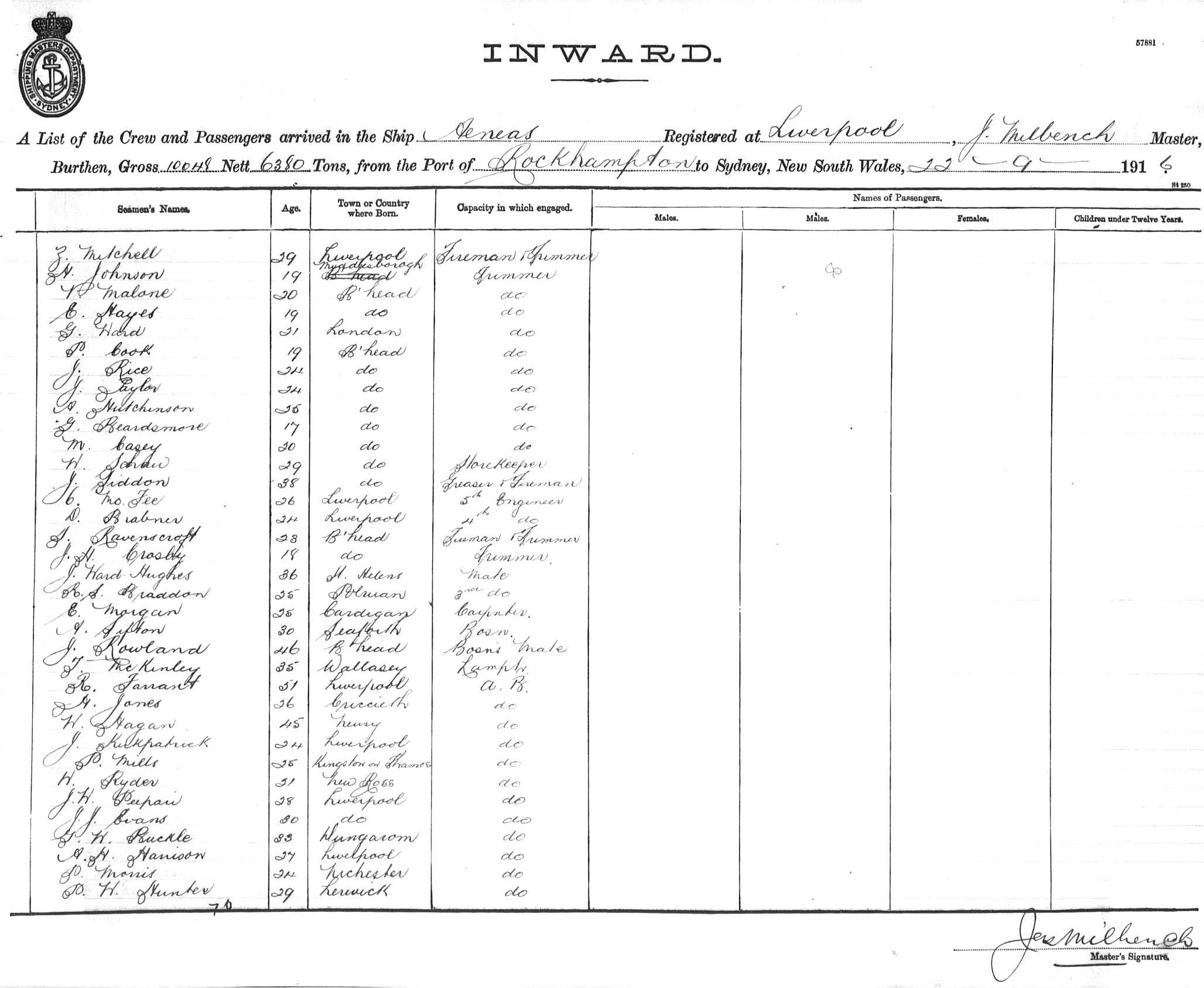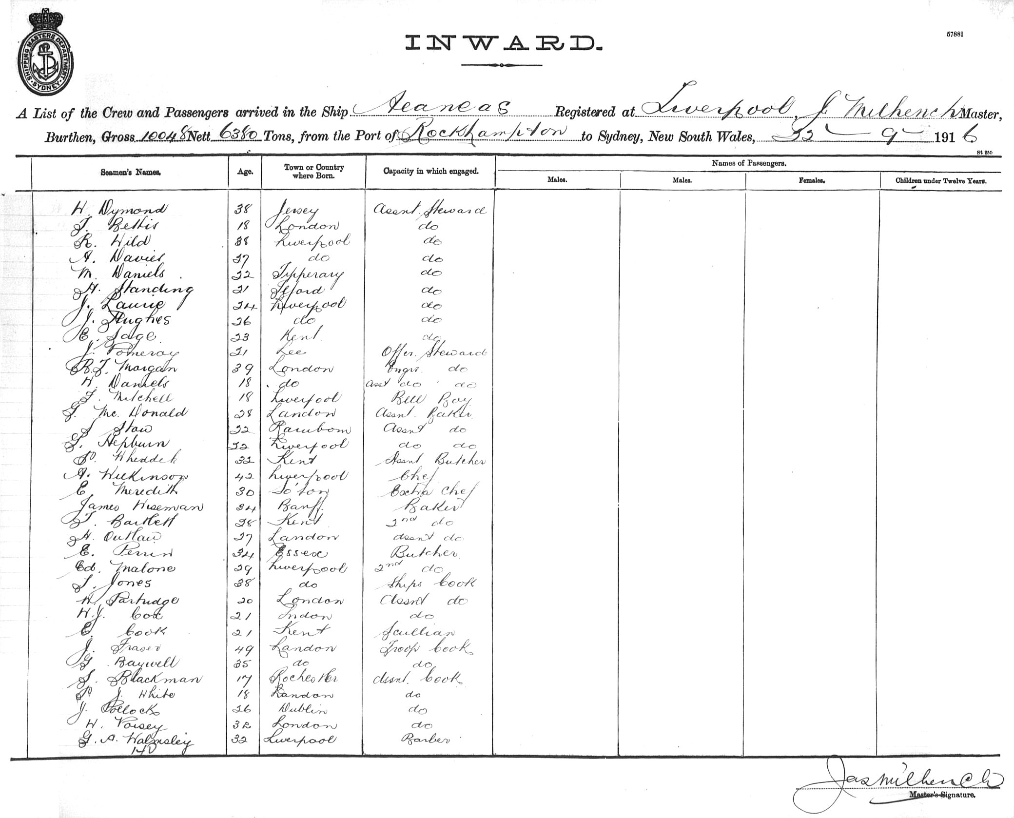 AENEASOF LIVERPOOL, J. MILBENCH, MASTER, BURTHEN 10048/6380 TONS FROM THE PORT OF ROCKHAMPTON TO SYDNEY, NEW SOUTH WALES, 22ND SEPTEMBER 1916 |