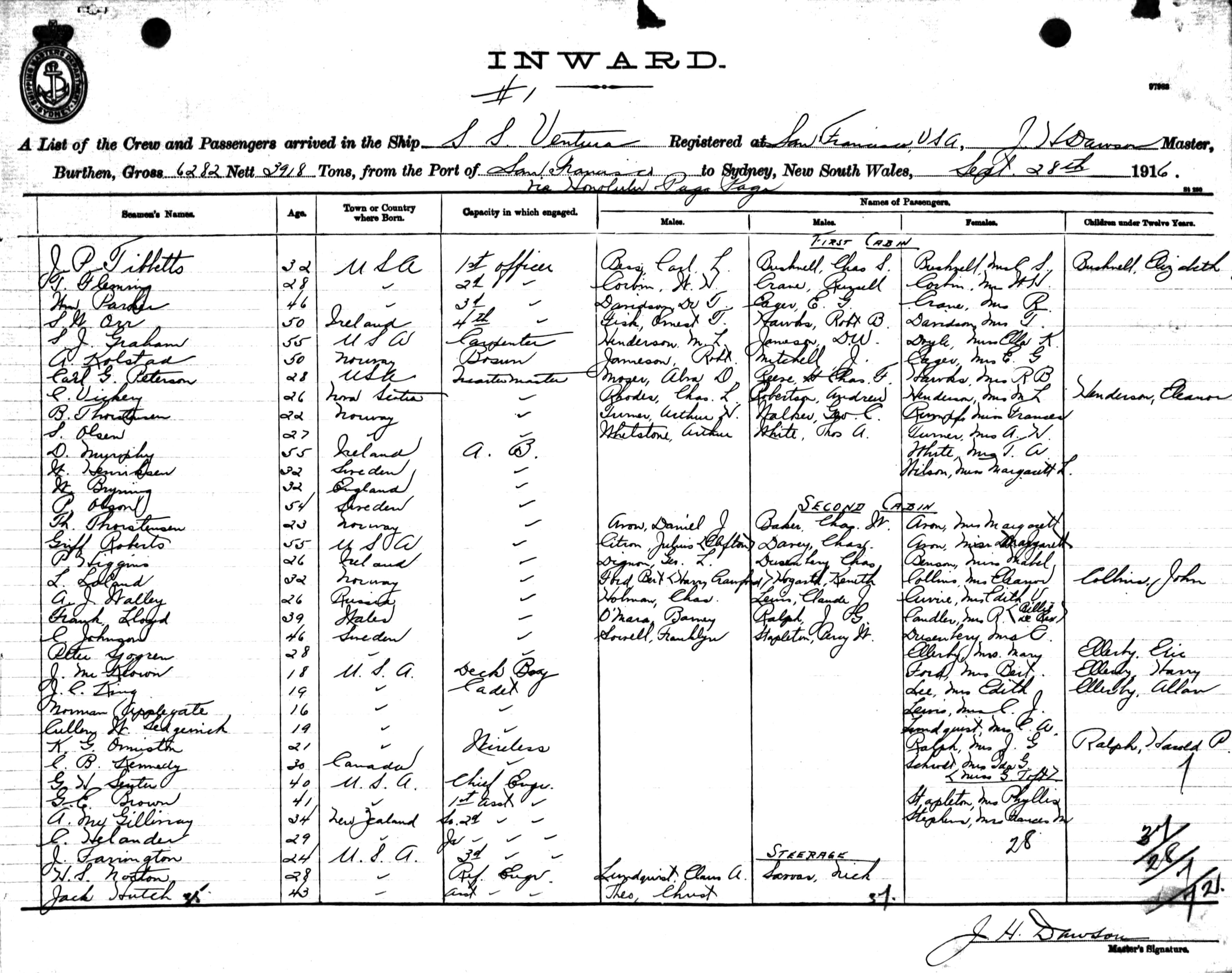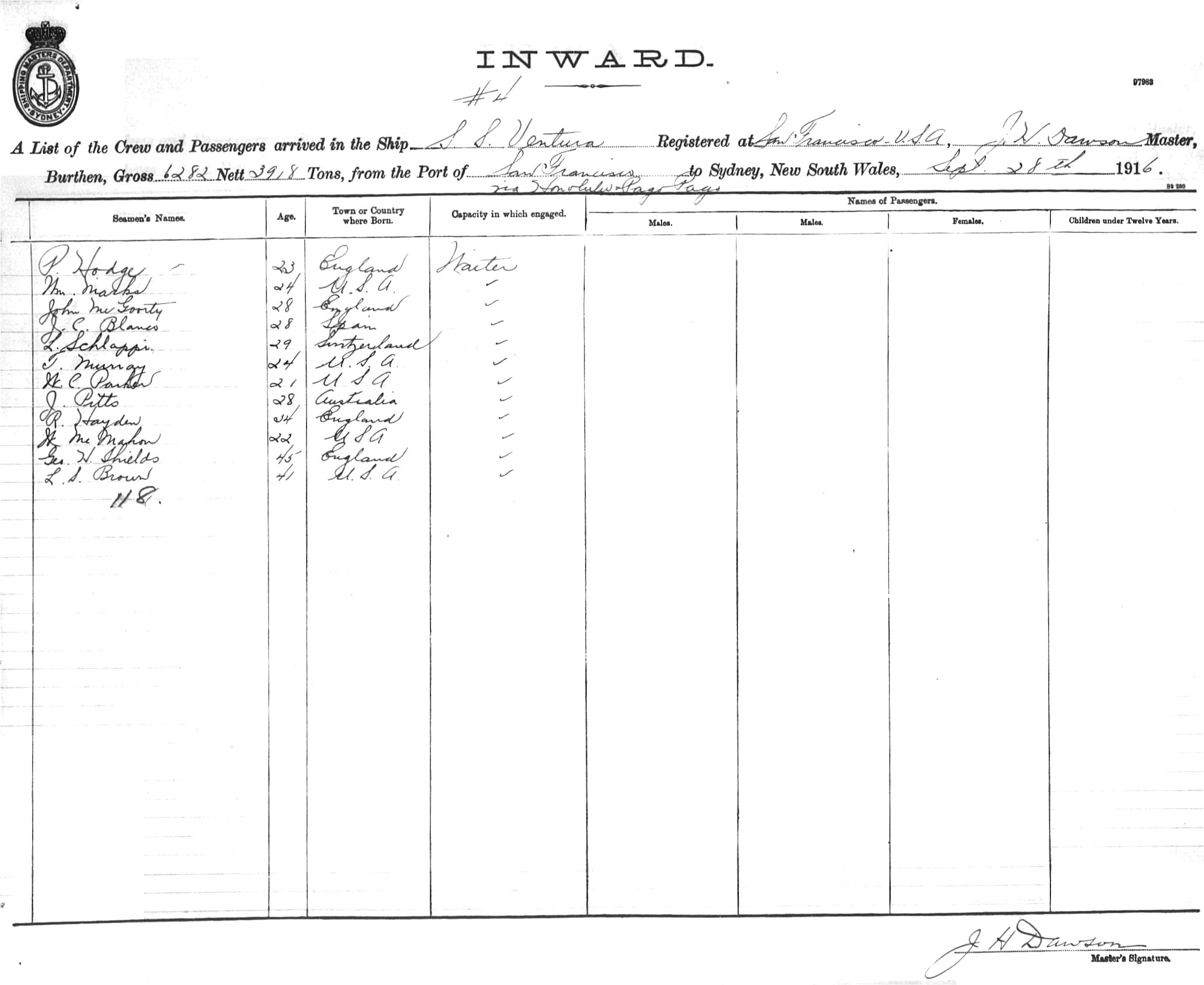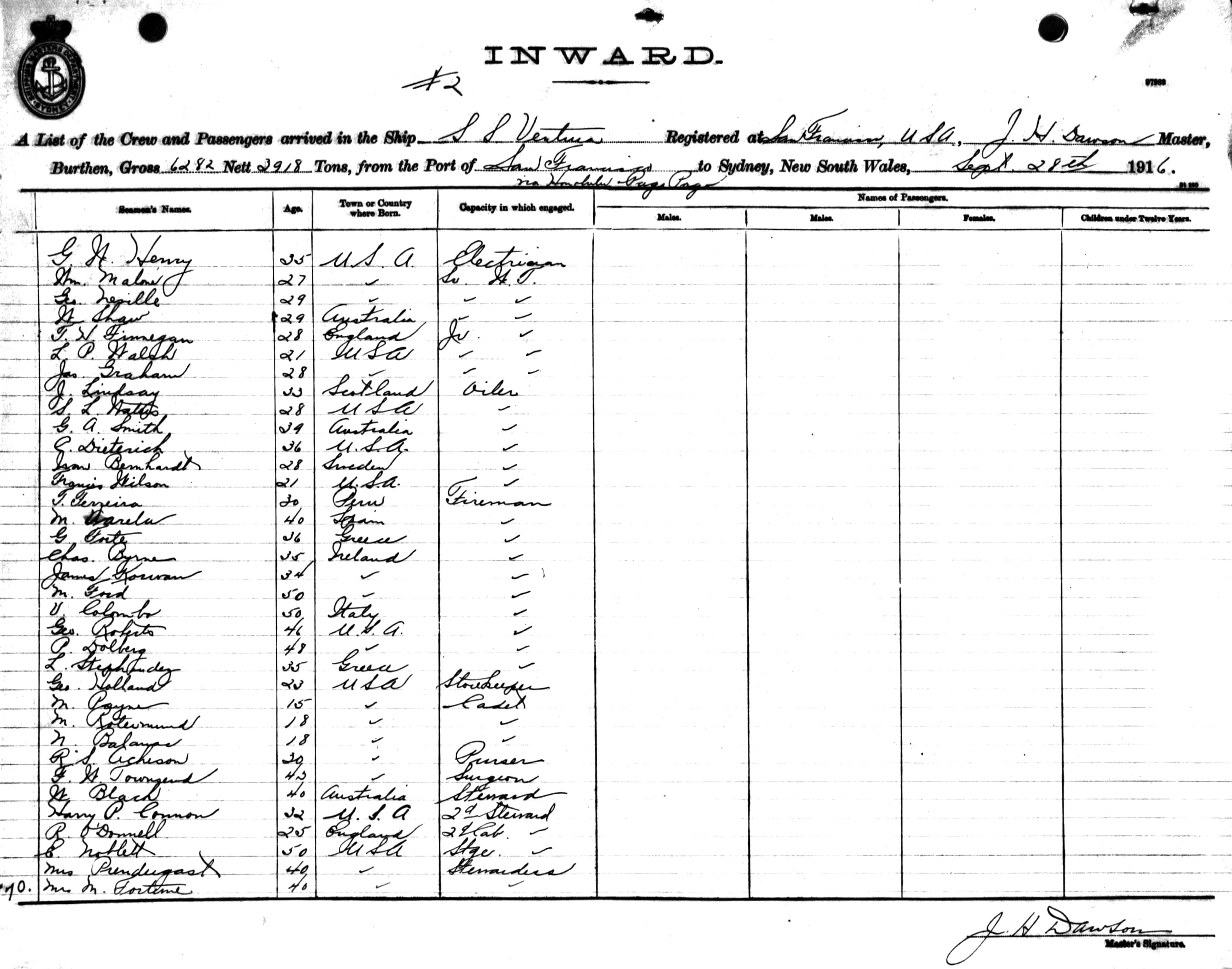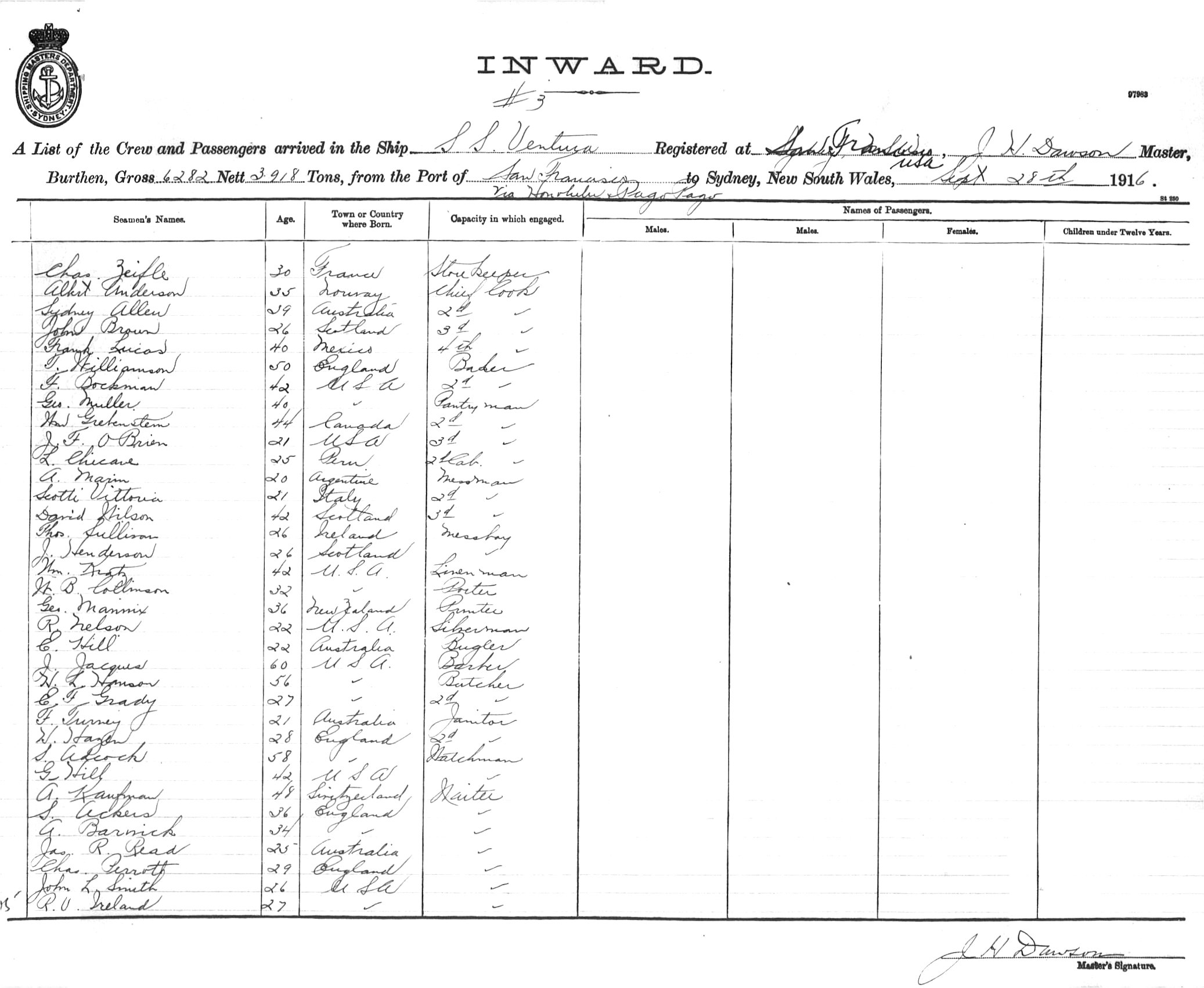 VENTURAOF SAN FRANCISCO, J.H. DAWSON, MASTER, BURTHEN 6282/3918 TONS FROM THE PORT OF SAN FRANCISCO VIA HONOLULU & PAGO PAGO TO SYDNEY, NEW SOUTH WALES, 28TH SEPTEMBER 1916 |
