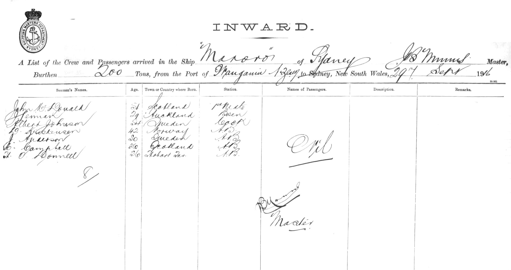 MAROROOF SYDNEY, J.B. MUNNS, MASTER, BURTHEN 200 TONS FROM THE PORT OF WANGANUI, N.Z. TO SYDNEY, NEW SOUTH WALES, 29TH SEPTEMBER 1916 |