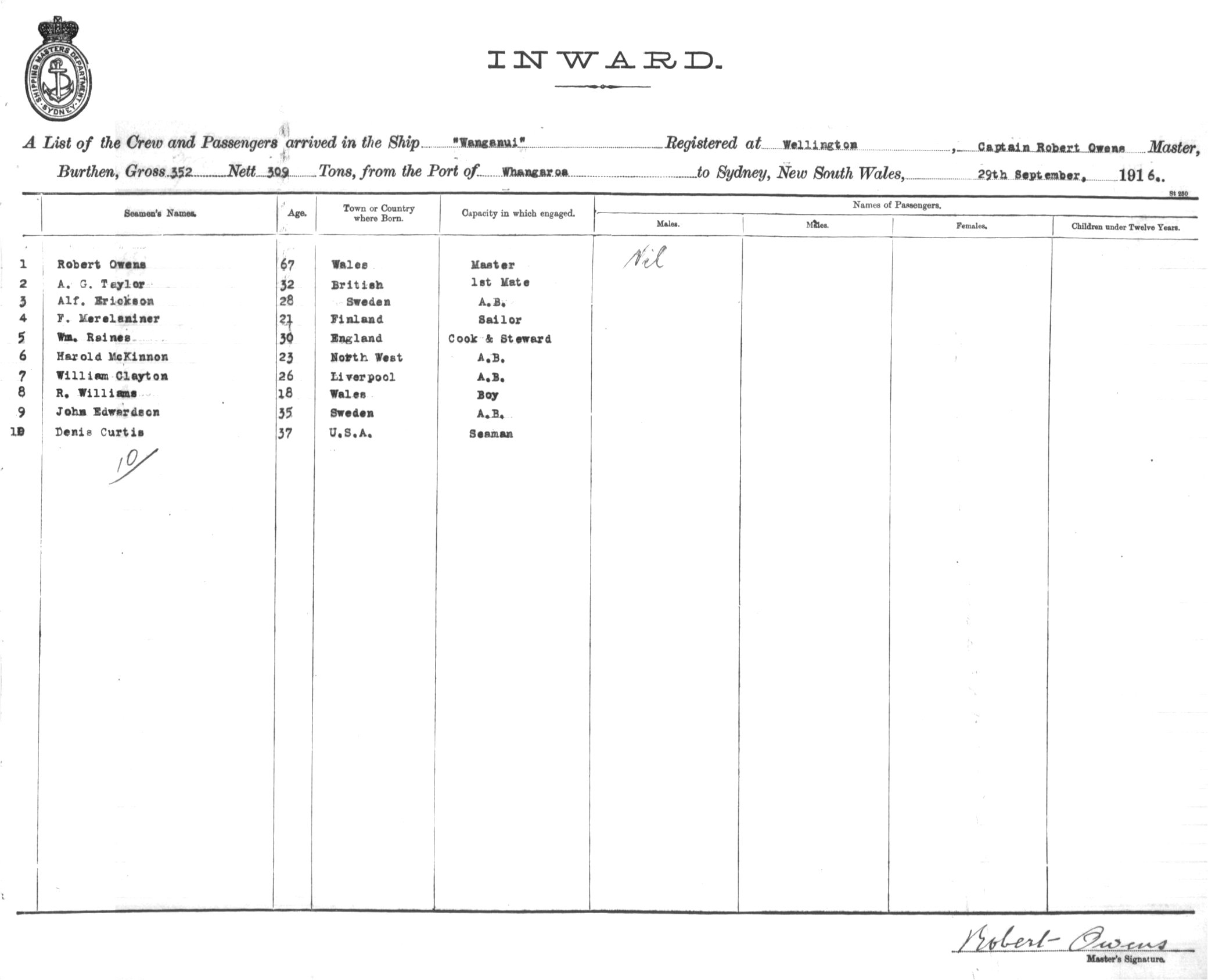 WANGANUIOF WELLINGTON, ROBERT OWENS, MASTER, BURTHEN 352/309 TONS FROM THE PORT OF WHANGAROA, N.Z. TO SYDNEY, NEW SOUTH WALES, 29TH SEPTEMBER 1916 |