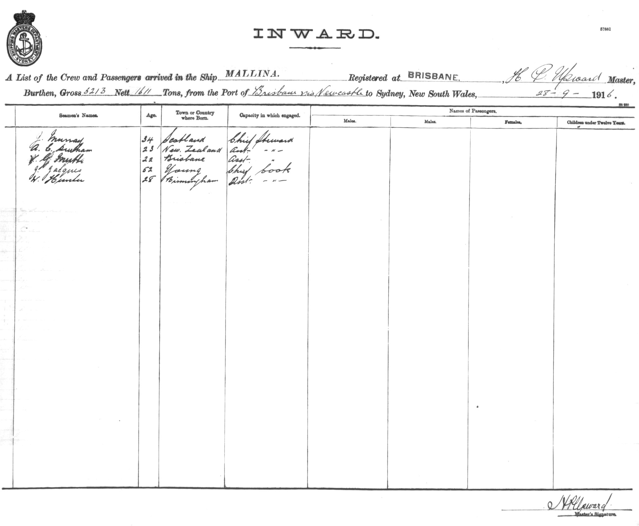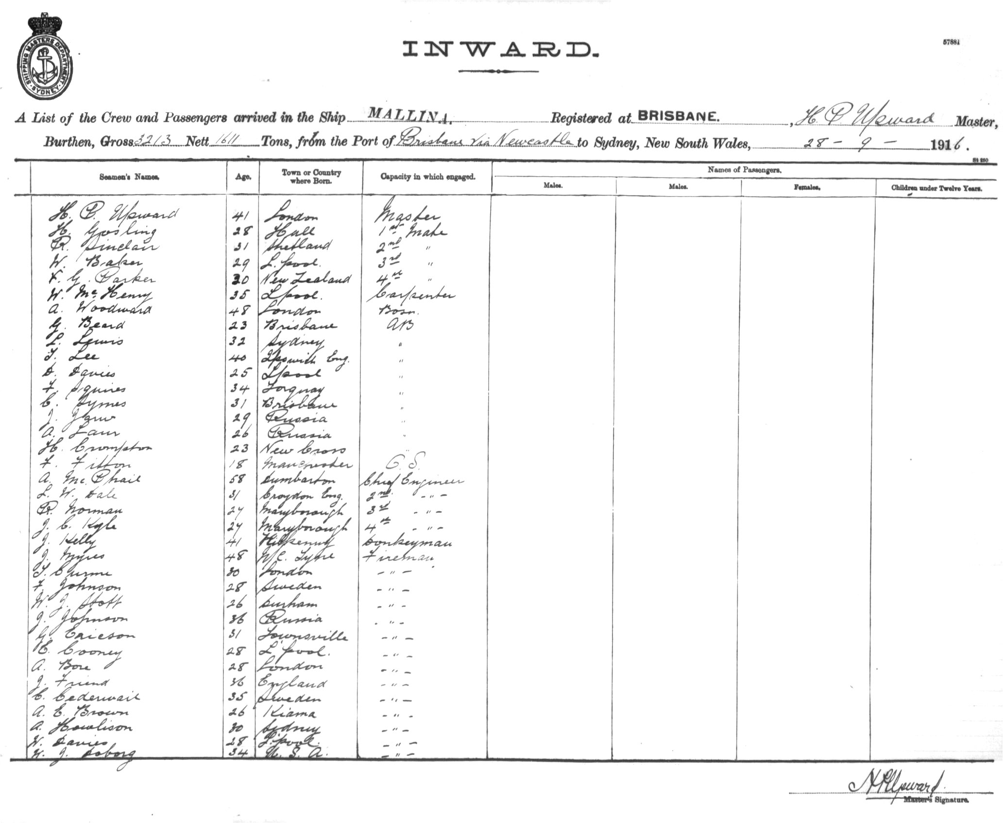 Mariners and ships in Australian Waters | MALLINAOF BRISBANE, H.P. UPWARD, MASTER, BURTHEN 3213/1611 TONS FROM THE PORT OF BRISBANE VIA NEWCASTLE TO SYDNEY, NEW SOUTH WALES, 28TH SEPTEMBER 1916 |