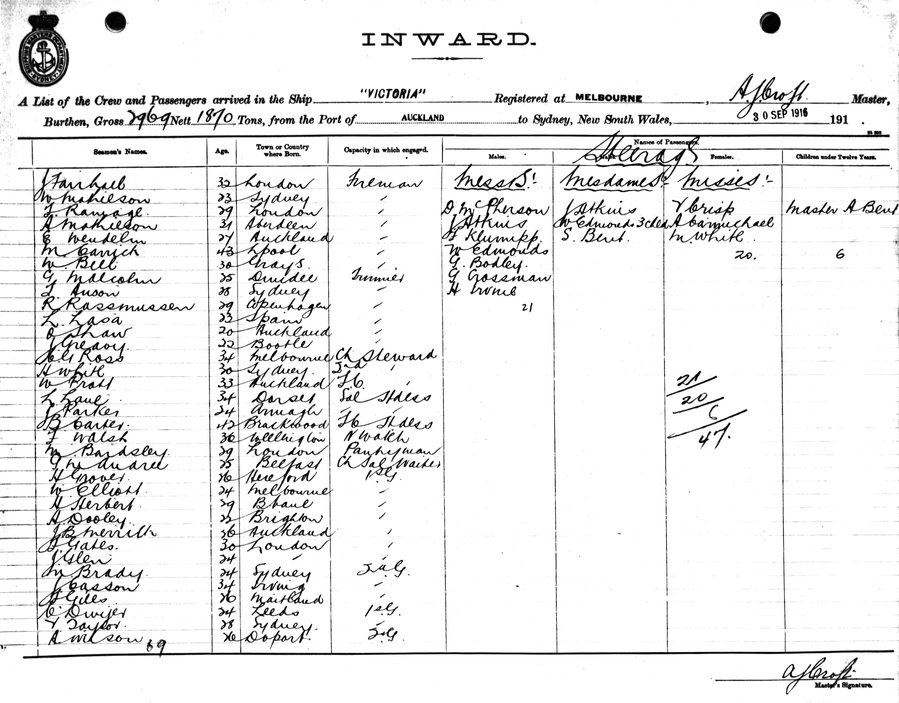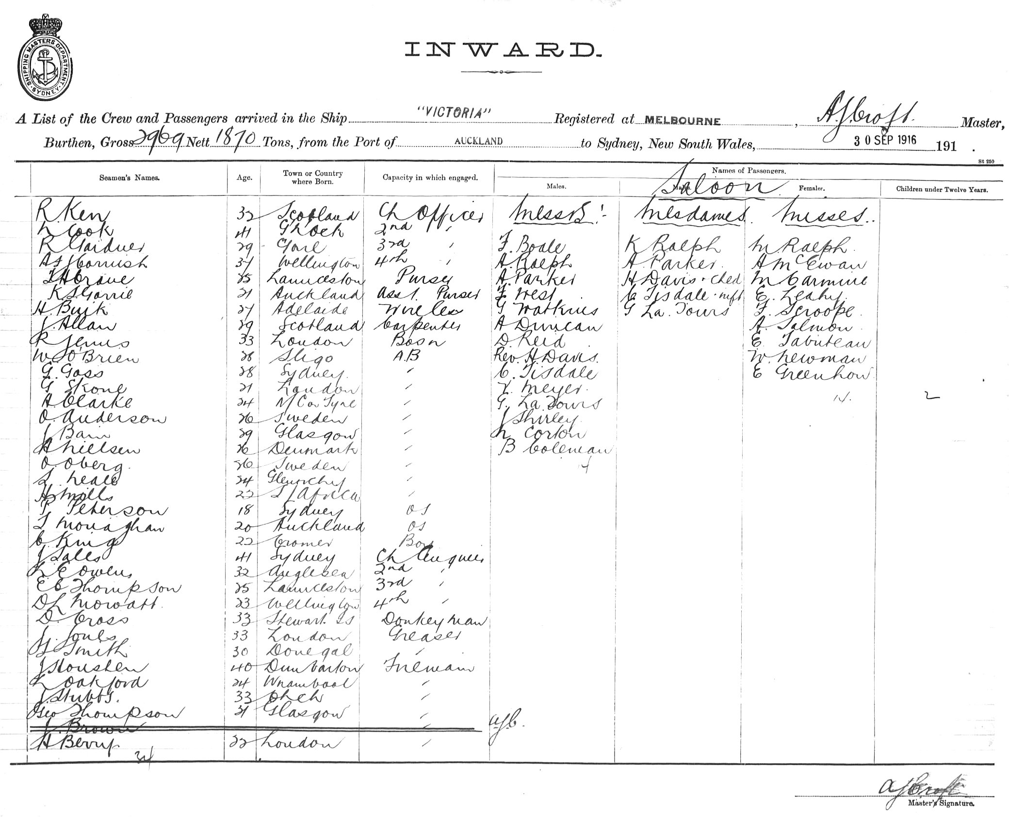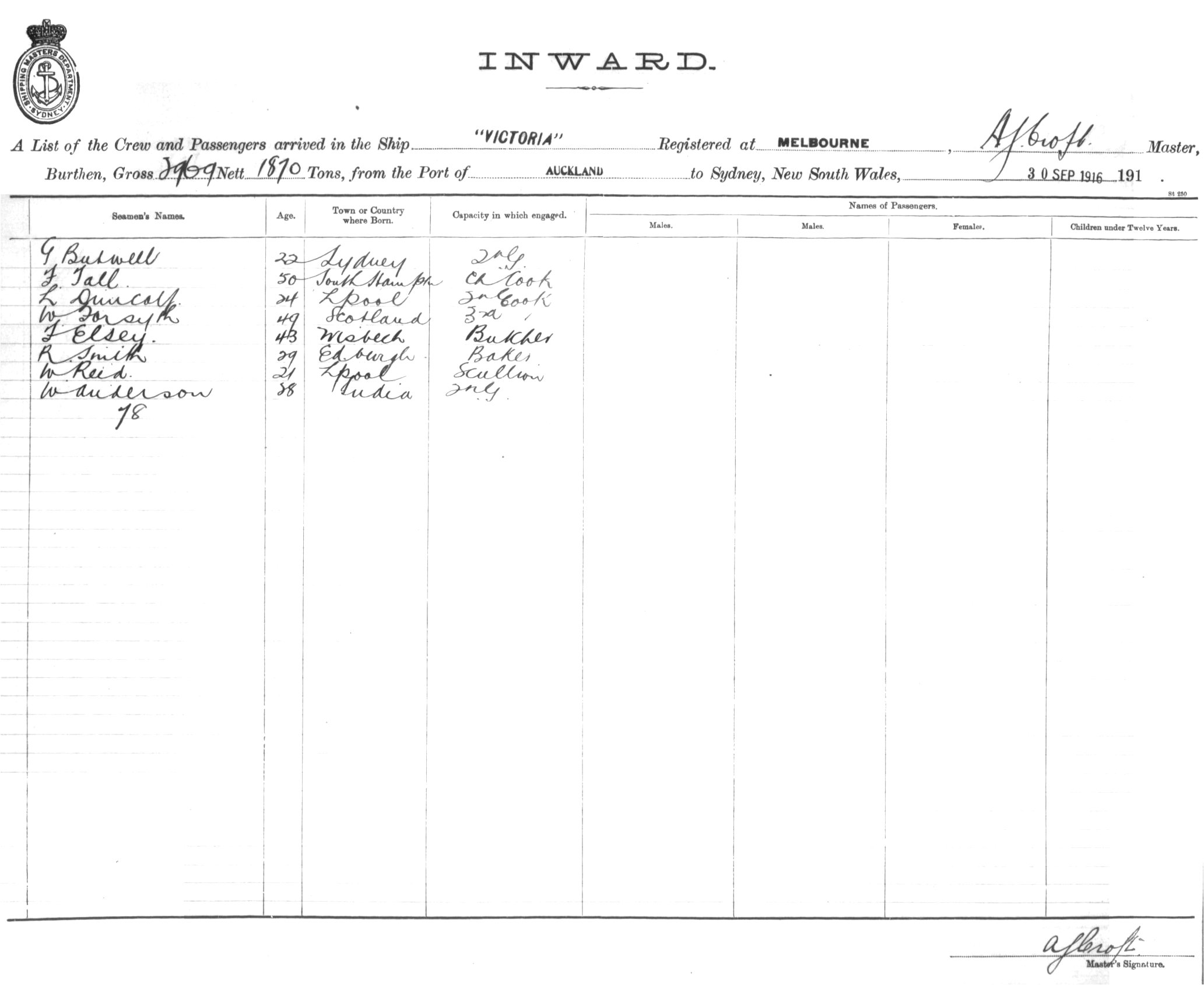 VICTORIAOF MELBOURNE, A.J. CROFT, MASTER, BURTHEN 2969/1870 TONS FROM THE PORT OF AUCKLAND TO SYDNEY, NEW SOUTH WALES, 30TH SEPTEMBER 1916 |
