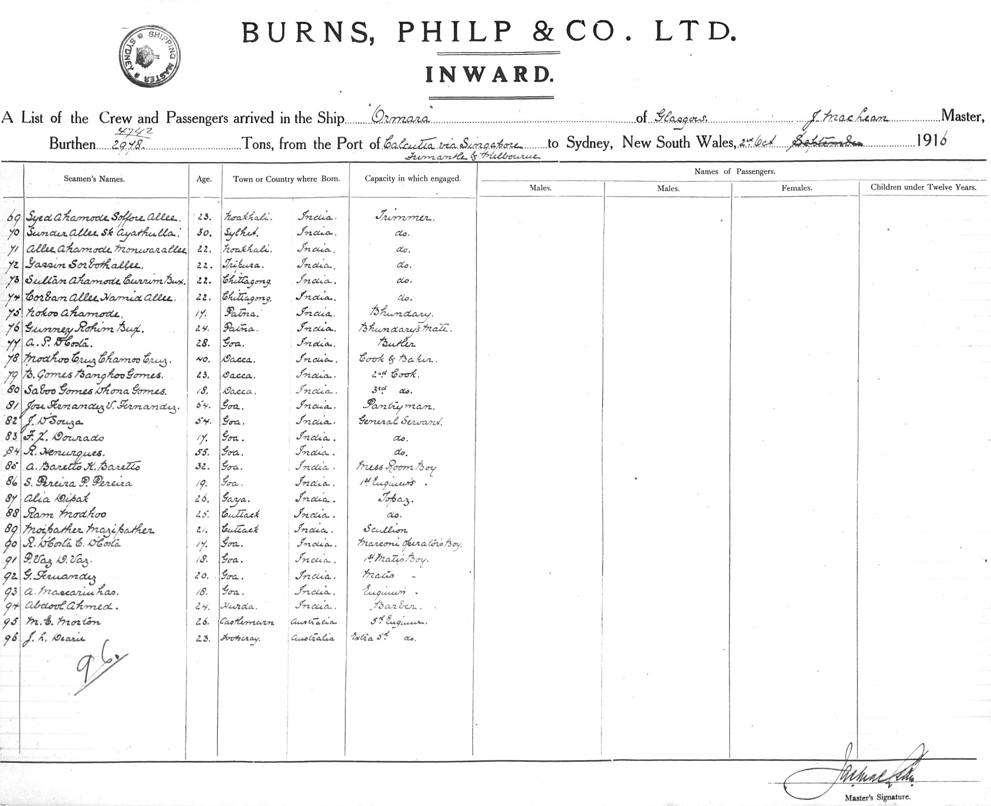 ORMARAOF GLASGOW, J. MACLEAN, MASTER, BURTHEN 4742/2978 TONS FROM THE PORT OF CALCUTTA via SINGAPORE, FREMANTLE & MELBOURNE TO SYDNEY, NEW SOUTH WALES, 2ND OCTOBER 1916 |
