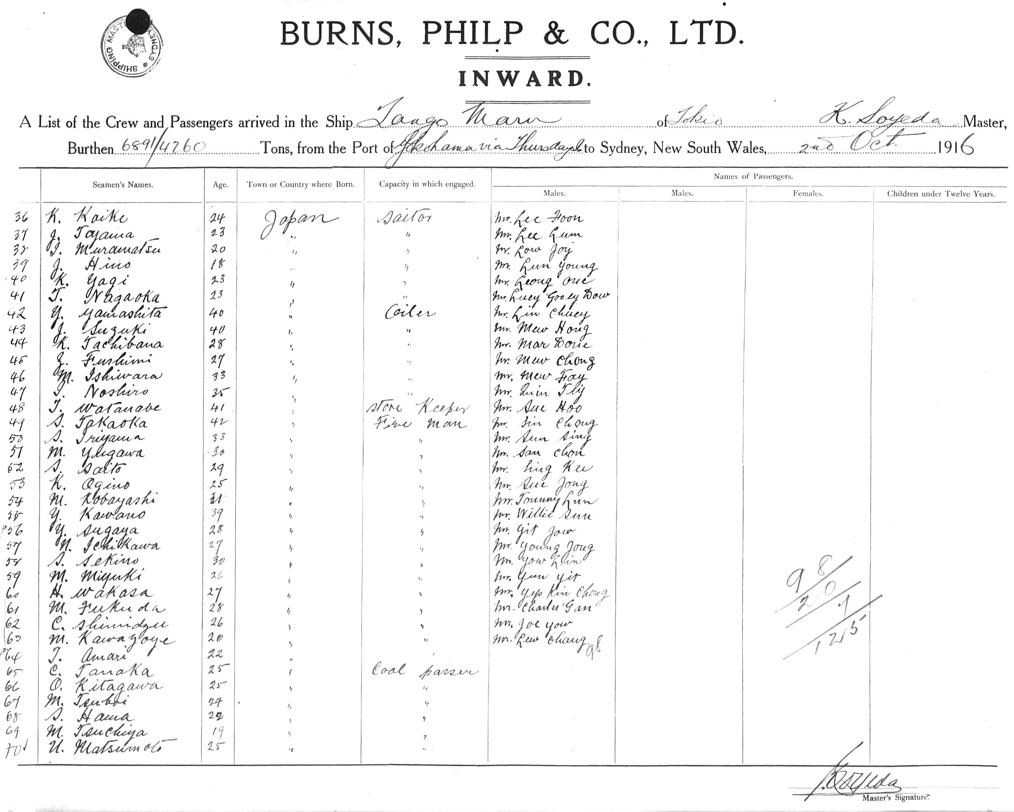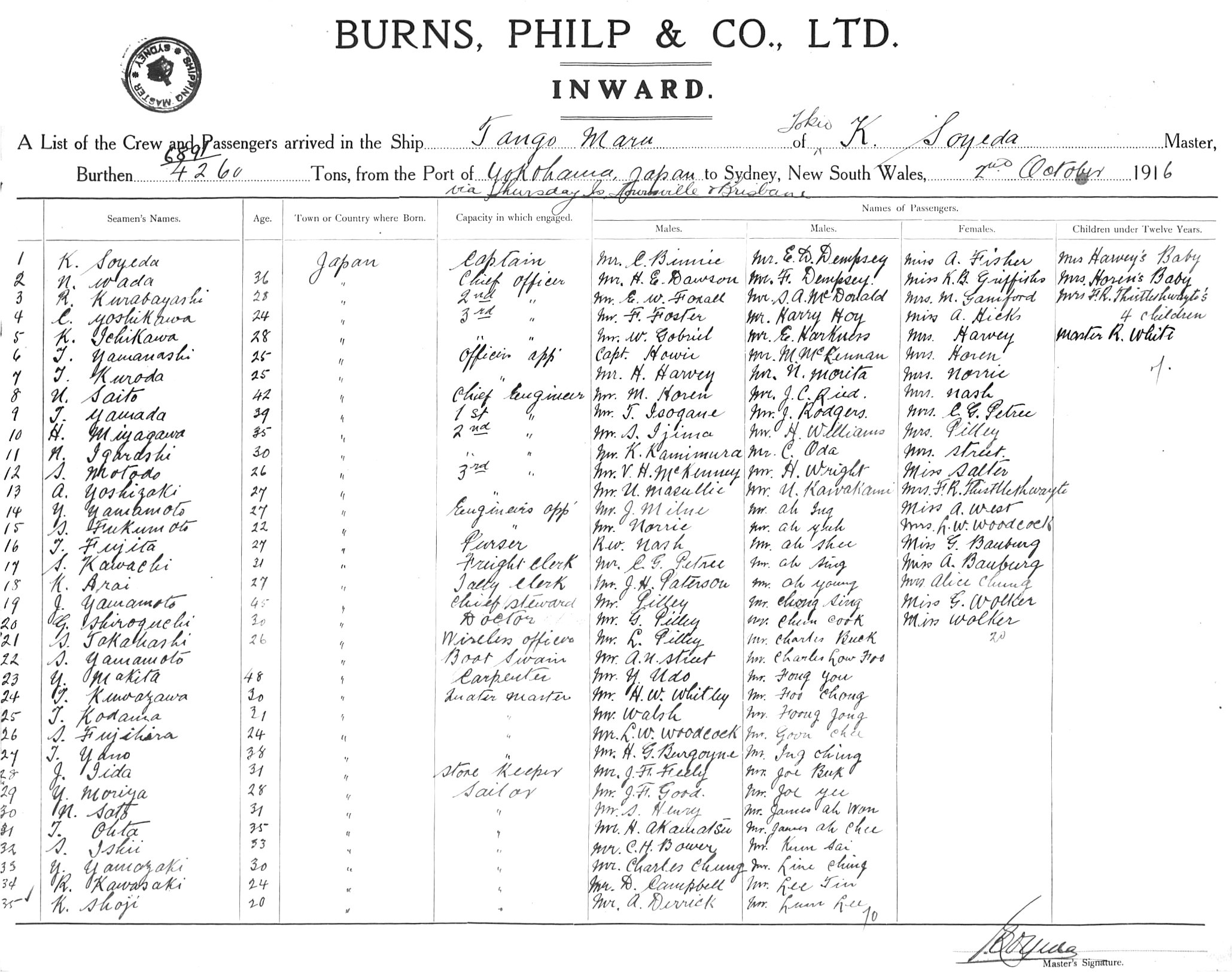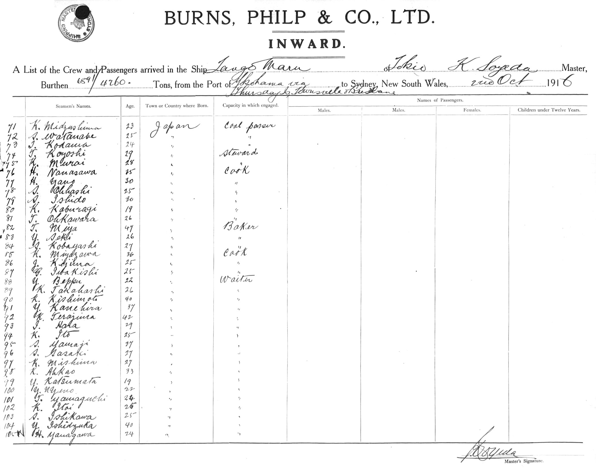 TANGO MARUOF TOKYO, K. SOYEDA, MASTER, BURTHEN 6891.4260 TONS FROM THE PORT OF YOKOHAMA via THURSDAY ISLAND, TOWNSVILLE & BRISBANE TO SYDNEY, NEW SOUTH WALES, 2ND OCTOBER 1916 |