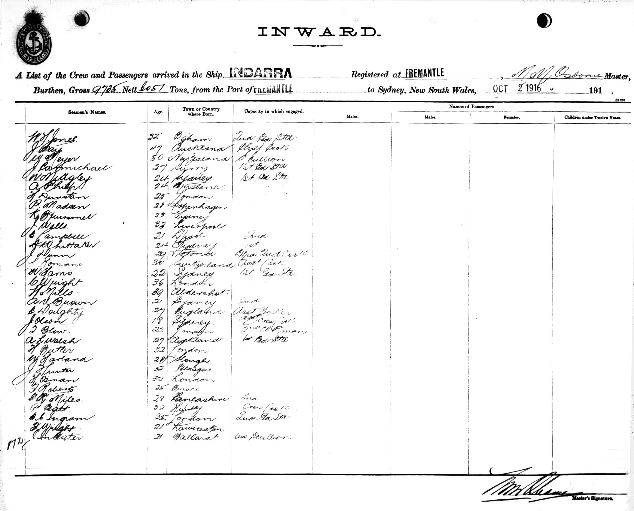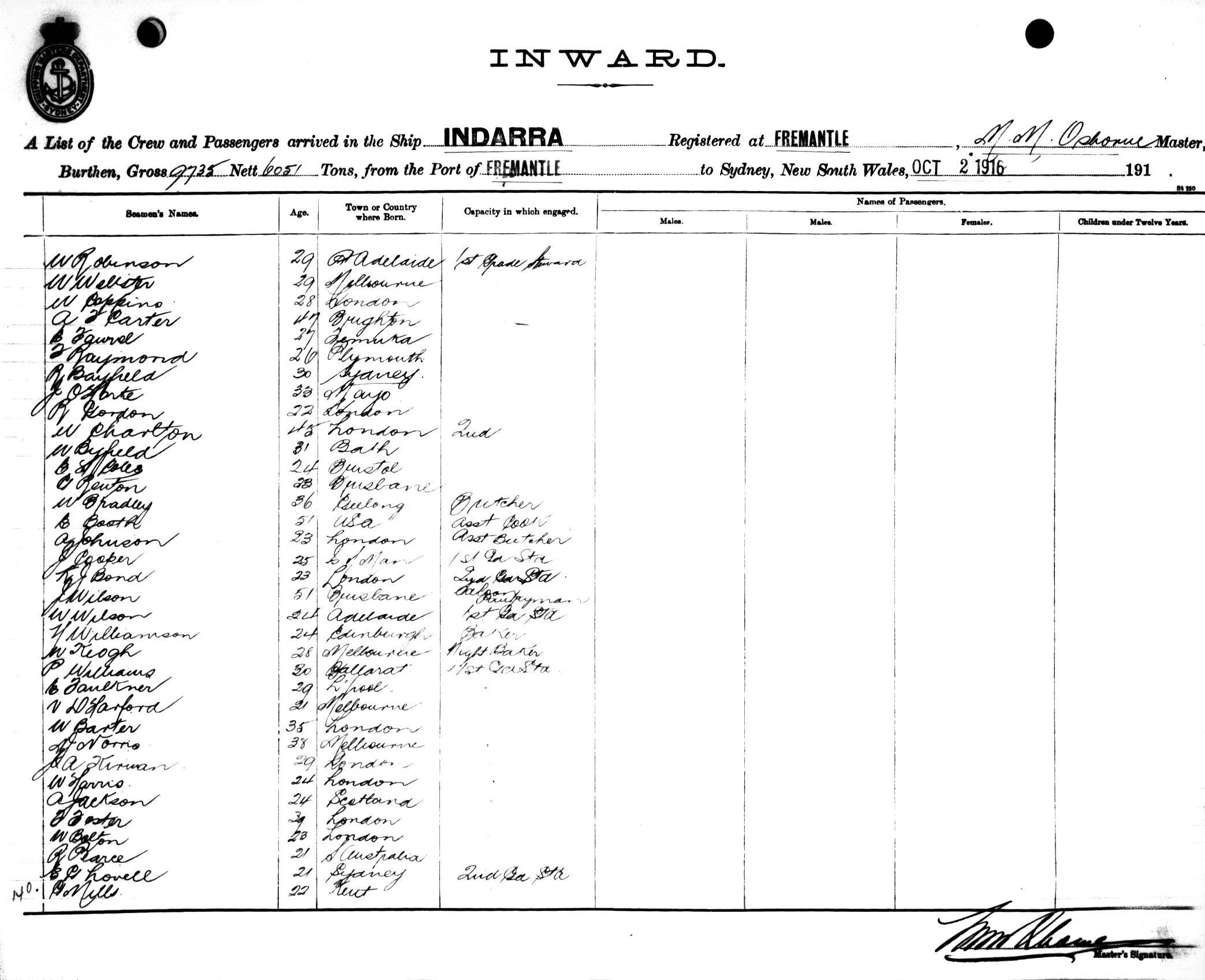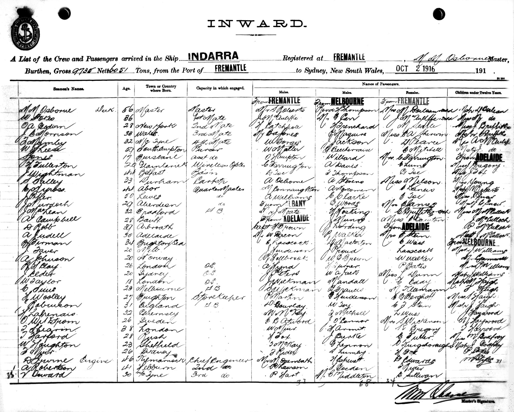 INDARRAOF FREMANTLE, M. M. OSBORNE, MASTER, BURTHEN 9735/6051 TONS FROM THE PORT OF FREMANTLE TO SYDNEY, NEW SOUTH WALES, 2ND OCTOBER 1916 |
