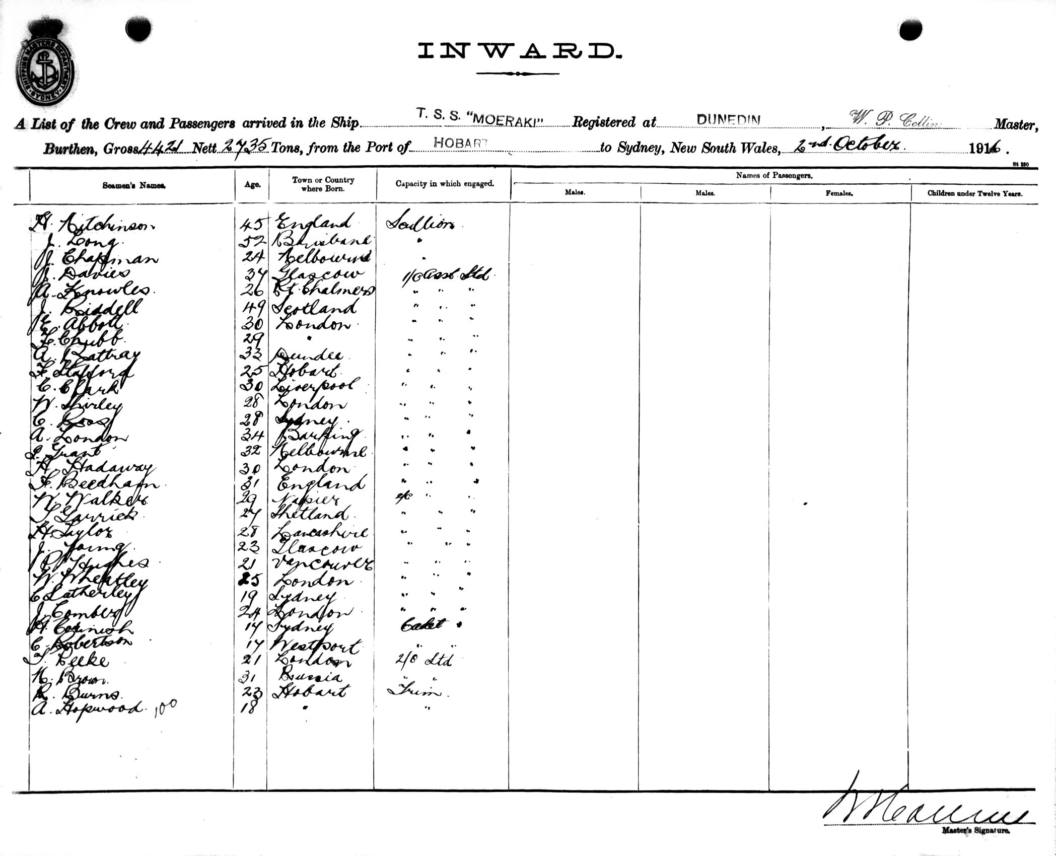 MOERAKIOF DUNEDIN, W. P. COLLINS, MASTER, BURTHEN 4421/2735 TONS FROM THE PORT OF HOBART TO SYDNEY, NEW SOUTH WALES, 2ND OCTOBER 1916 |