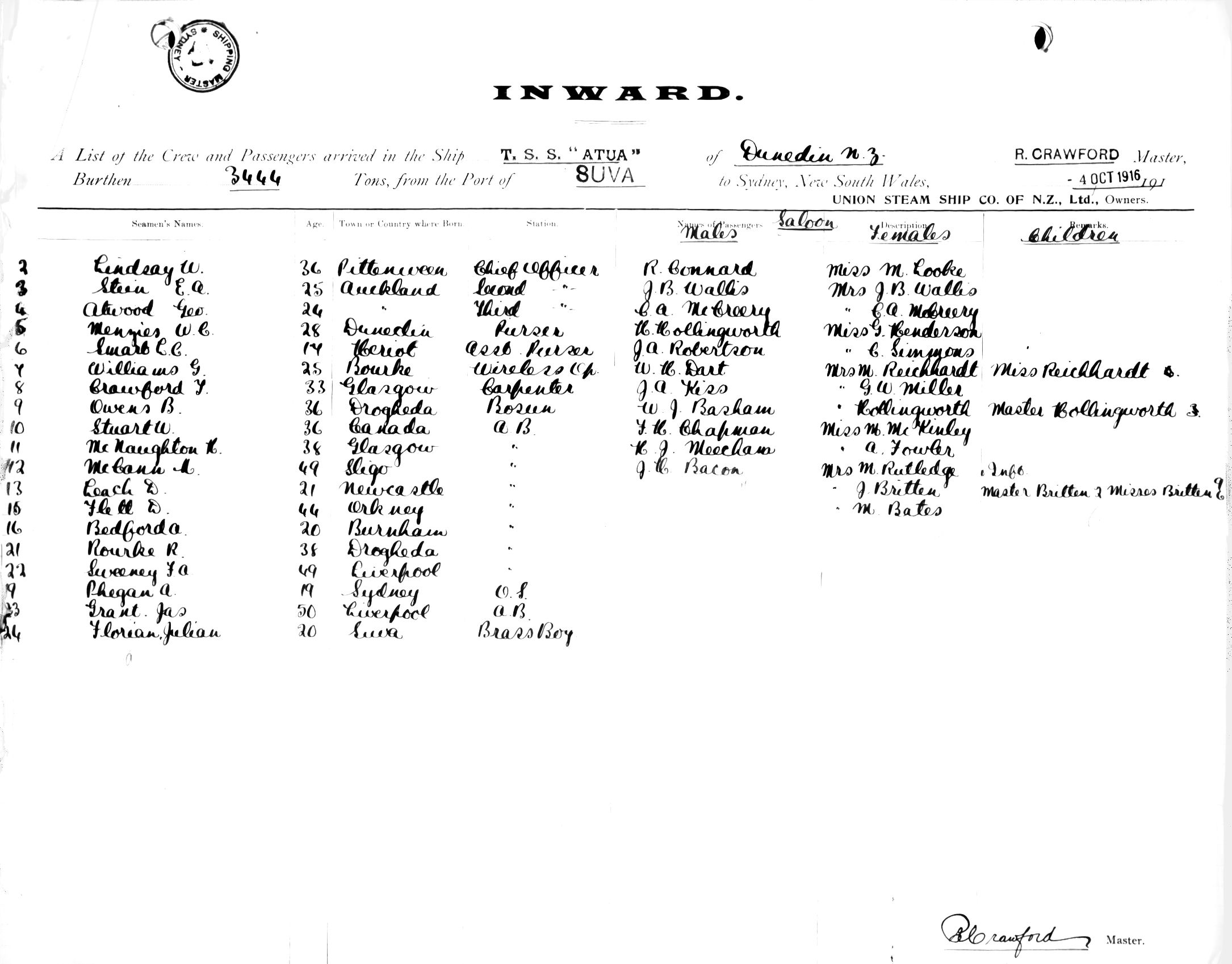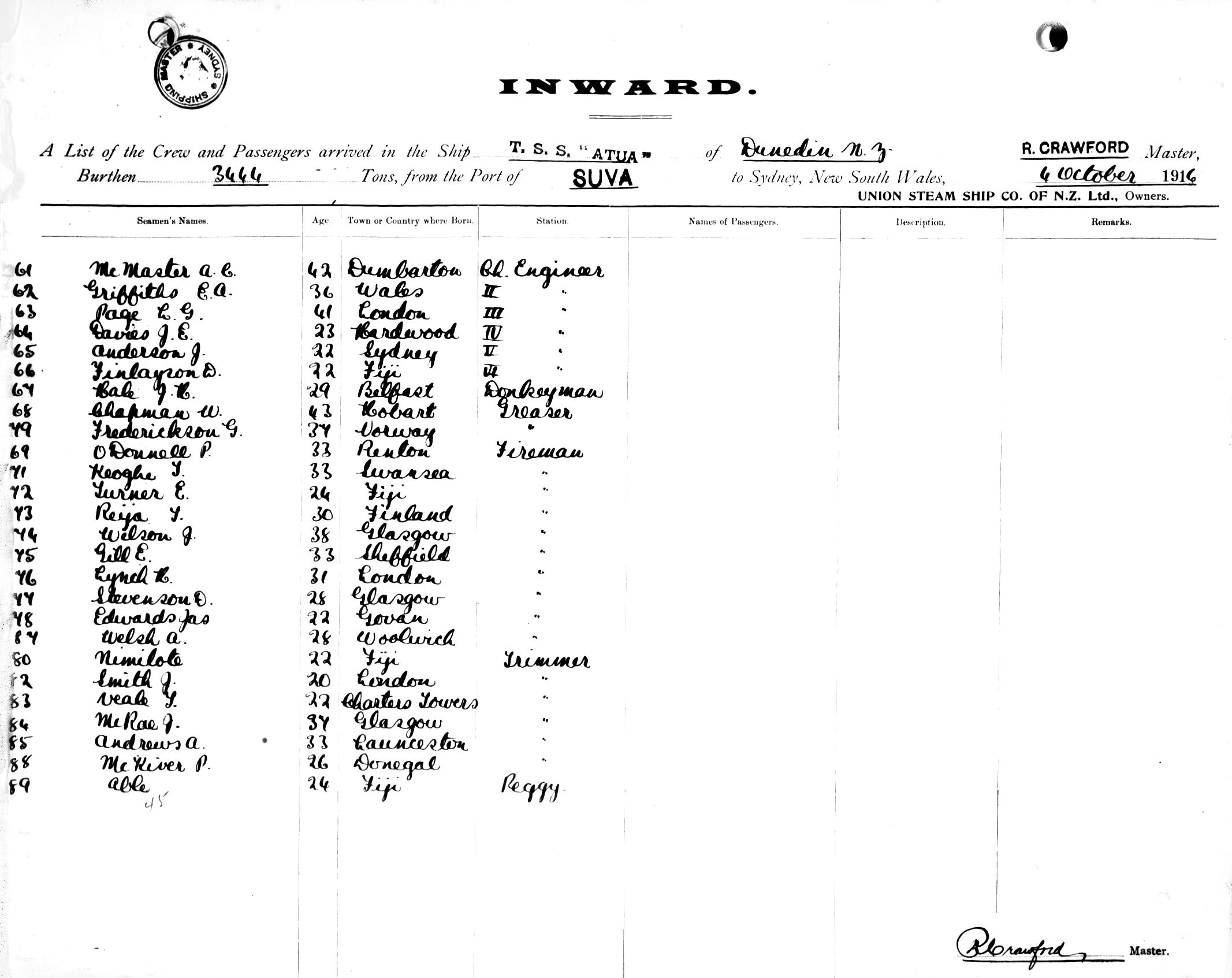 ATUAOF DUNEDIN, R. CRAWFORD, MASTER, BURTHEN 3444 TONS FROM THE PORT OF SUVA TO SYDNEY, NEW SOUTH WALES, 4TH OCTOBER 1916 |