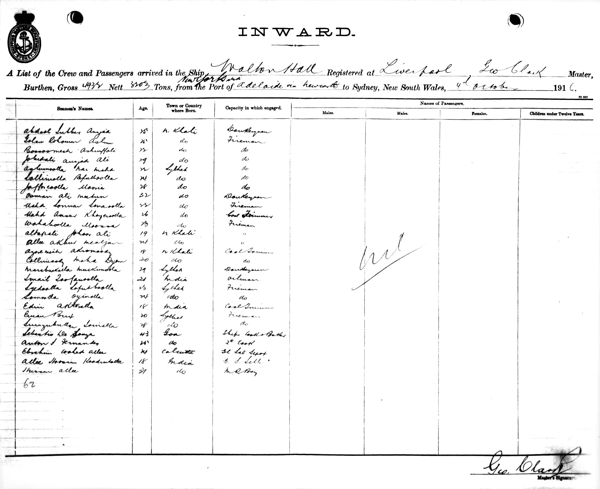 WALTON HALLOF LIVERPOOL, GEORGE CLARK, MASTER, BURTHEN 4932/3203 TONS FROM THE PORT OF NEW YORK via ADELAIDE & NEWCASTLE TO SYDNEY, NEW SOUTH WALES, 4TH OCTOBER 1916 |