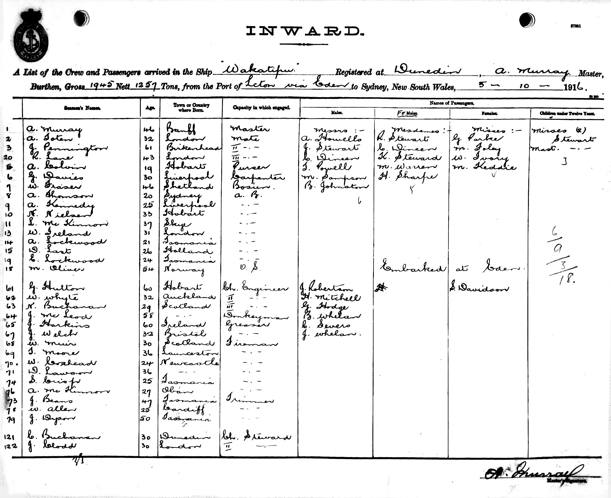WAKATIPUOF DUNEDIN, A. MURRAY, MASTER, BURTHEN 1945/1257 TONS FROM THE PORT OF LAUNCESTON via EDEN TO SYDNEY, NEW SOUTH WALES, 5TH OCTOBER 1916 |