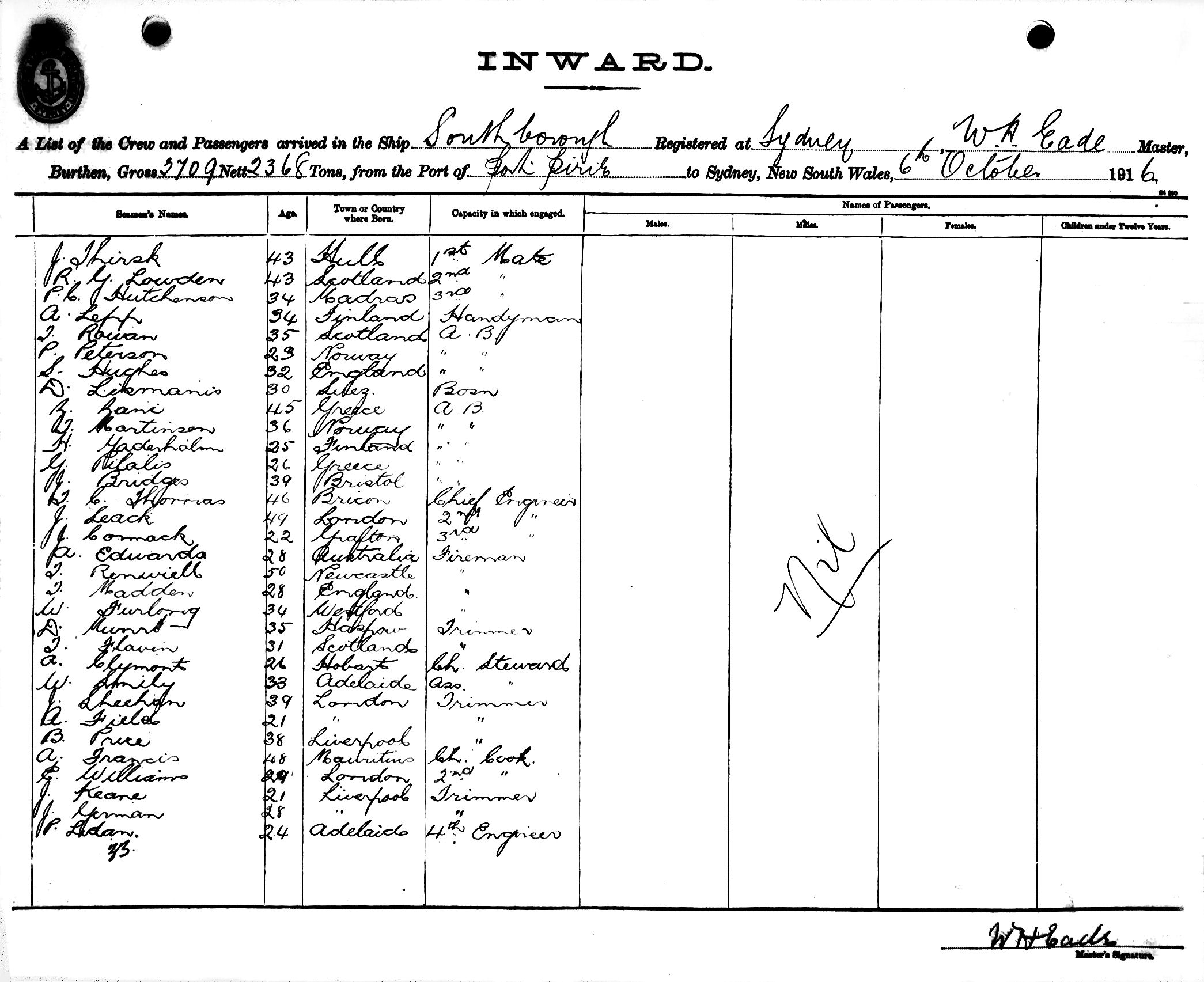 SOUTHBOROUGHOF SYDNEY, W. H. EADE, MASTER, BURTHEN 3709/2368 TONS FROM THE PORT OF PORT PIRIE TO SYDNEY, NEW SOUTH WALES, 6TH OCTOBER 1916 |