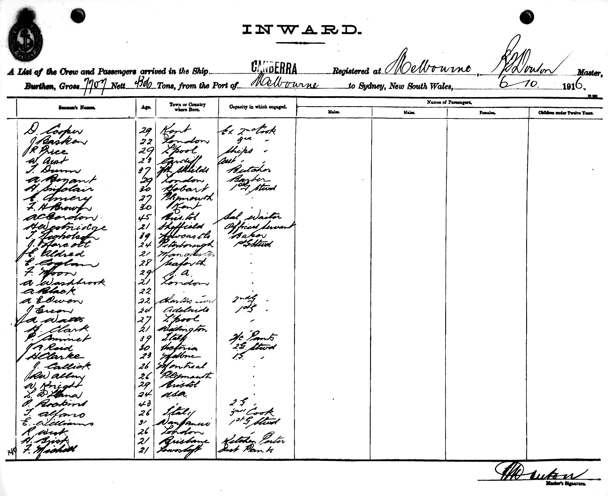 Mariners and ships in Australian Waters | CANBERRAOF MELBOURNE, R. F. DOUTON, MASTER, BURTHEN 7707/4306 TONS FROM THE PORT OF MELBOURNE TO SYDNEY, NEW SOUTH WALES, 6TH OCTOBER 1916 |